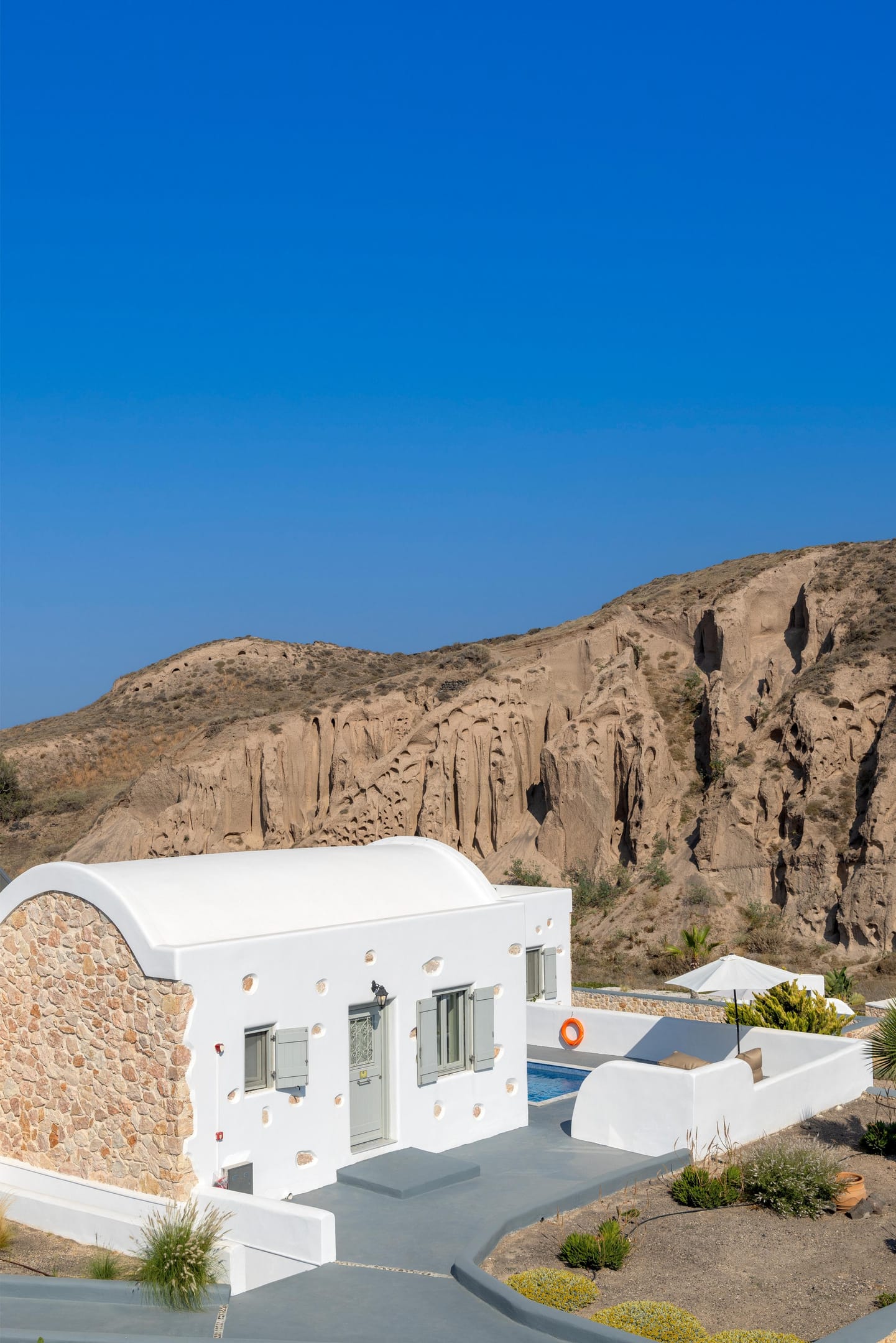 Villa Spirit White is divided into two levels, comprised of 3 luxurious bedrooms, which cover 125 sq. m. of opulence and comfort. As you enter inside, the ultimate insular opulence blending the Cycladic white, fine marbles, and wood welcomes you, all set skillfully in this spacious and luxuriously furnished living room, the ergonomic kitchen, and the cozy spot circling a fireplace. On the first floor, there is also a communal bathroom.
