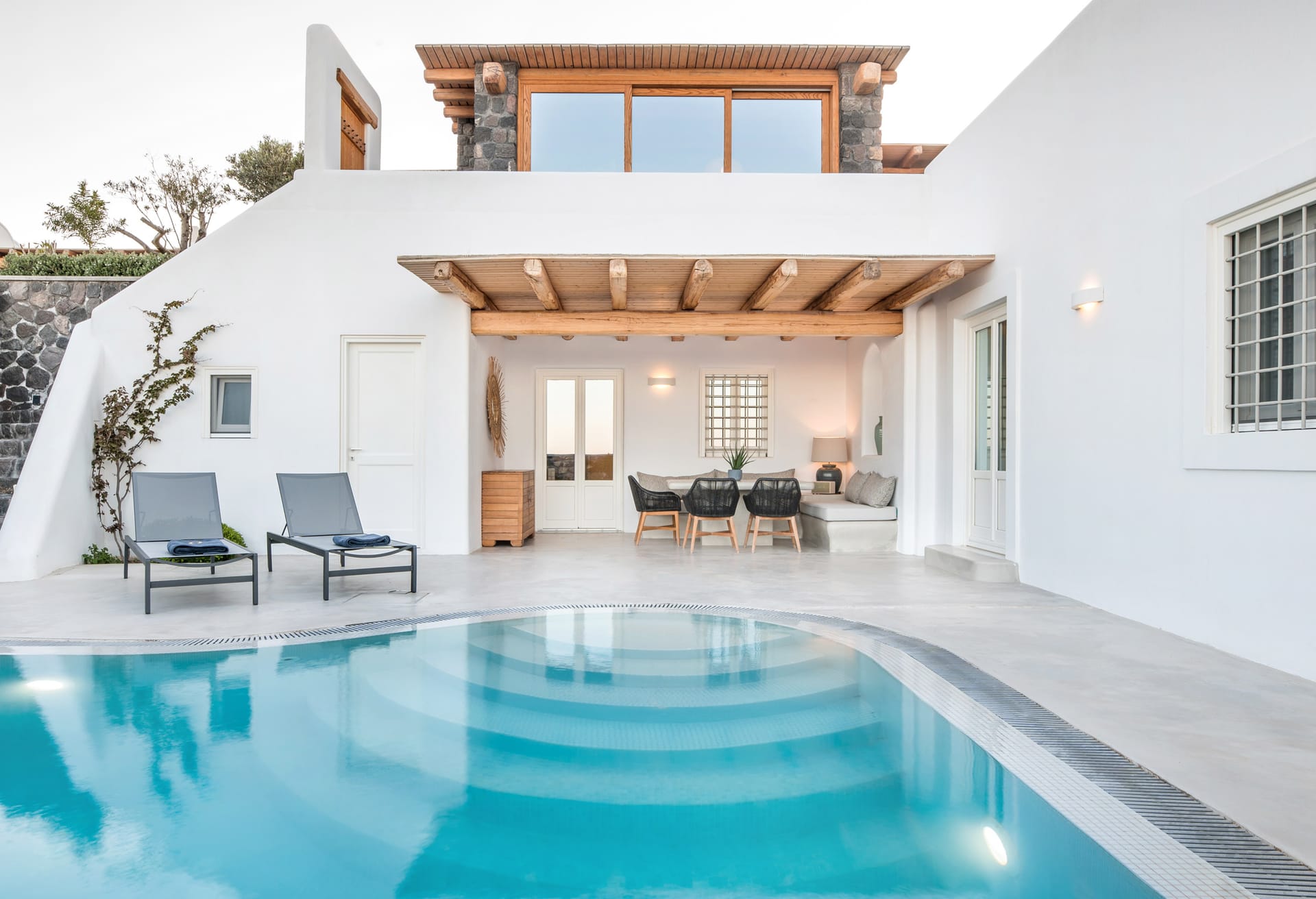 Maisonette Villa is located at the edge of the property, directly across from the complex's pool, offering unmatched convenience. Tastefully designed, this exquisite home is fully equipped for an unforgettable getaway. Its terrace boasts views of the pool, surrounded by the vibrant Mediterranean gardens of the complex. Ideal for couples or small families with a young child, this standalone villa provides a tranquil escape where guests can soak in the charm of a luxurious Greek summer by the pool.