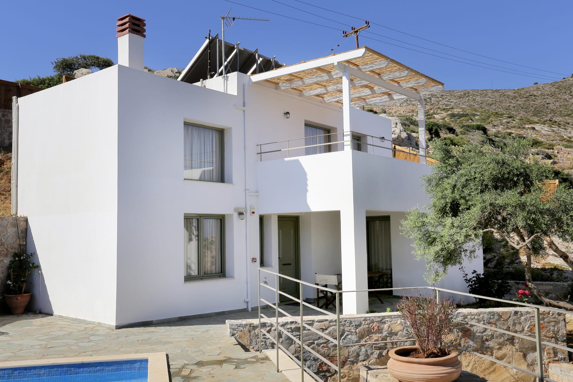 This marvelous villa is embraced by beautifully landscaped gardens adorned with lush trees, vibrant plants, and colorful flowers. Guests can unwind and savor a serene, private retreat, creating unforgettable moments of relaxation during their holiday. From the villa, the breathtaking view spans the sparkling pool, the verdant gardens, and the stunning Aegean Sea. Designed for convenience and exclusivity, the villa features its own private entrance and offers open parking for two vehicles.