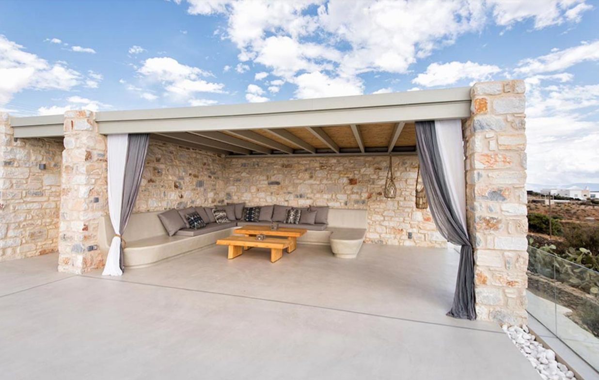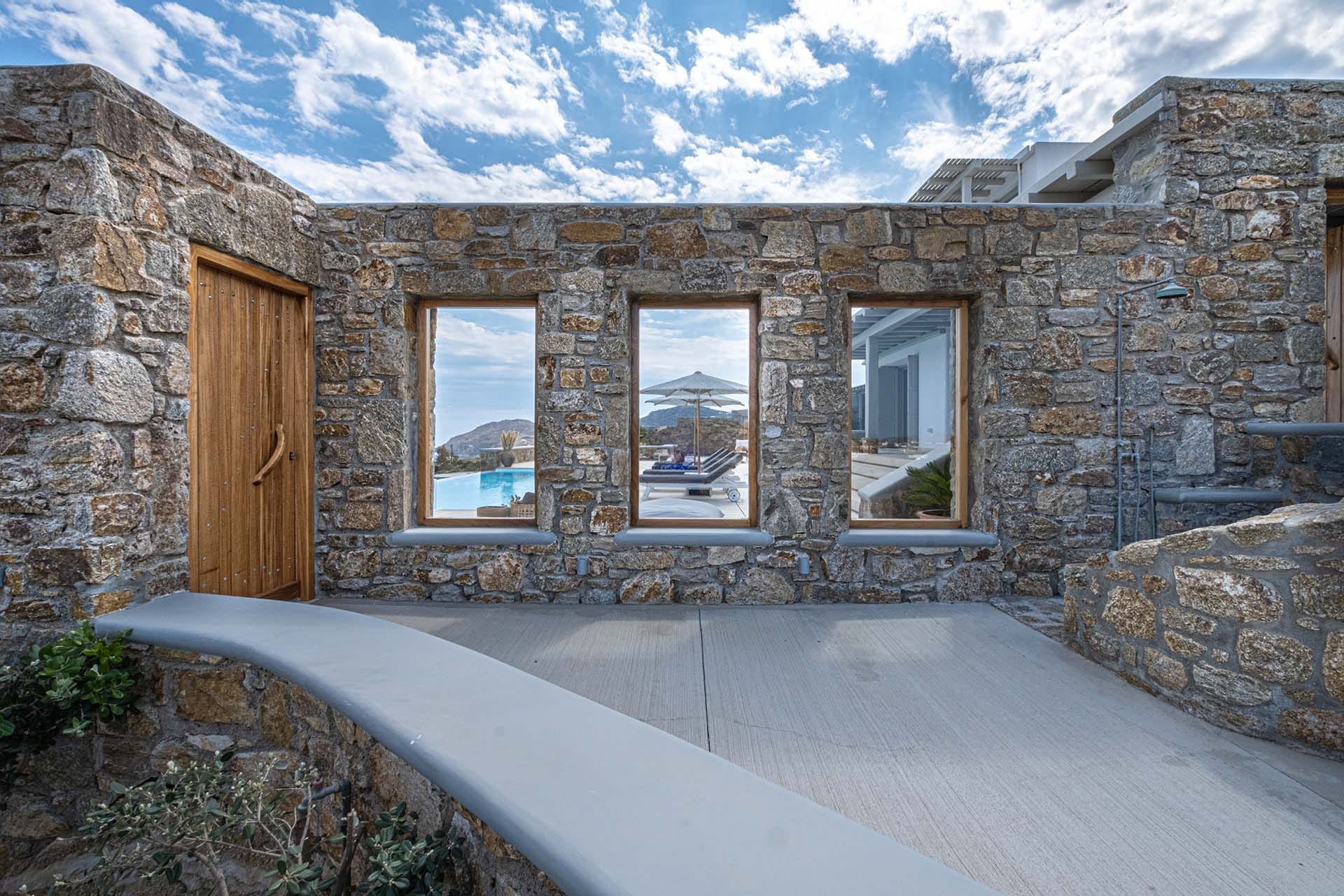 Simultaneously evoking rough and smooth aesthetics, the structures were infused with a mix of a warm ivory and Corfiot earth color concrete and traditional stones of the island that together with the geometric lines resulting in an effortless connection with nature.