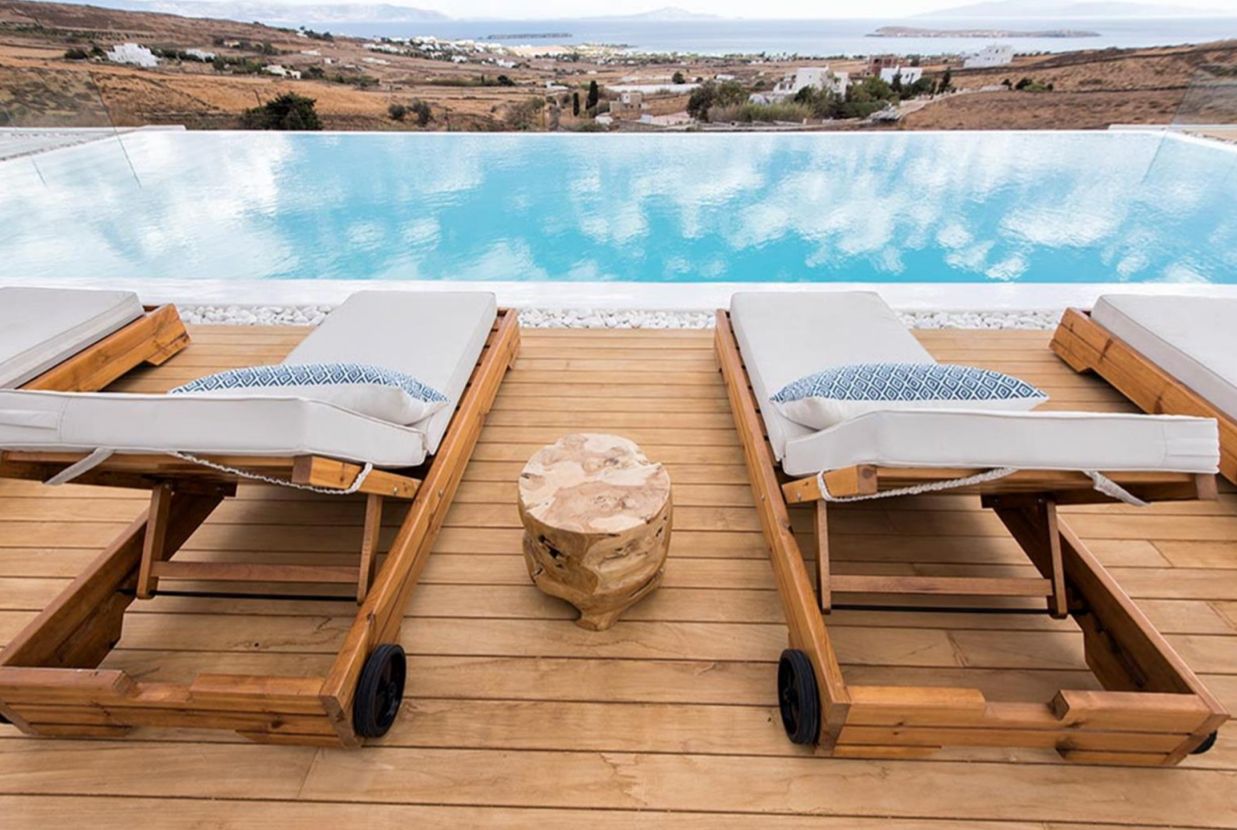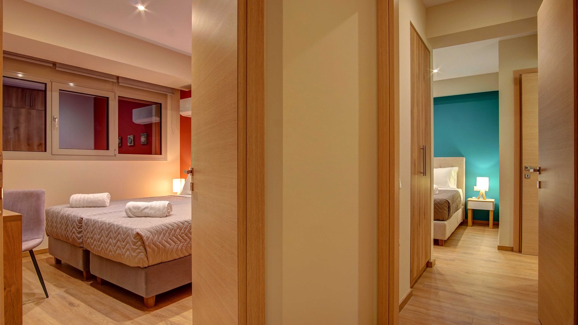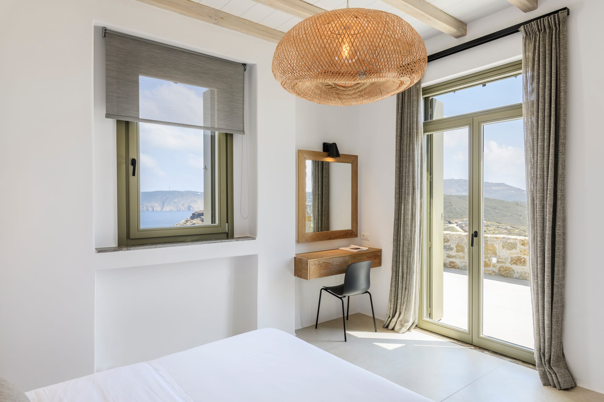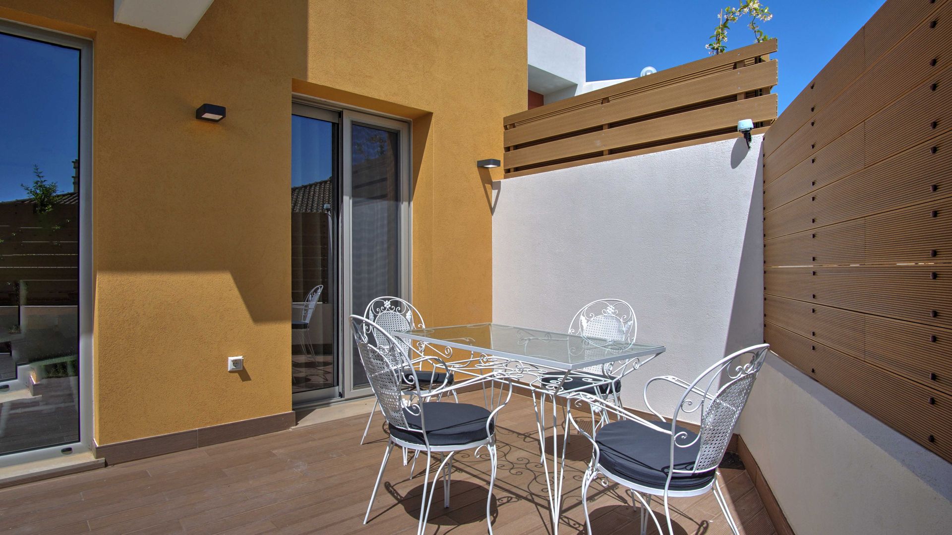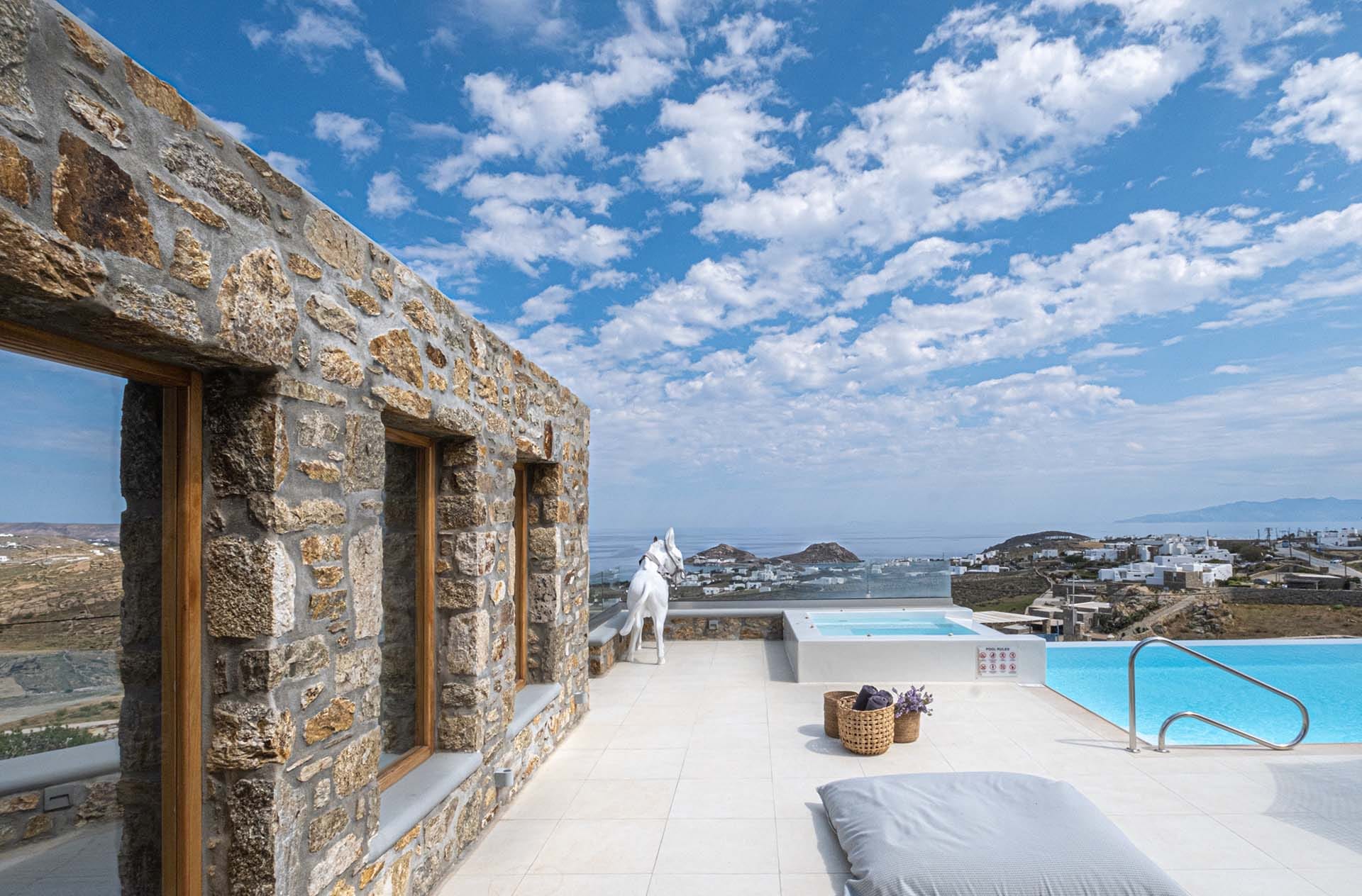 The interior areas are designed in a minimal style with boho touches and wooden furnishing. The maisonette style offers a sense of extended space of two levels, with two bedrooms on the first-floor level and a fully equipped open plan kitchen with dining area and spacious living room with pool view, being ready to offer you moments of relaxation and amusement. The two bedrooms can accommodate four persons comfortably and are equipped with comfortable double beds and ensuite bathrooms with shower, offering elegance with the wooden decorations and touches, both have private balconies. A sofa bed in the living room can accommodate an extra person.
