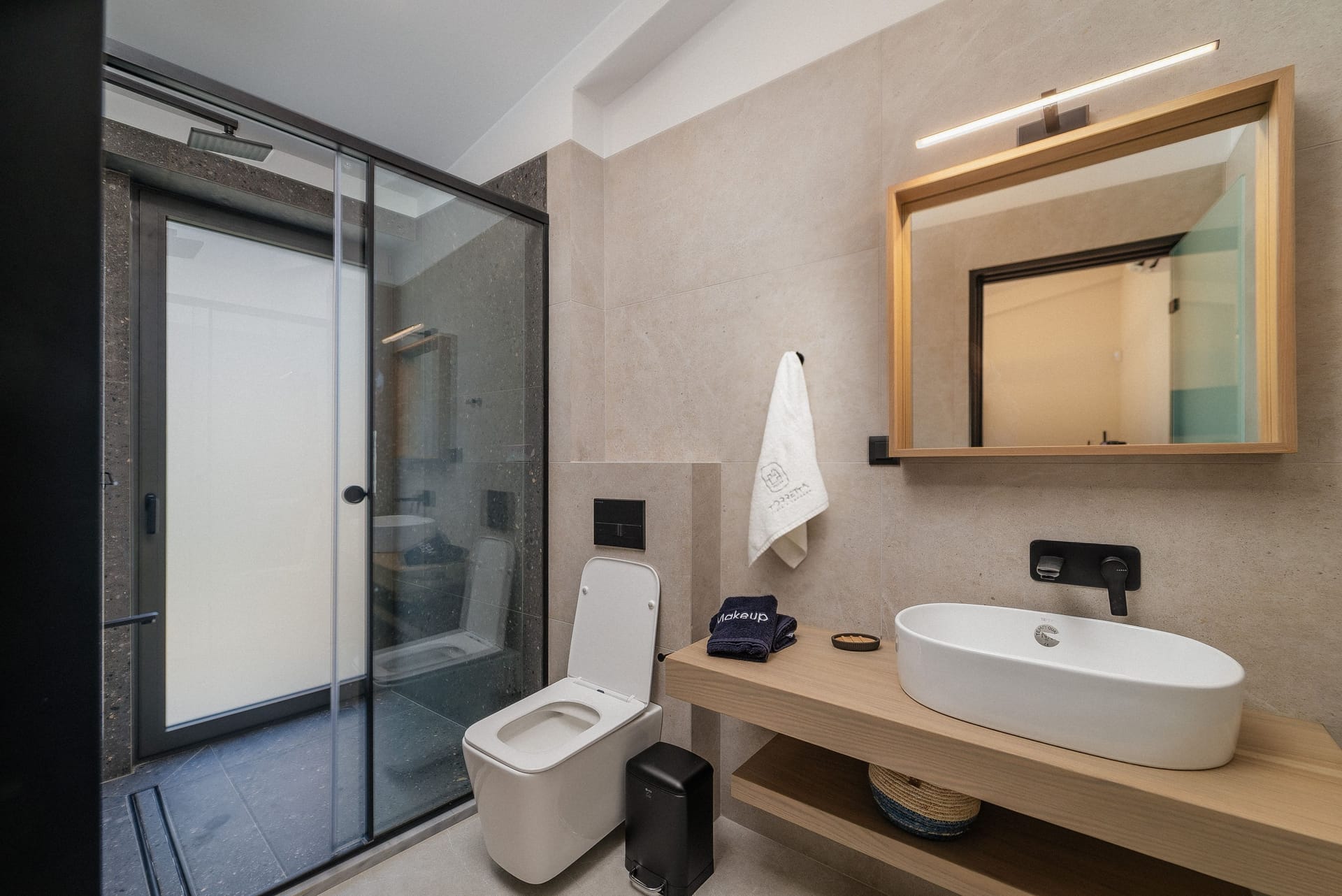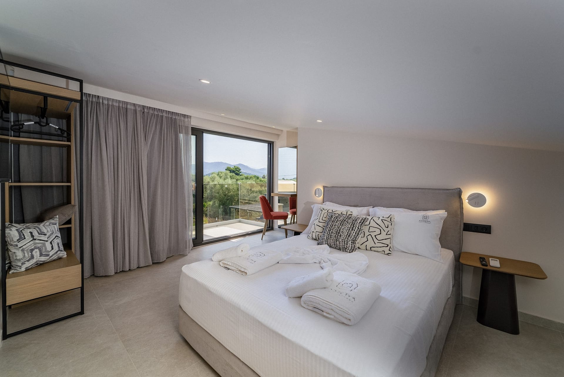 Both bedrooms are composed of a double bed measuring 160x200cm for ccomfortable sleeping, boudoir with a mirror for your self-care routine that can be used as an office, an open closet with storage compartments, Smart TV 32 inches, private bathroom with a waterfall shower, designer self-care products and a private terrace with a table and chairs and a garden view.