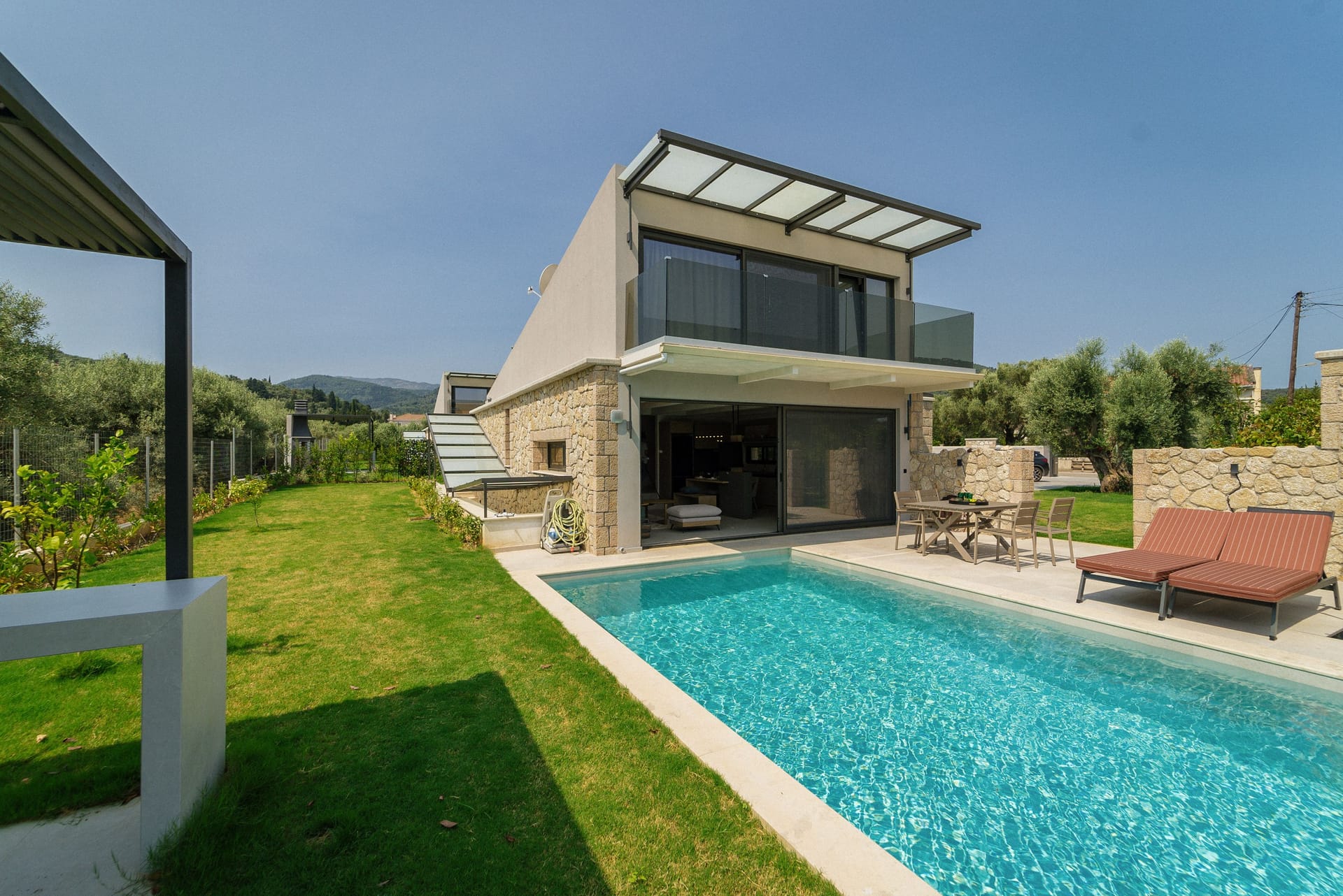 The second level communicates with the outdoor space that hosts the magnificent pool and the beautiful garden. Cool off and play in the pool water, and afterwards enjoy the sun as you relax on the comfortable beach loungers, at the dining table, or on the grass. Seek shade under the well-tended olive trees and garden plants.