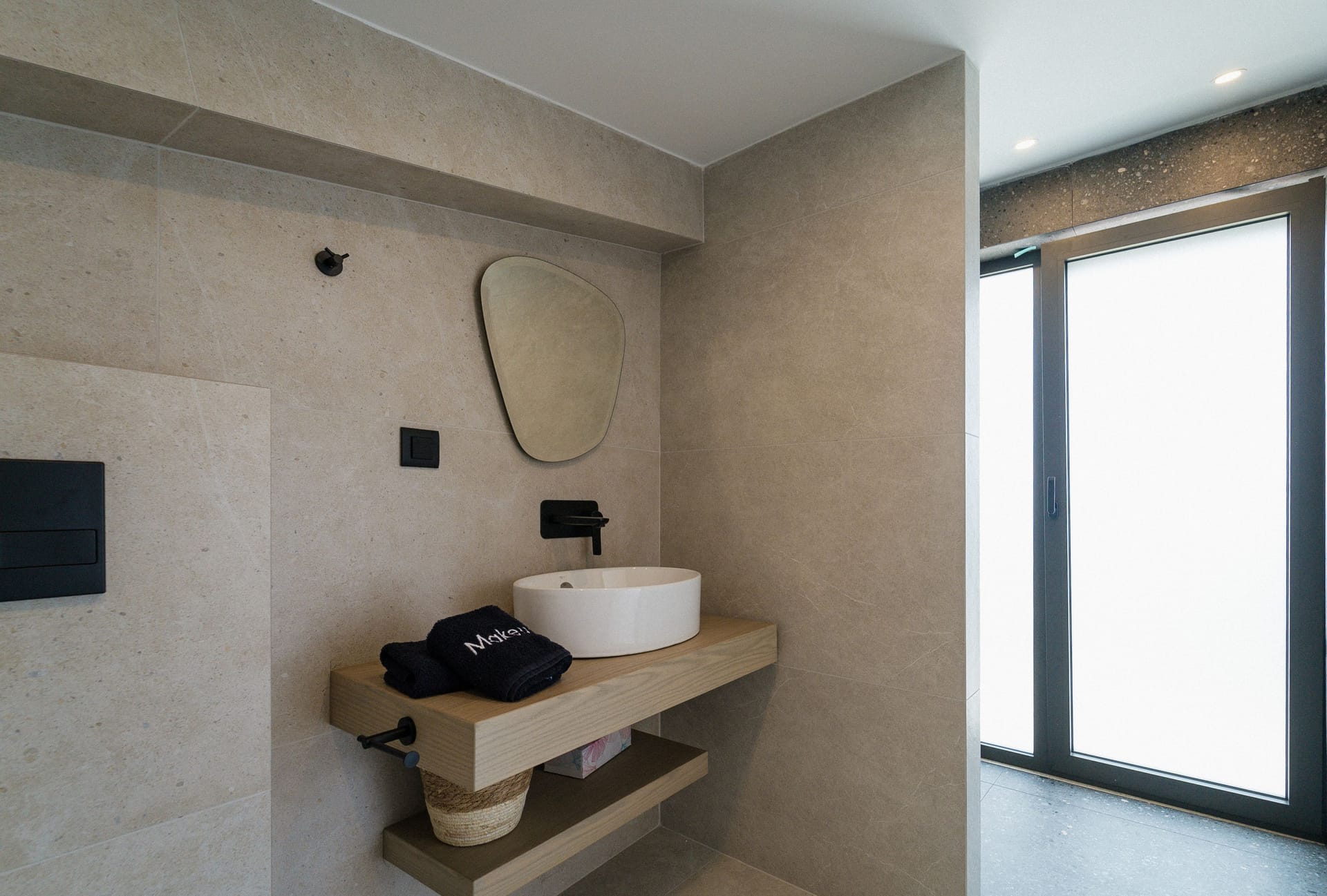 The bedroom area is composed of 2 single beds that can be converted into double beds, a boudoir with a mirror that can be used as an office, an open closet with storage compartments, a smart TV 32inches and an en-suite bathroom with a waterfall shower and designer self-care products.
