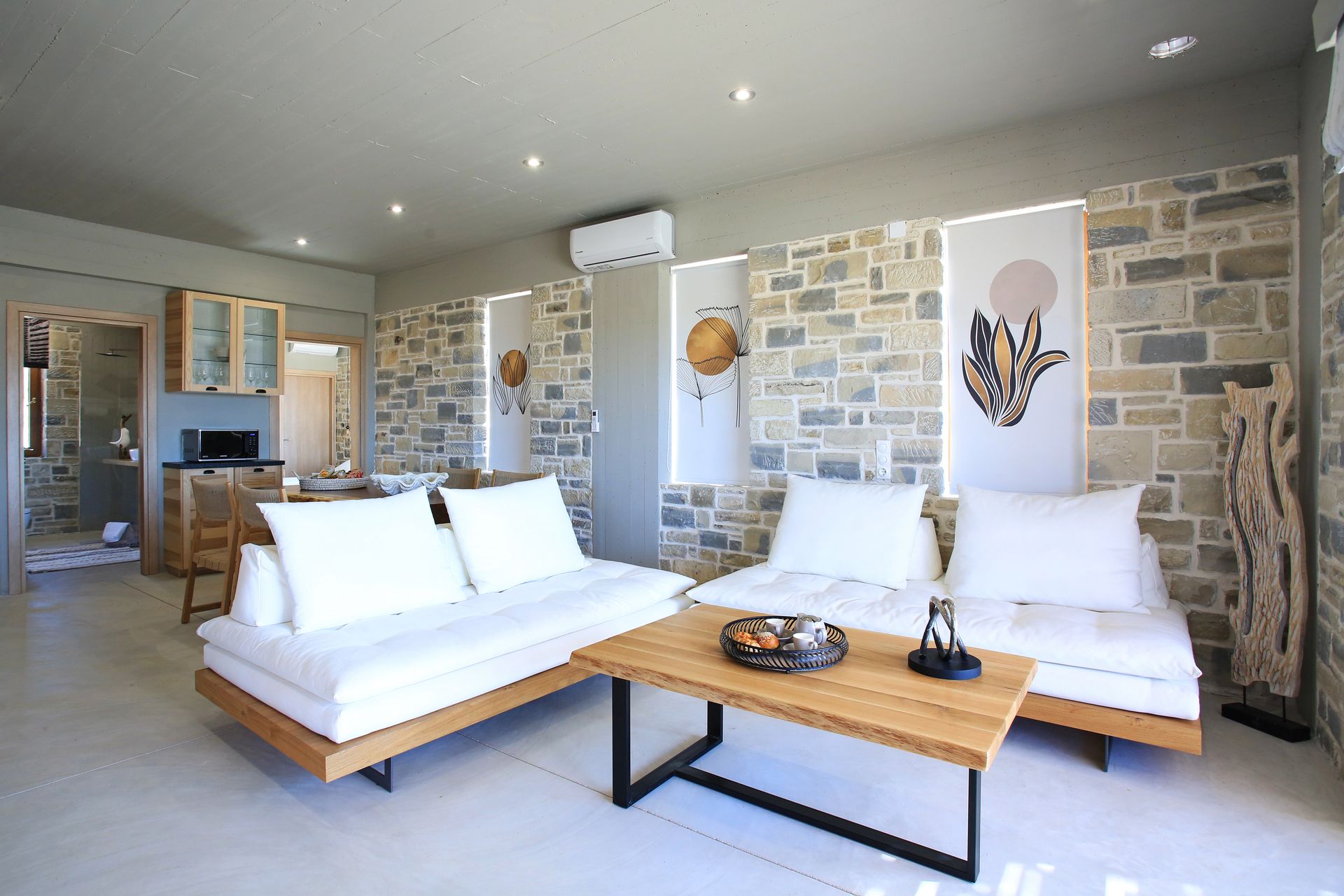 - Spacious Living Areas: The villa features an expansive living room, beautifully furnished with a blend of modern and traditional Greek decor, providing ample space for relaxation and entertainment.