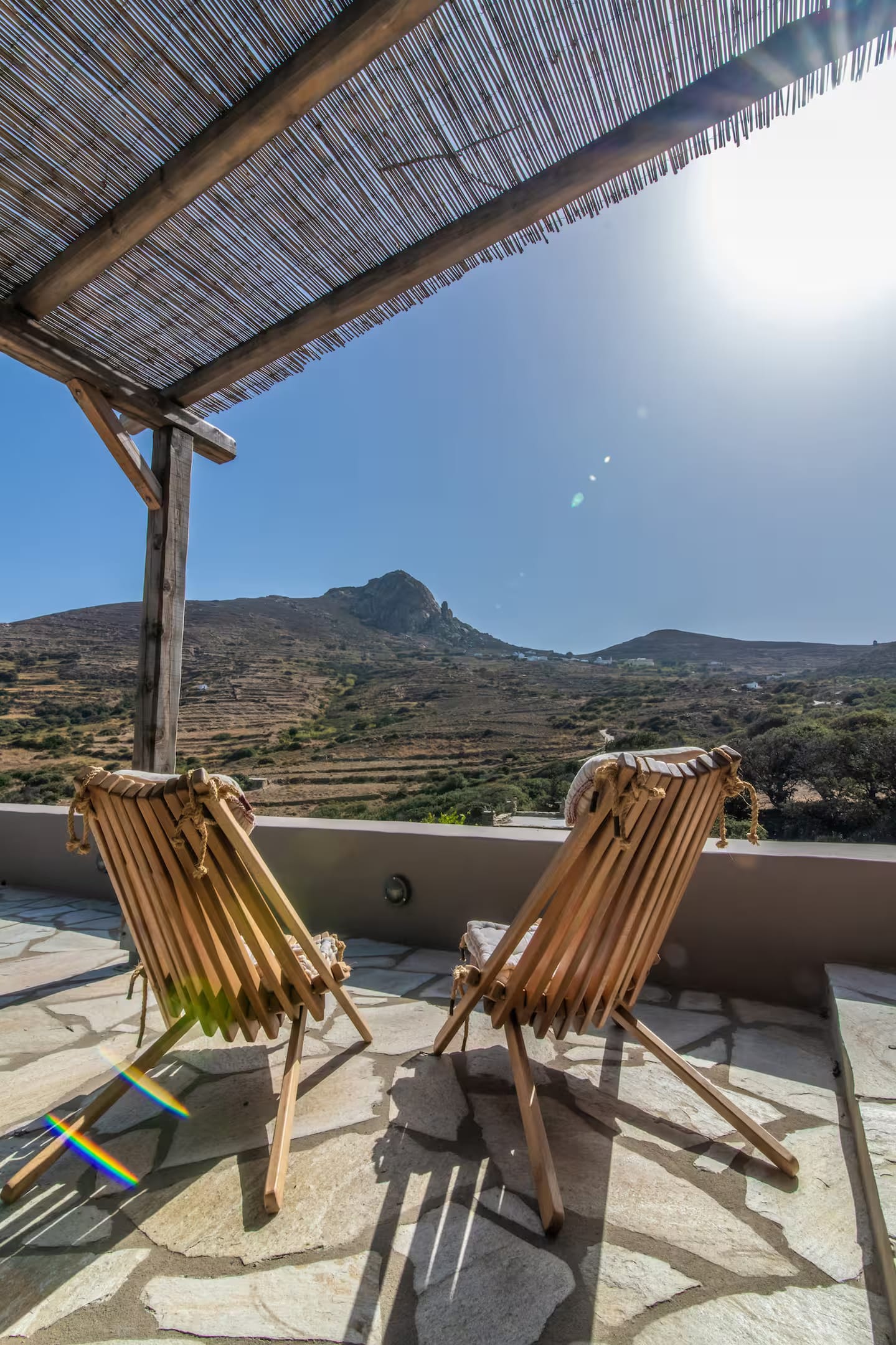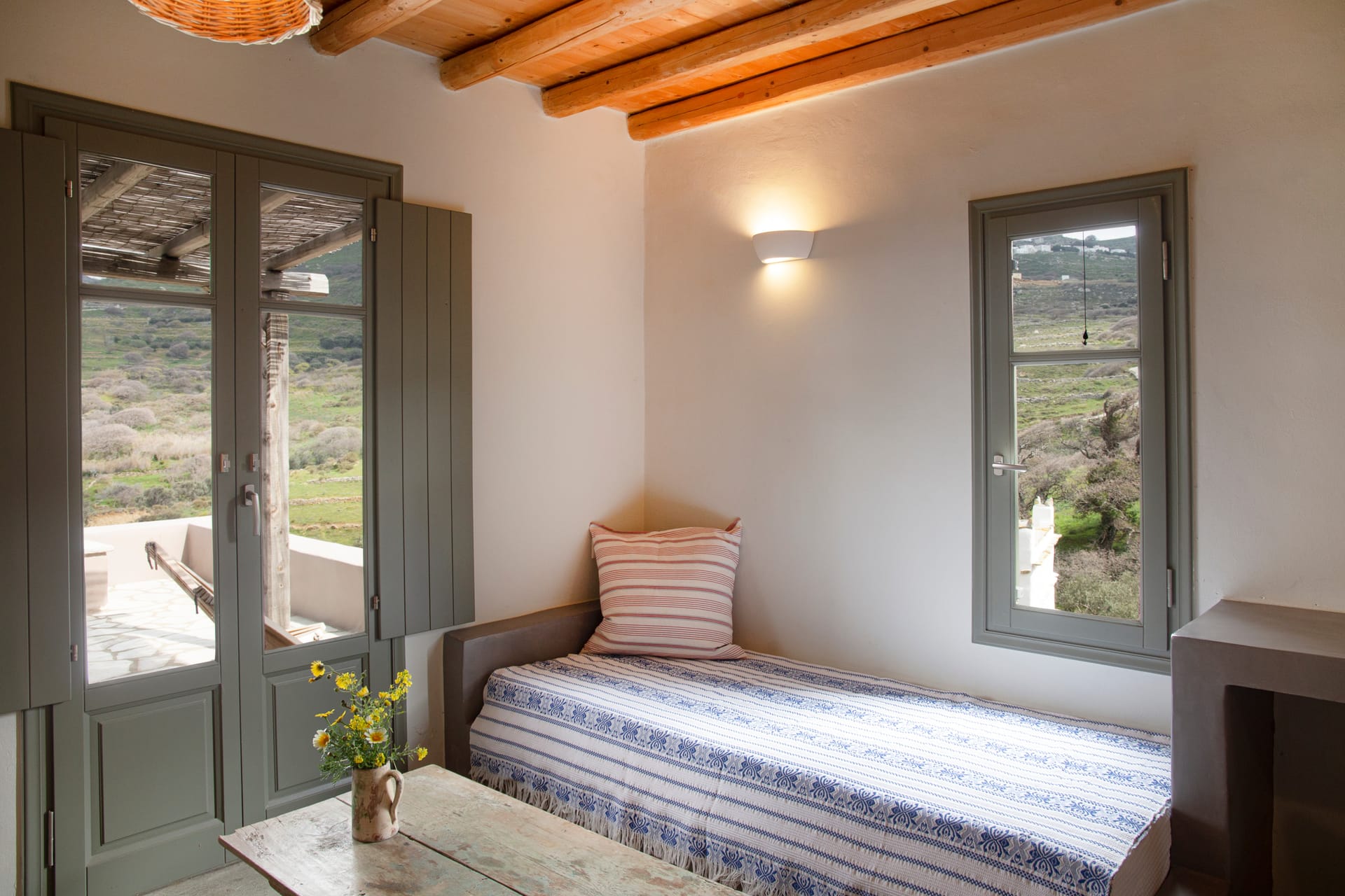 Oak is a a self-contained studio above Olive, with a king-size bed and sofa bed that can accommodate up to 3 people. Wooden shuttered doors open up to a patio shaded by an old oak tree with a lovely view of the hill of Exombourgo and the villages of Xinara and Loutra. Just below is a pigeon house, one of the most characteristic features of Tinos architecture.