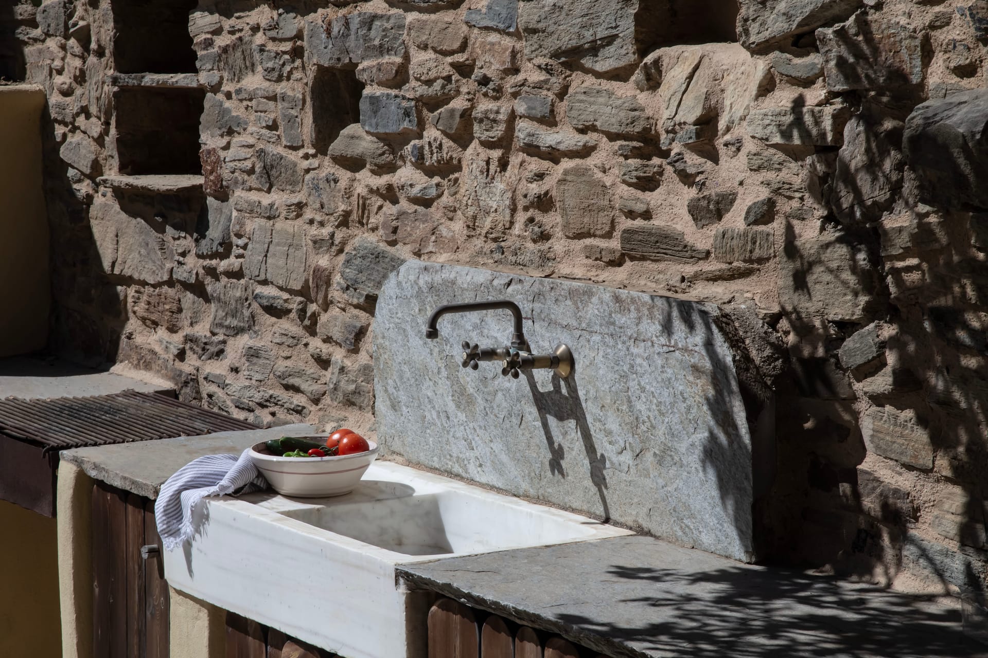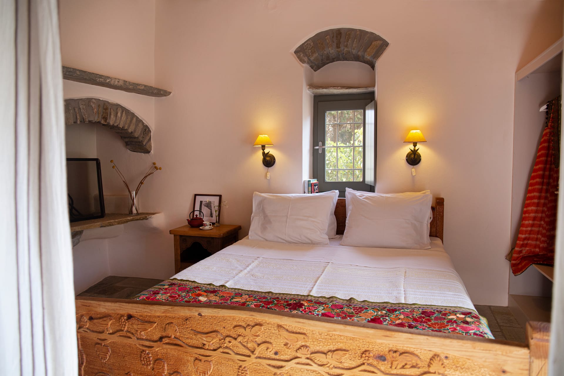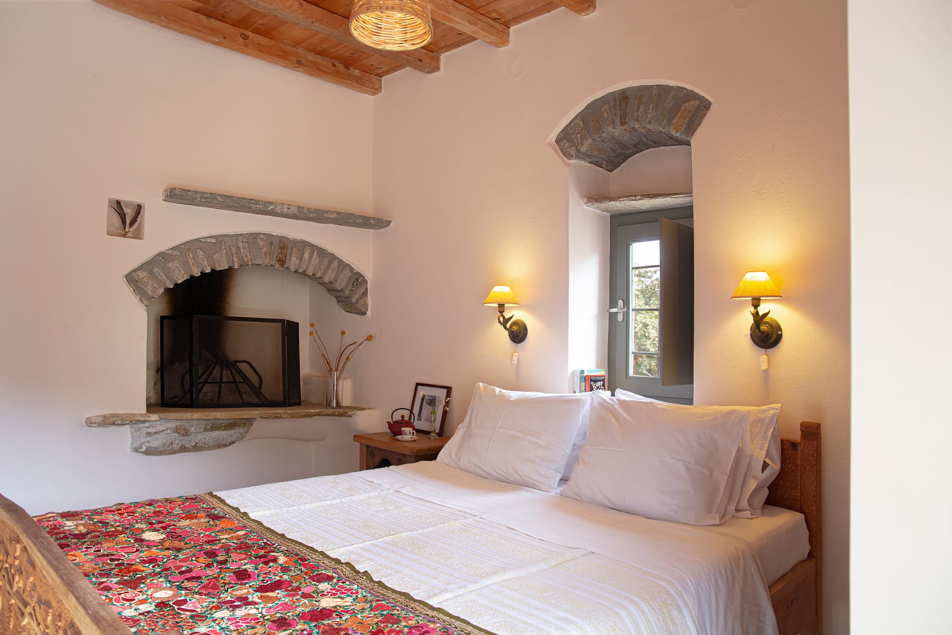 Used as a nun’s retreat a century ago the renovated cottage has a bedroom with a queen-size bed with a raised fireplace, an open-plan kitchen / living room with a sofa-bed. The bathroom is a few steps down. The cottage has a covered shaded patio and a large outdoor cooking / dining area with wood-burning oven and barbecue.