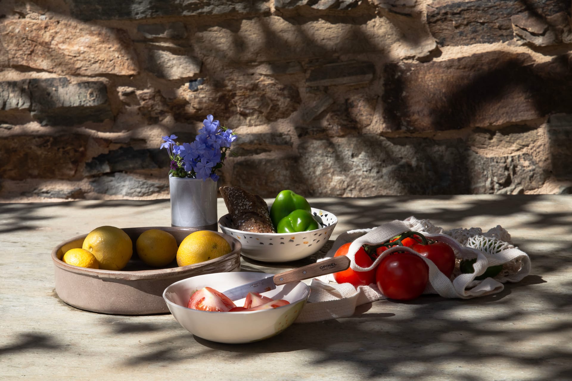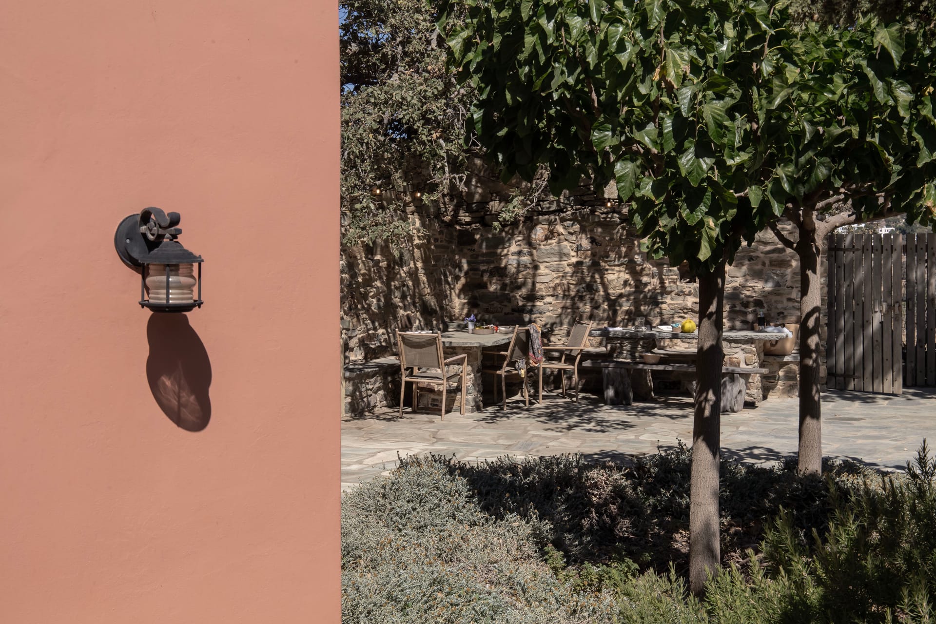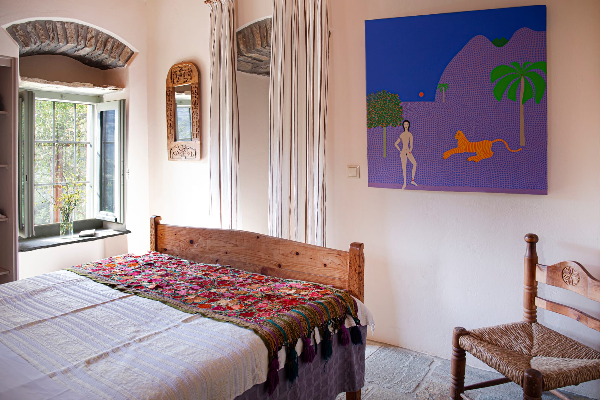 Used as a nun’s retreat a century ago the renovated cottage has a bedroom with a queen-size bed with a raised fireplace, an open-plan kitchen / living room with a sofa-bed. The bathroom is a few steps down. The cottage has a covered shaded patio and a large outdoor cooking / dining area with wood-burning oven and barbecue.