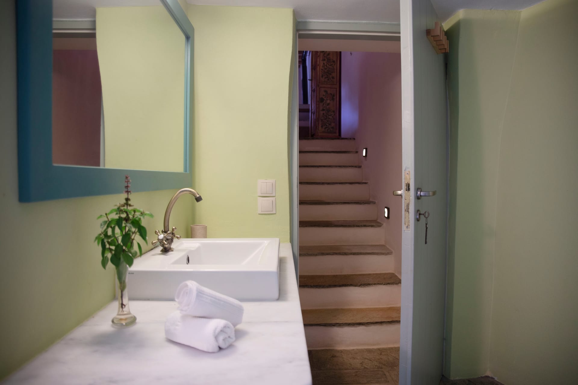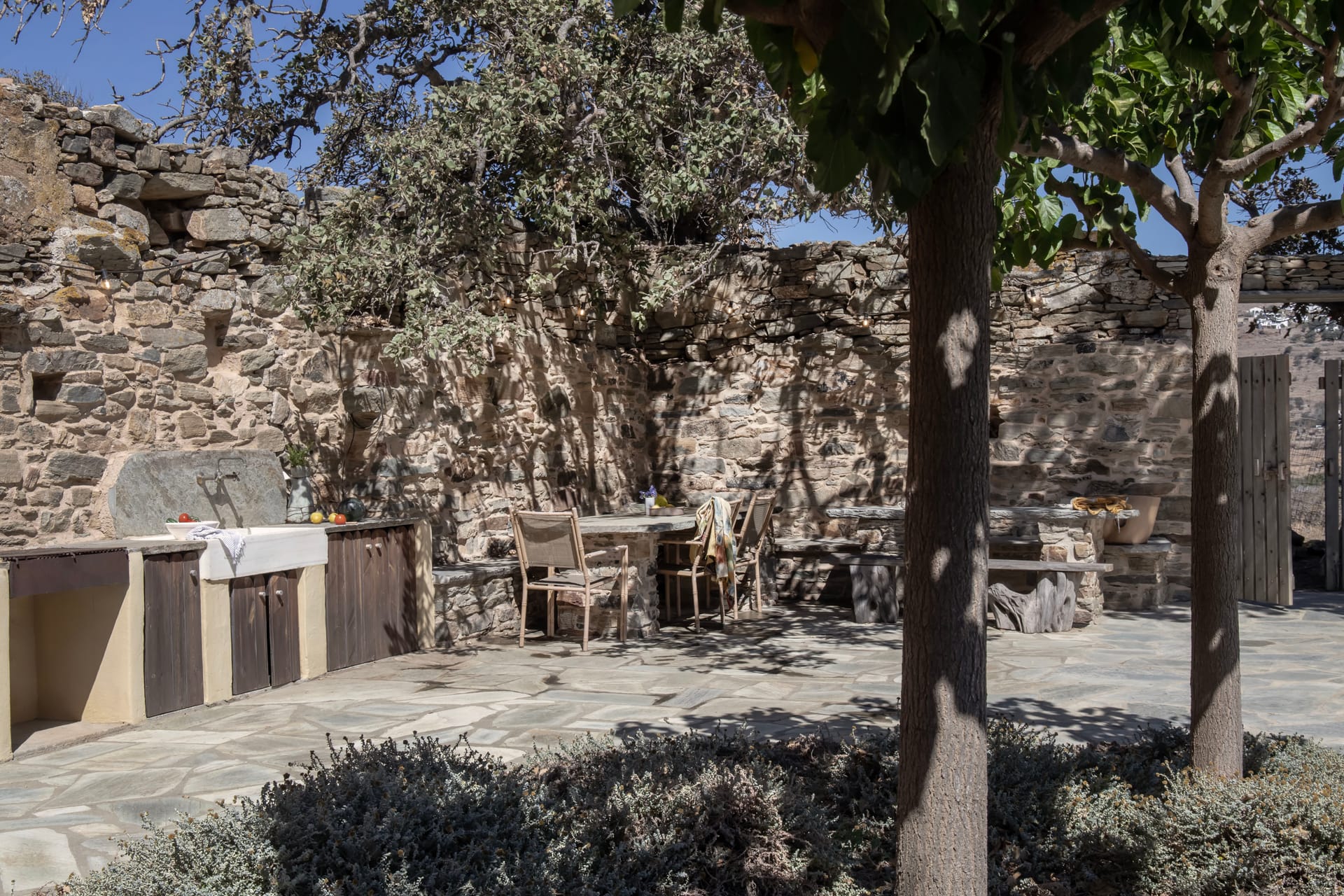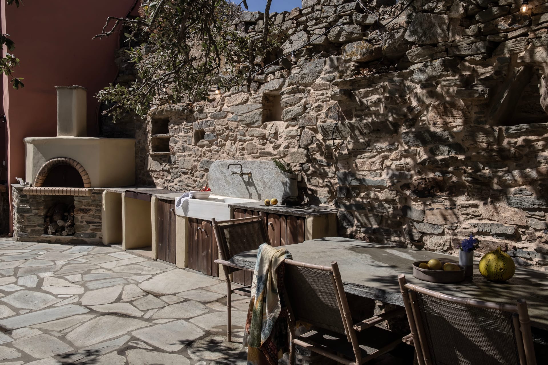 Within a secret orchard of orange, pear and plum trees, the Orange Grove Cottage features a lily pond with gold fish and an outdoor cooking / dining area, with views to the imposing granite hill of Exombourgo.