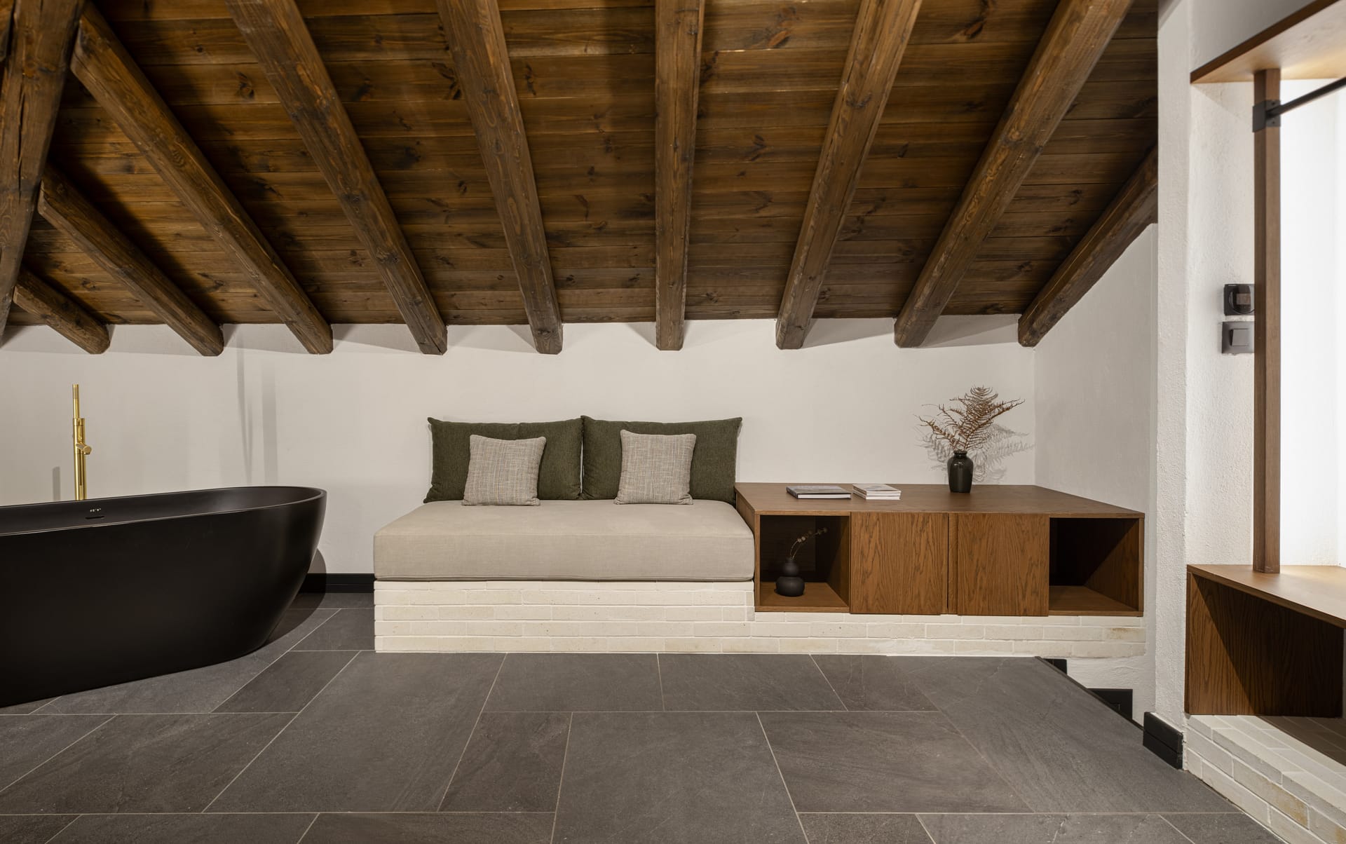 Comfort, discretion, ergonomics. Architectural tradition meets the most modern facilities. The result? An enjoyable stay. The suite is developed on two levels: the lower one, open and welcoming, and the upper one, discreet and private. On the ground floor, the living room invites you with its simplicity and warmth. Upstairs, the wood details and even the bathtub inside the bedroom all give a special romantic tone. On both levels, the light is abundant, and the views are exceptional – a view you can also enjoy while relaxing in the outdoor hot tub.