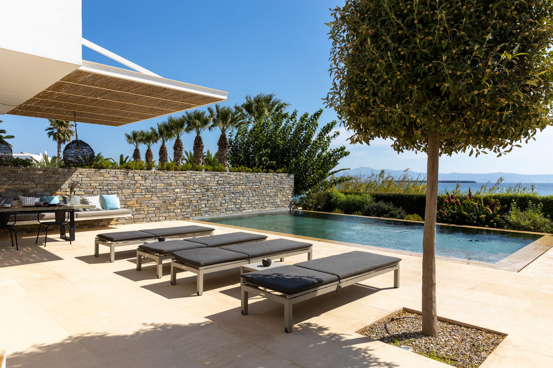 The villa’s outdoor spaces are designed for relaxation and privacy: