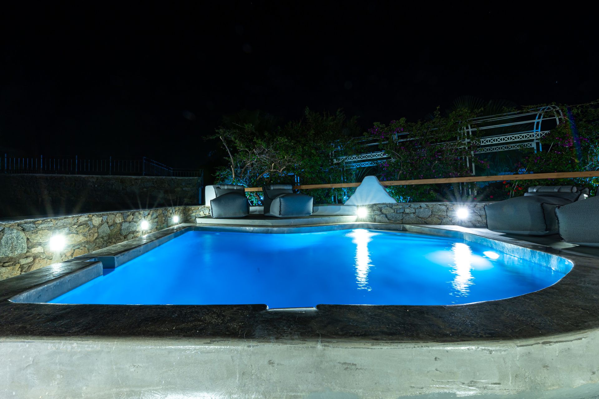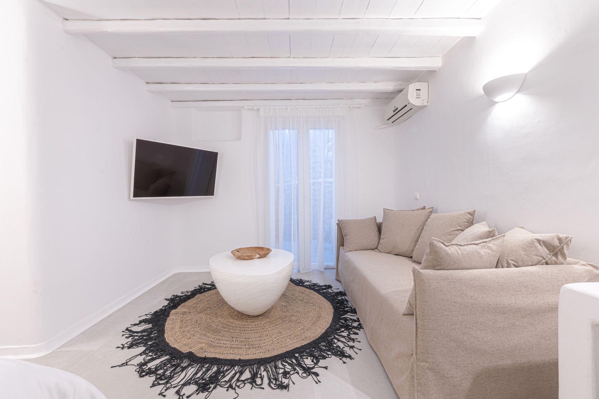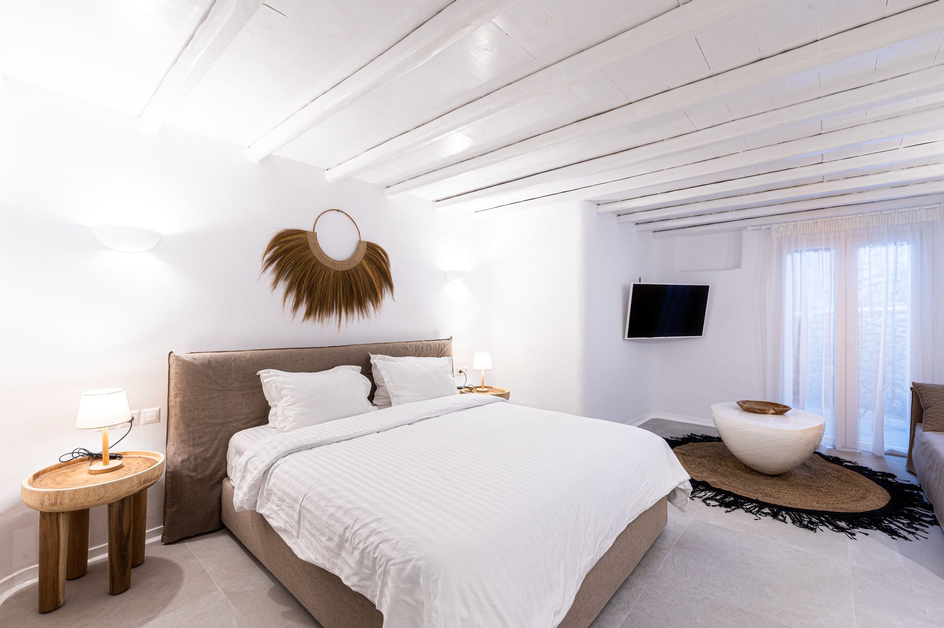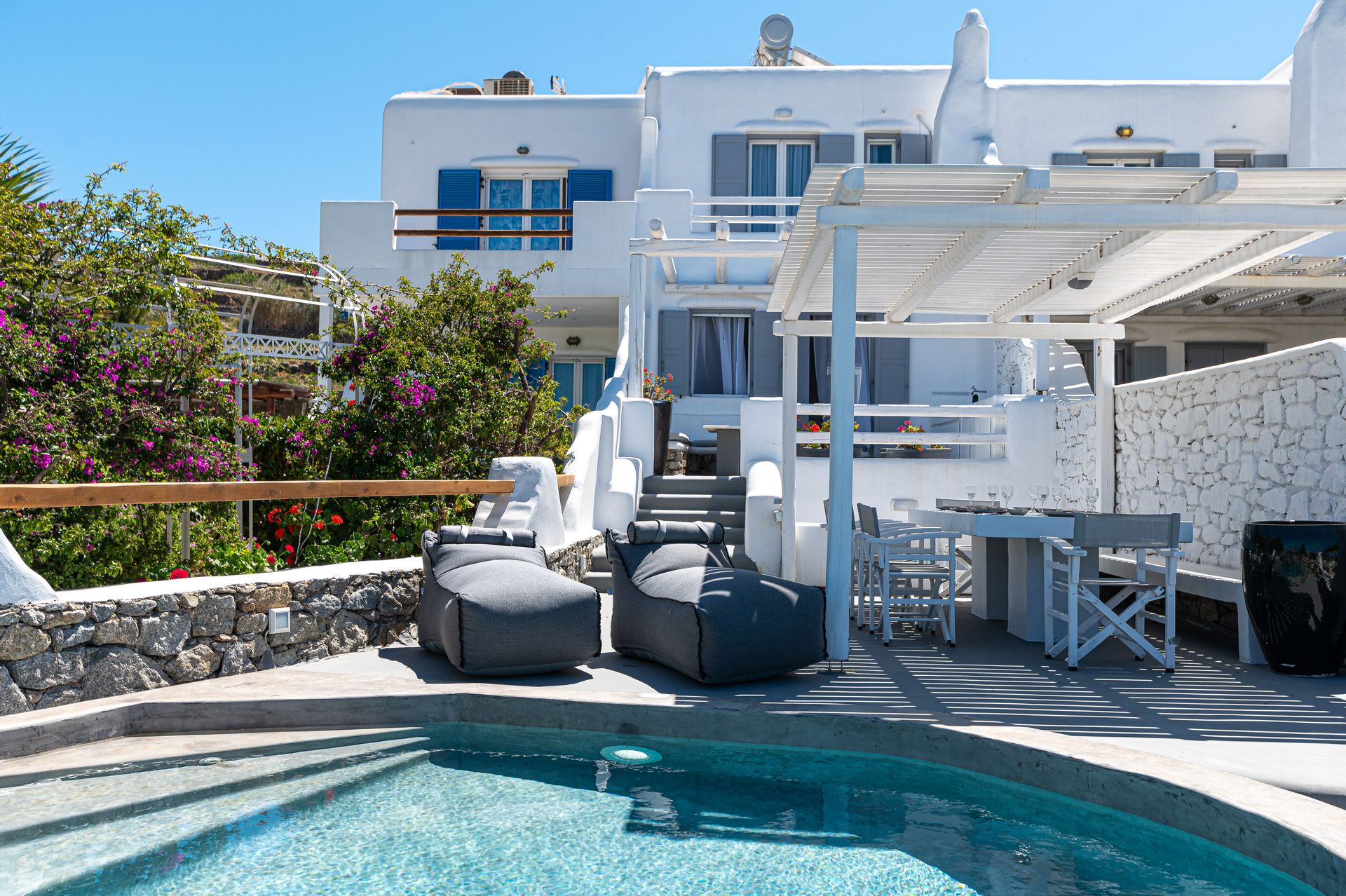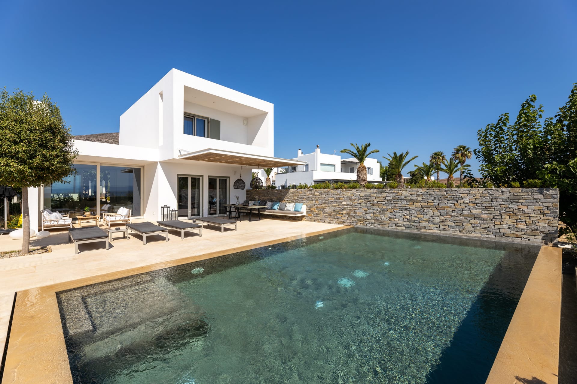 Renovated in 2021, the villa blends traditional Mykonian design—whitewashed walls, marble floors, wooden beams, and built-in furnishings—with modern comforts. Its idyllic setting is enhanced by a 12 sq.m. private pool, lush gardens, and expansive outdoor spaces designed for relaxation and recreation.
