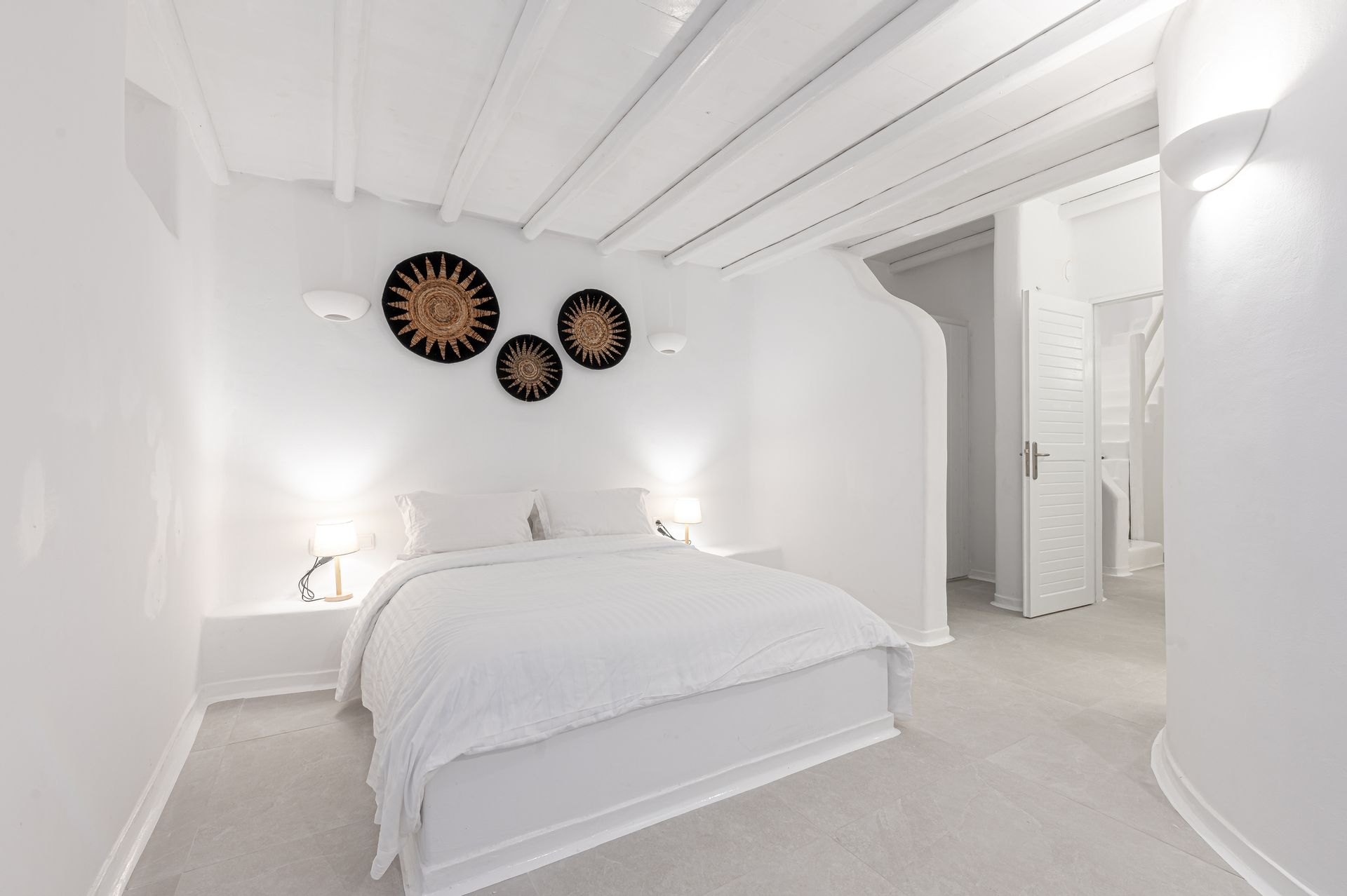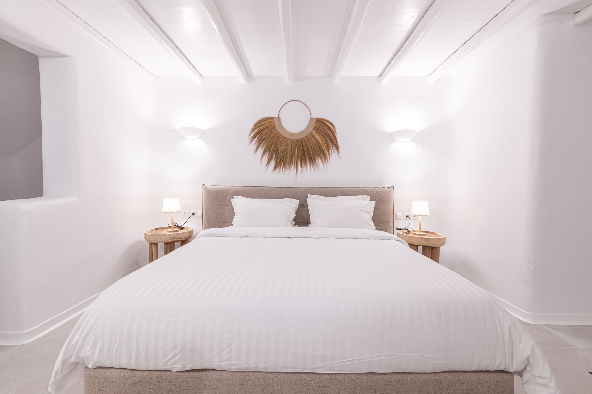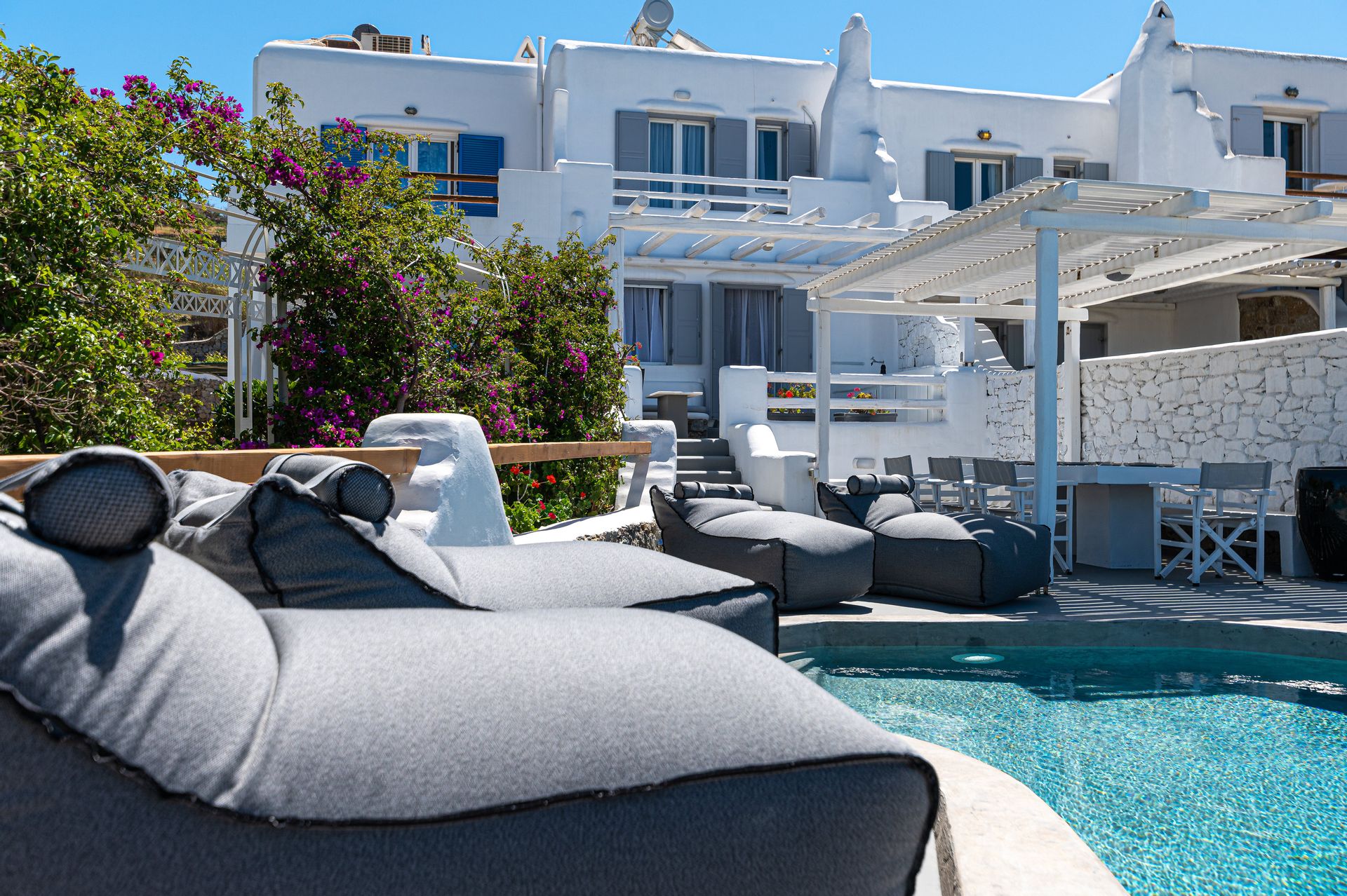 🏛️ White plaster, local stone, built-in couches, and wooden pergolas intertwined with Cycladic arches