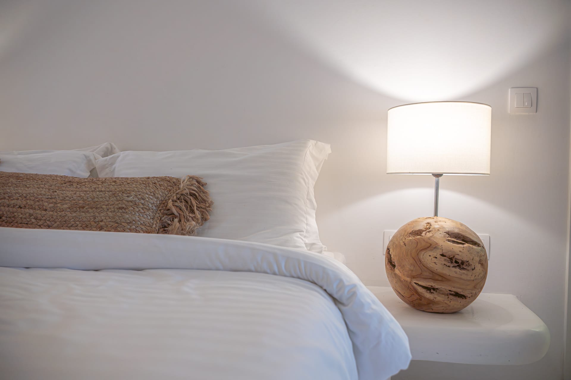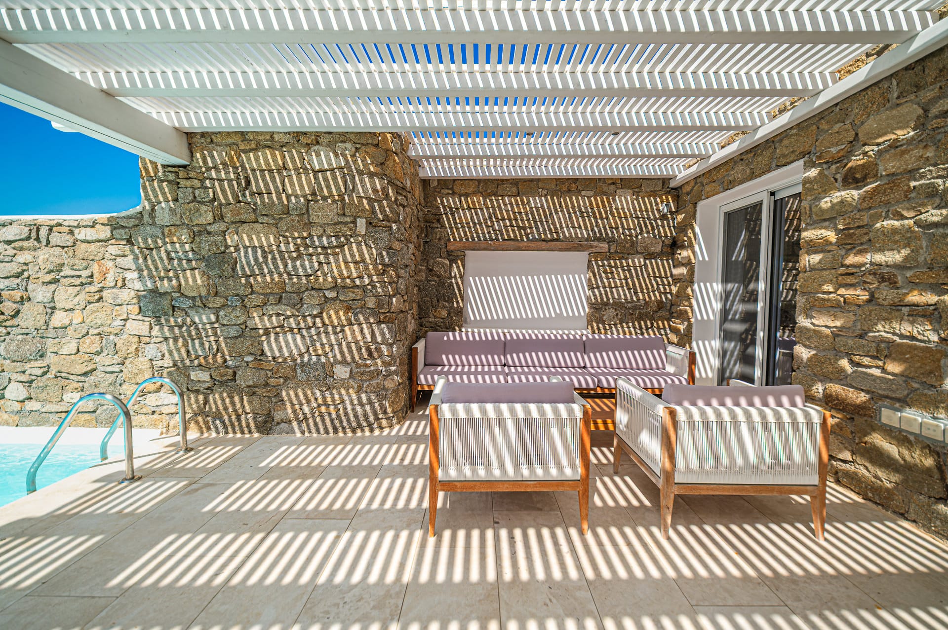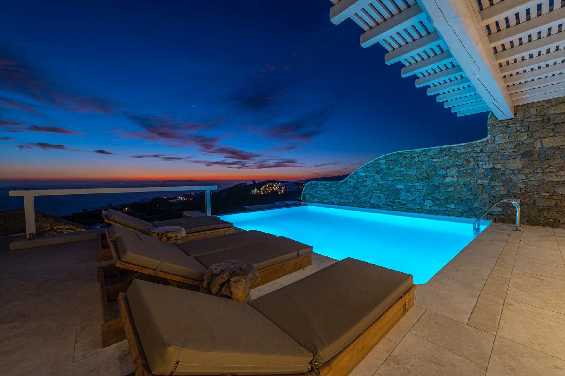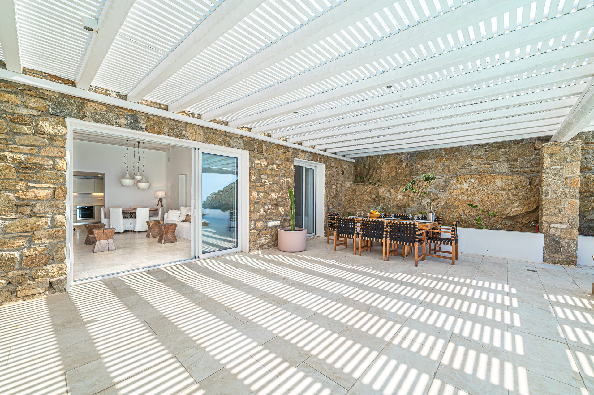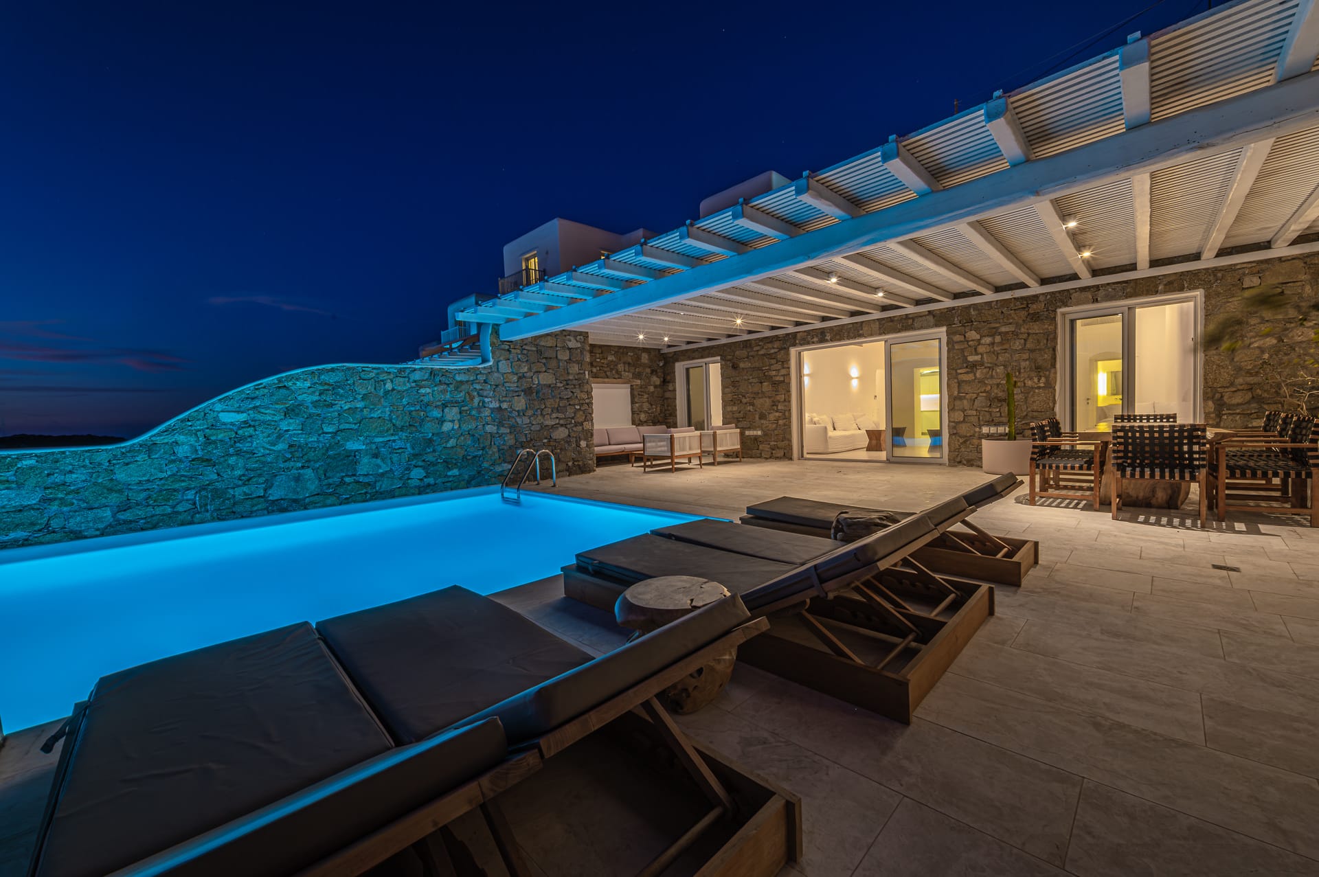 The 30 sq. meter infinity pool, offering breathtaking sunset views of the Aegean Sea, is the centerpiece of the villa's grounds. Complementing the pool is a spacious dining area with seating for 8, along with multiple shaded lounge spaces beneath beautiful pergolas. These areas are perfect for relaxation during the day or hosting romantic dinners and cocktail events in the evening. Surrounded by natural rocky landscapes, the villa's outdoor design creates a serene and luxurious environment, blending seamlessly with nature to deliver a unique experience.