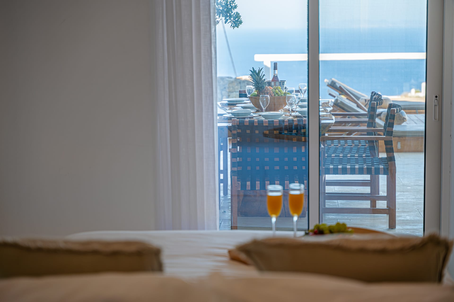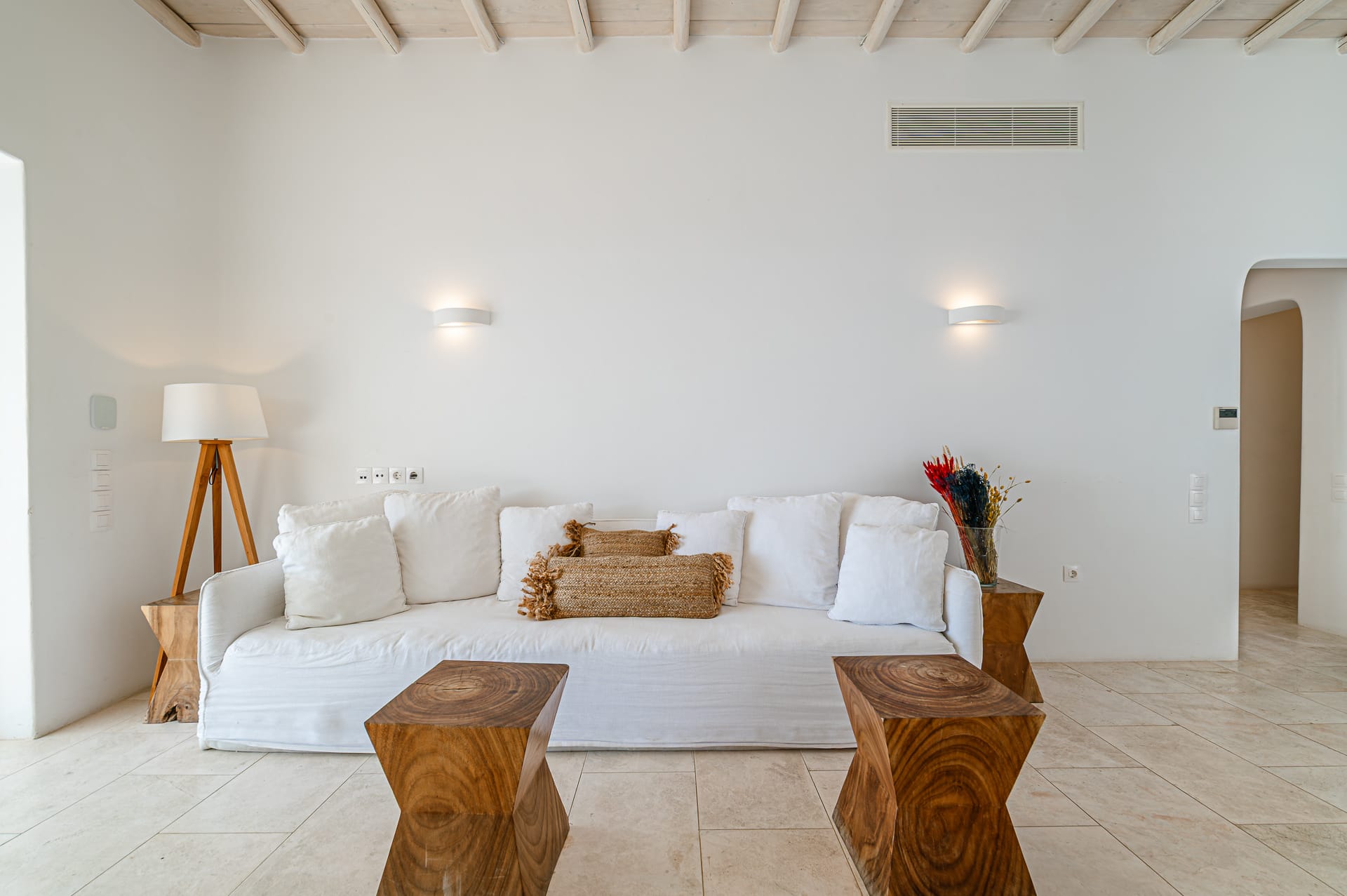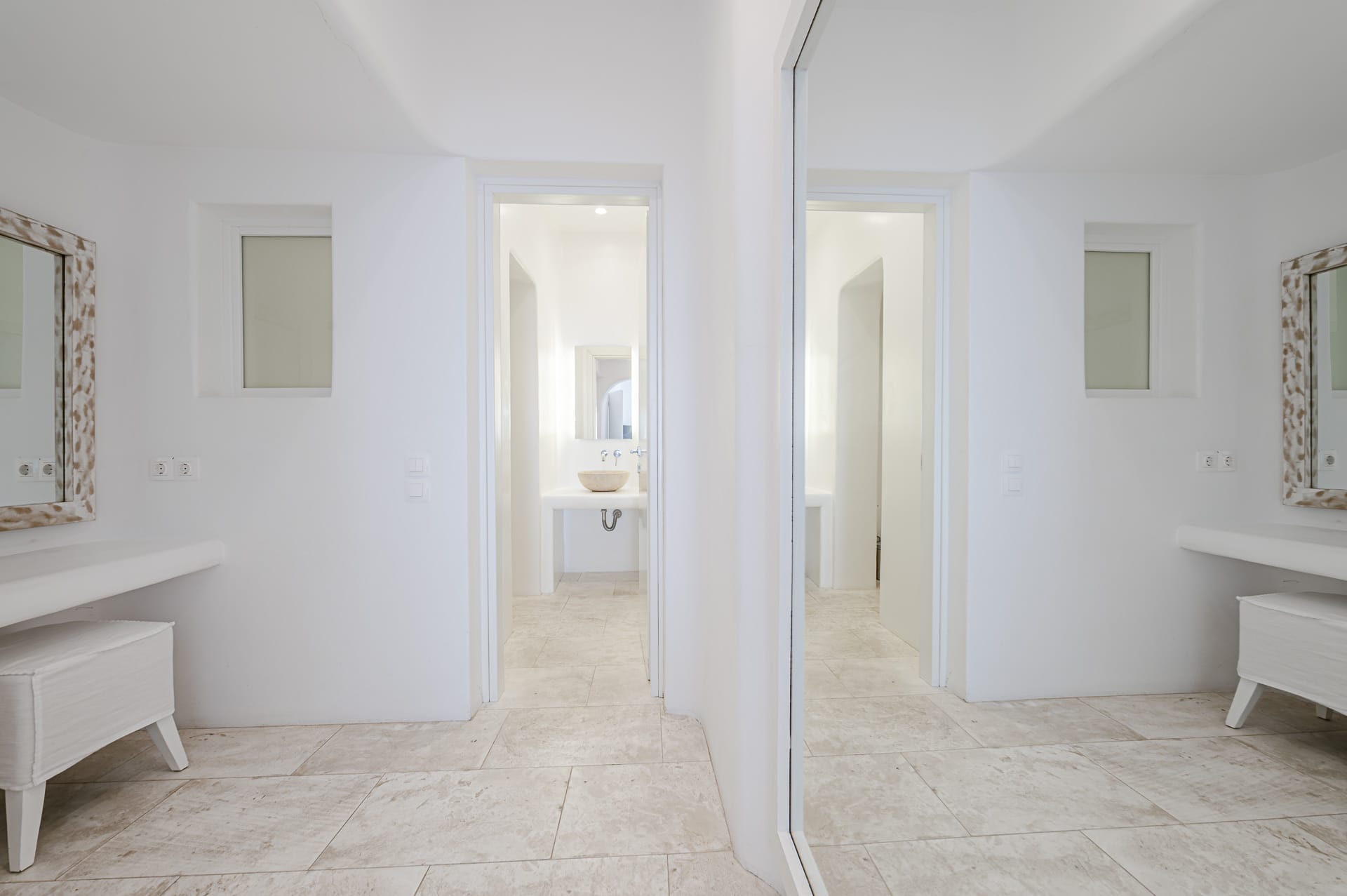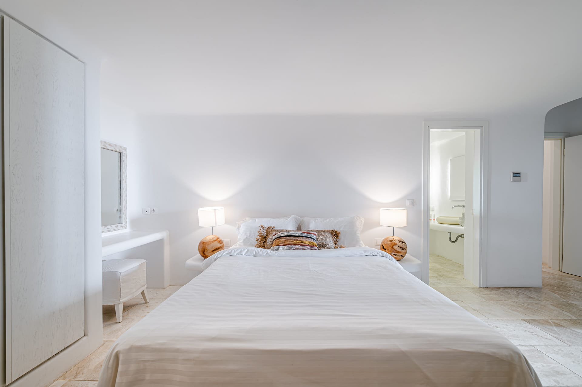 The Cycladic Mykonian architecture of this beautiful villa, in combination with the modern furniture, creates an elegant result as well as an impressive atmosphere.
