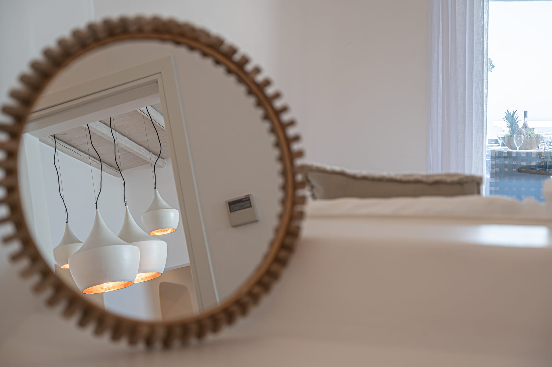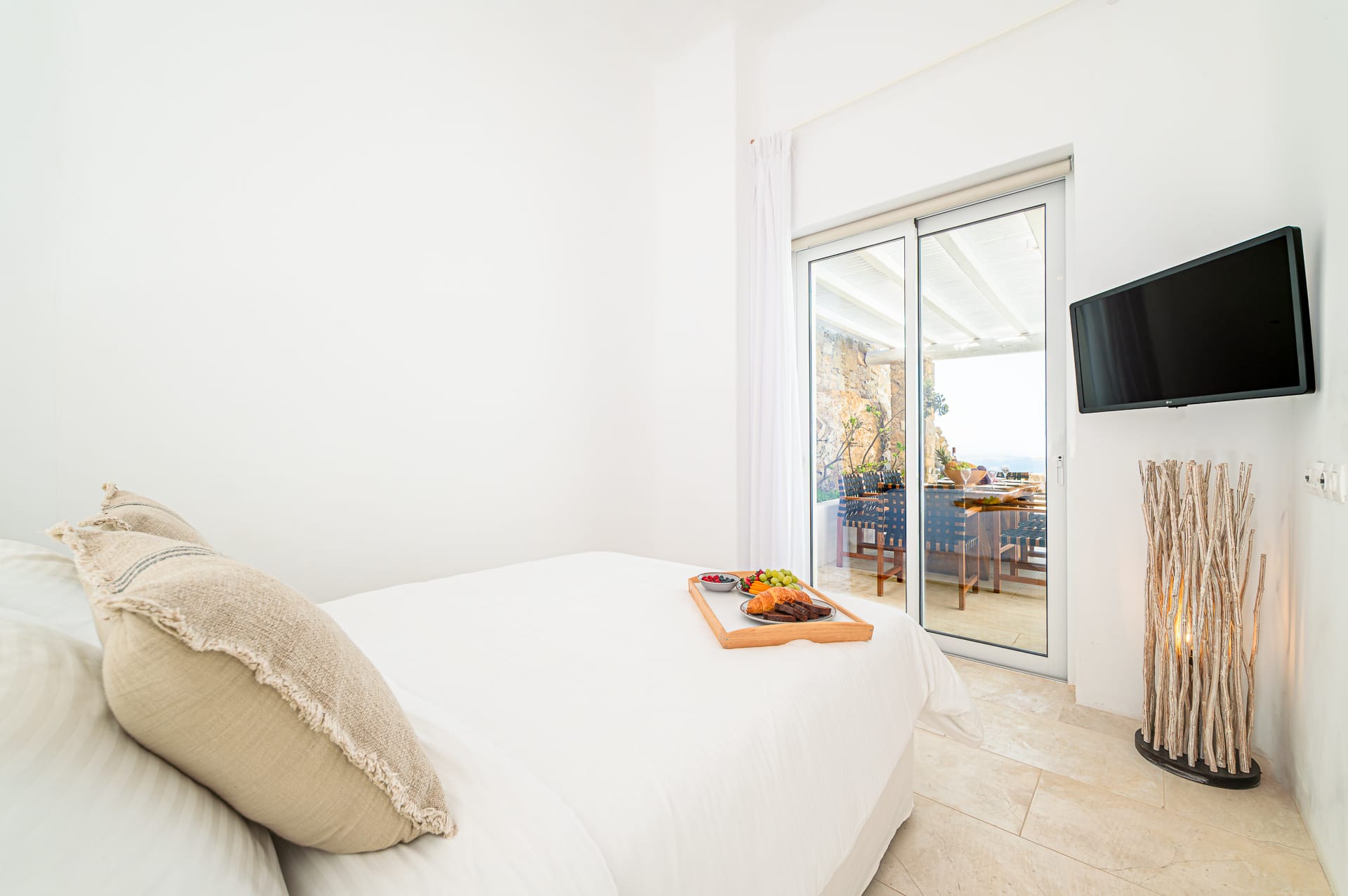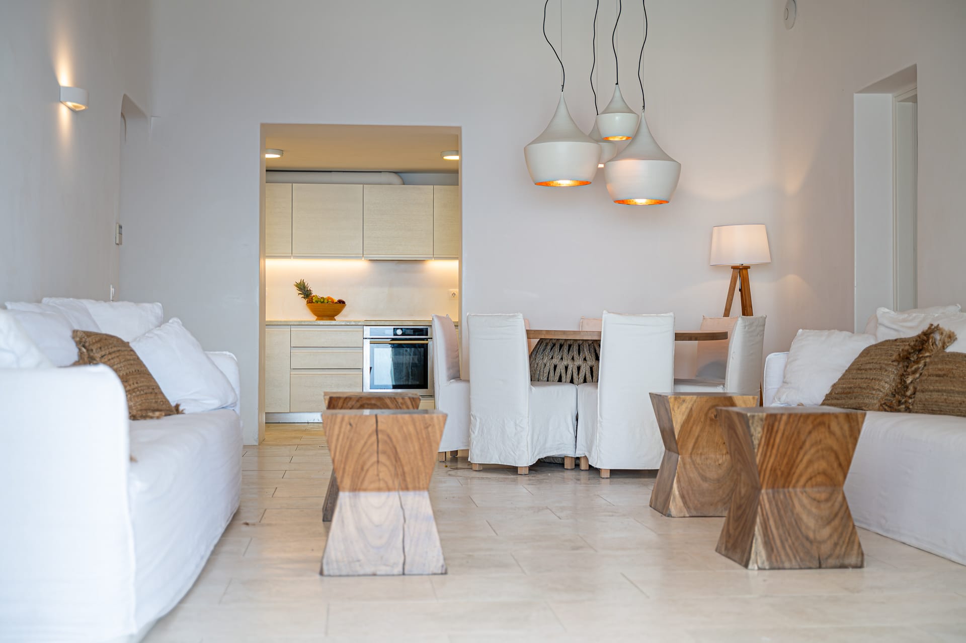 The Cycladic Mykonian architecture of this beautiful villa, in combination with the modern furniture, creates an elegant result as well as an impressive atmosphere.