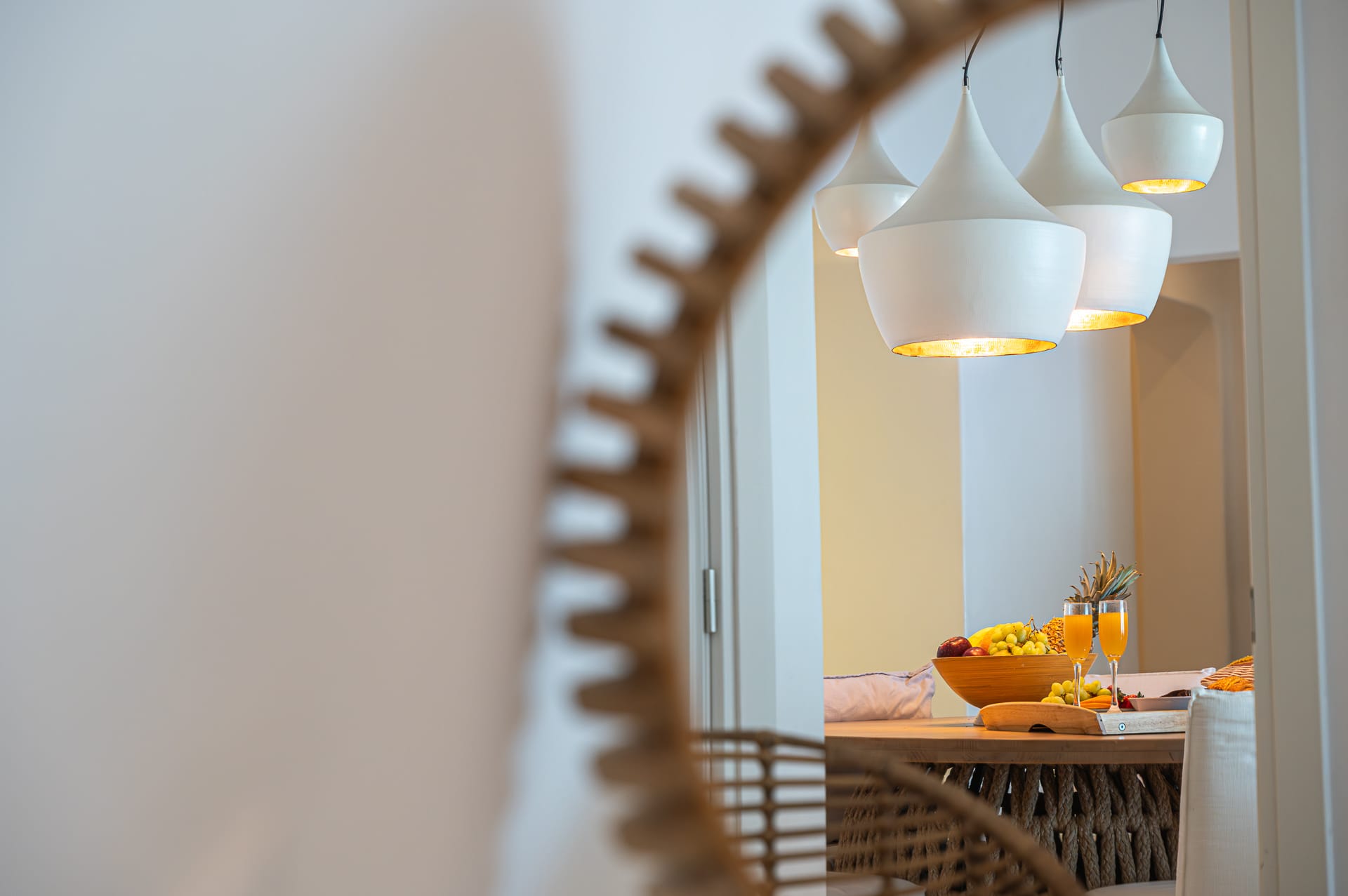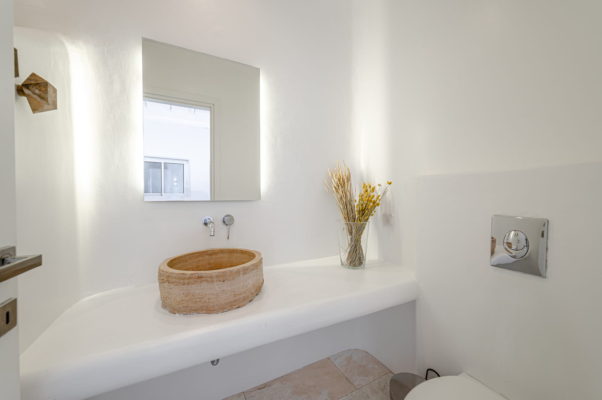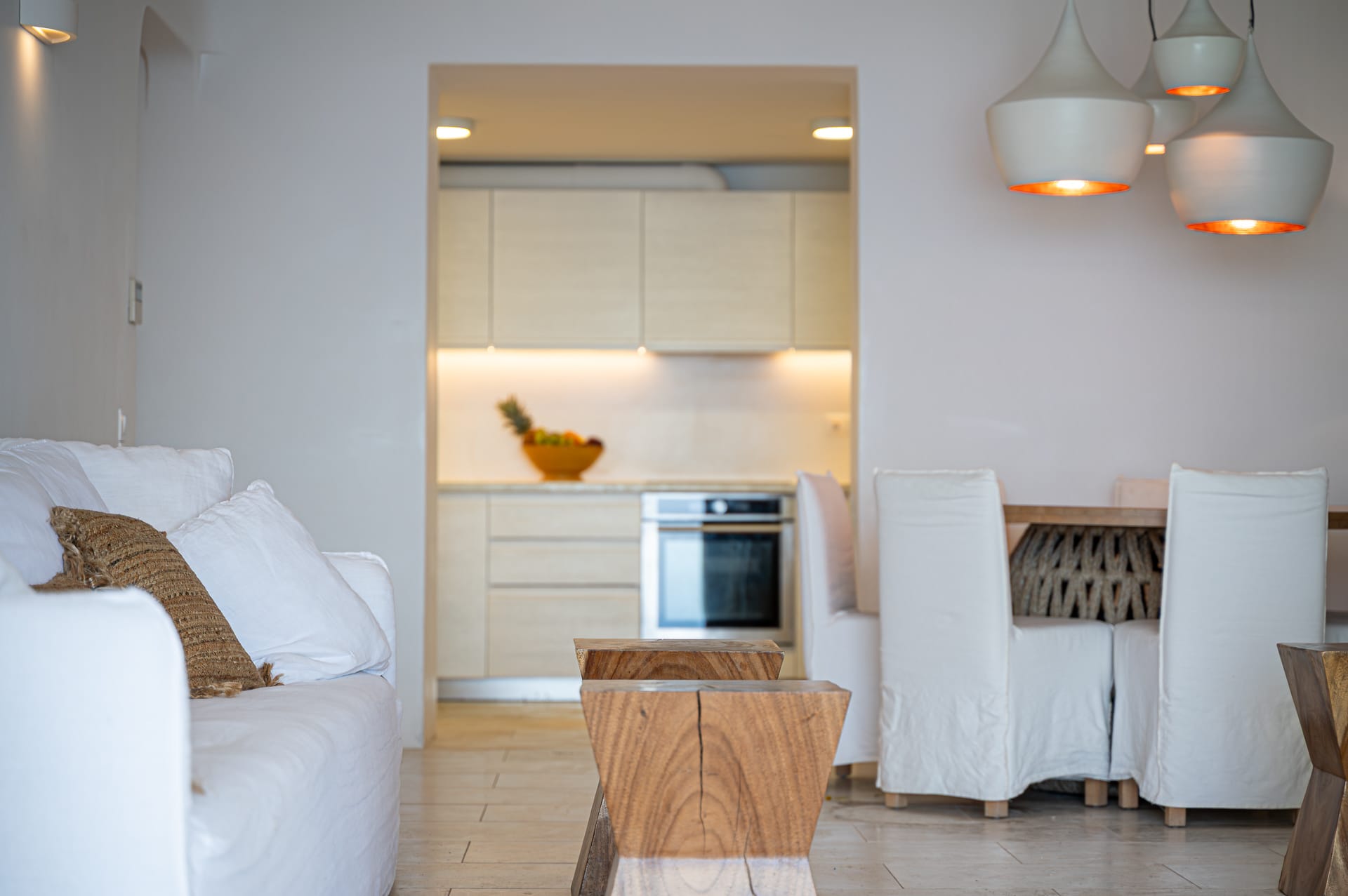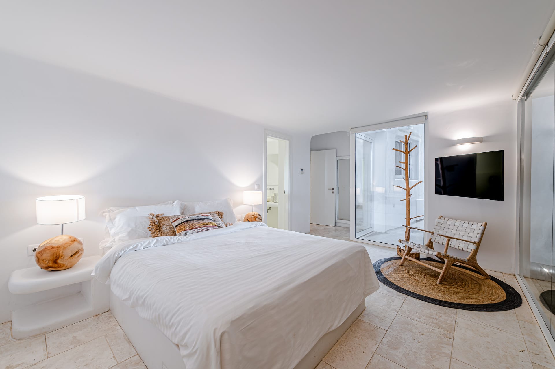 The Cycladic Mykonian architecture of this beautiful villa, in combination with the modern furniture, creates an elegant result as well as an impressive atmosphere.