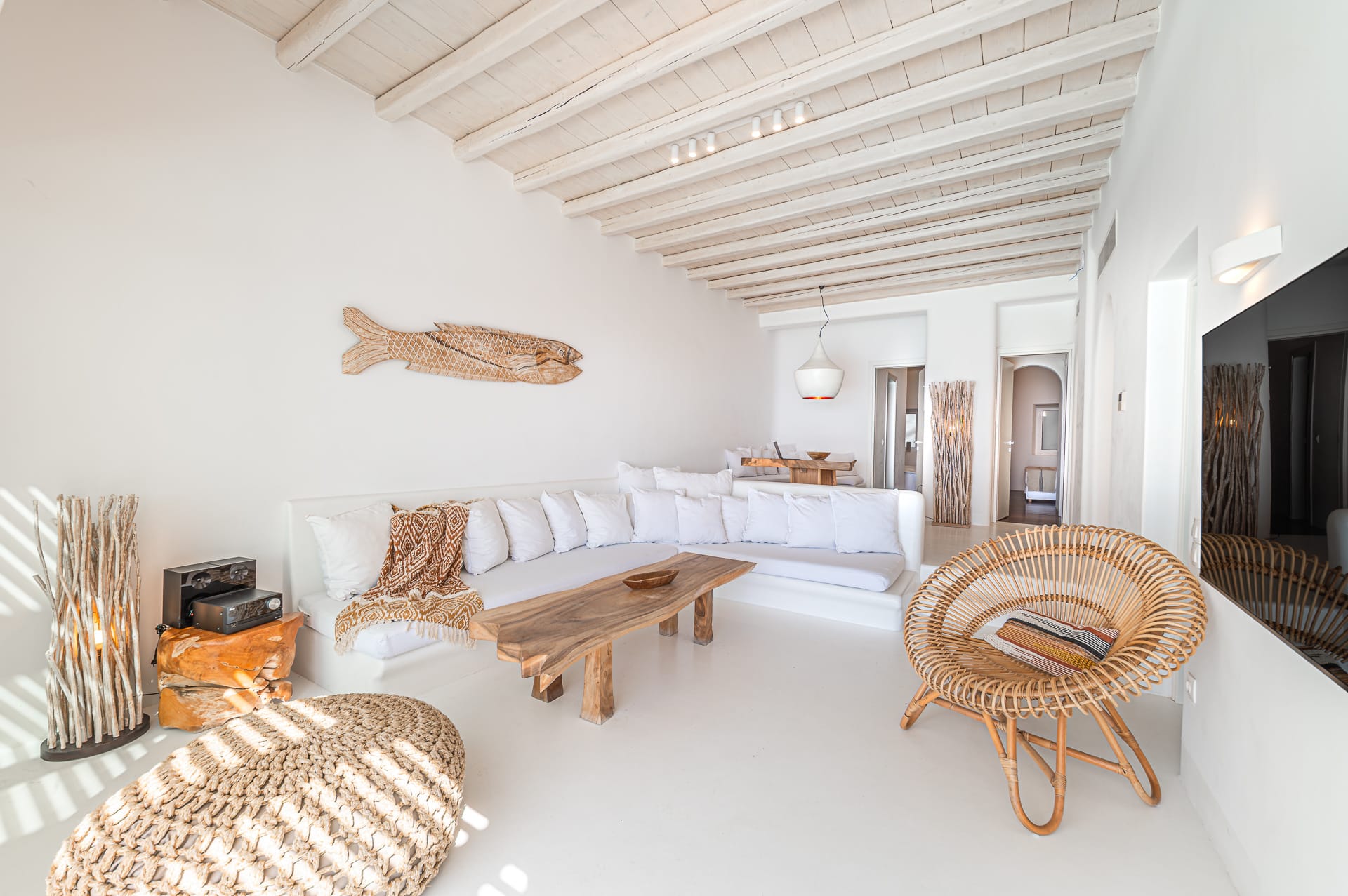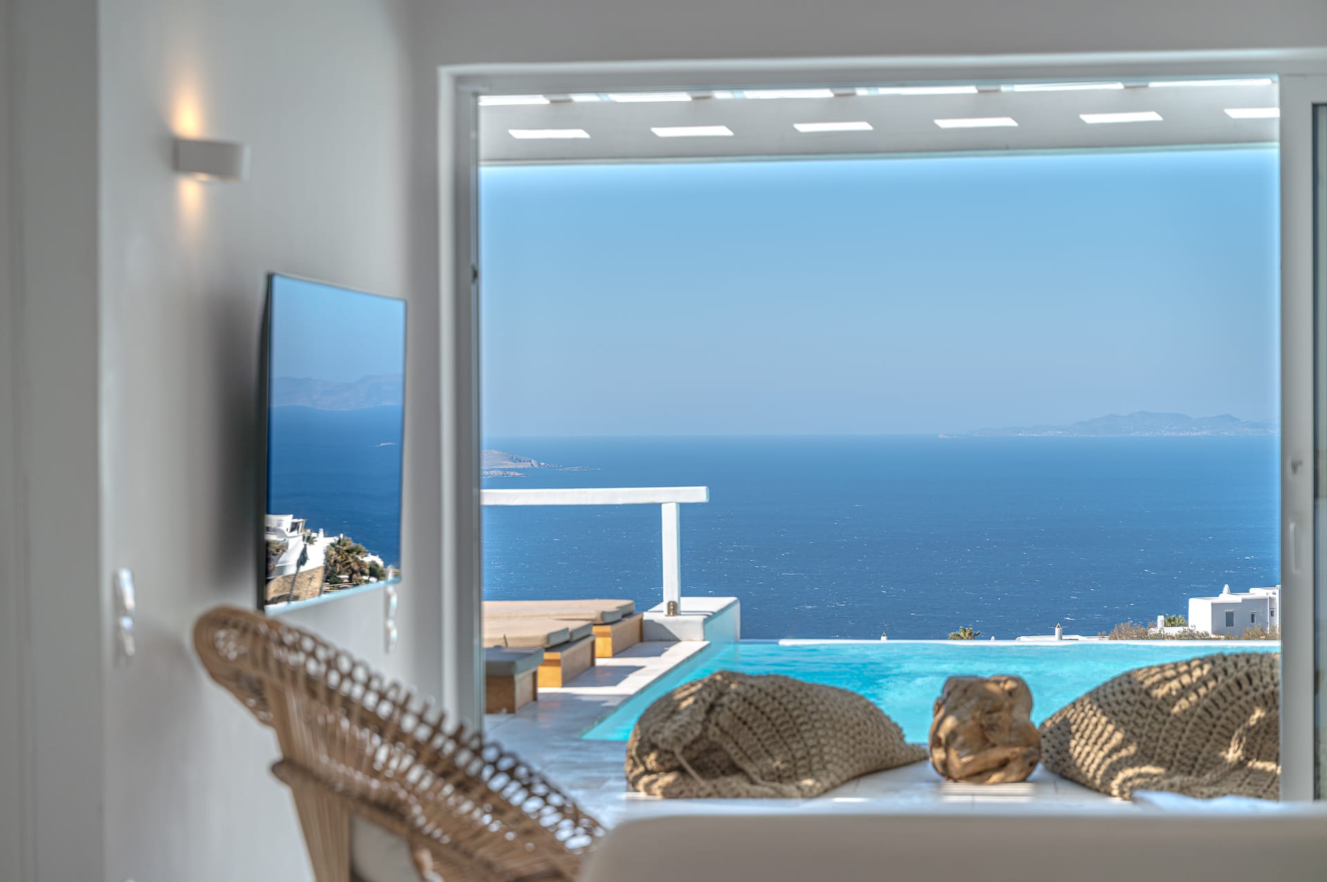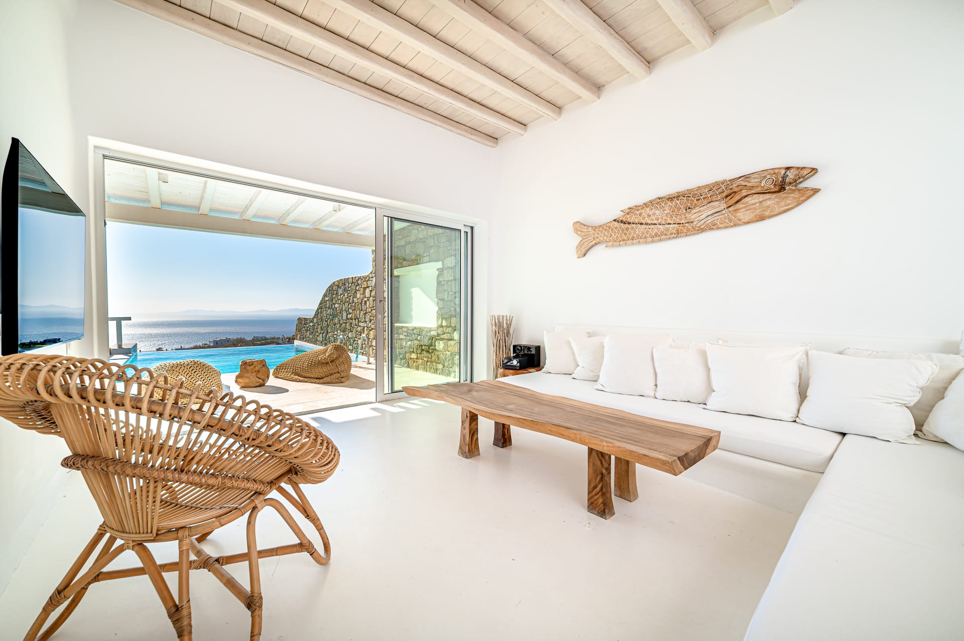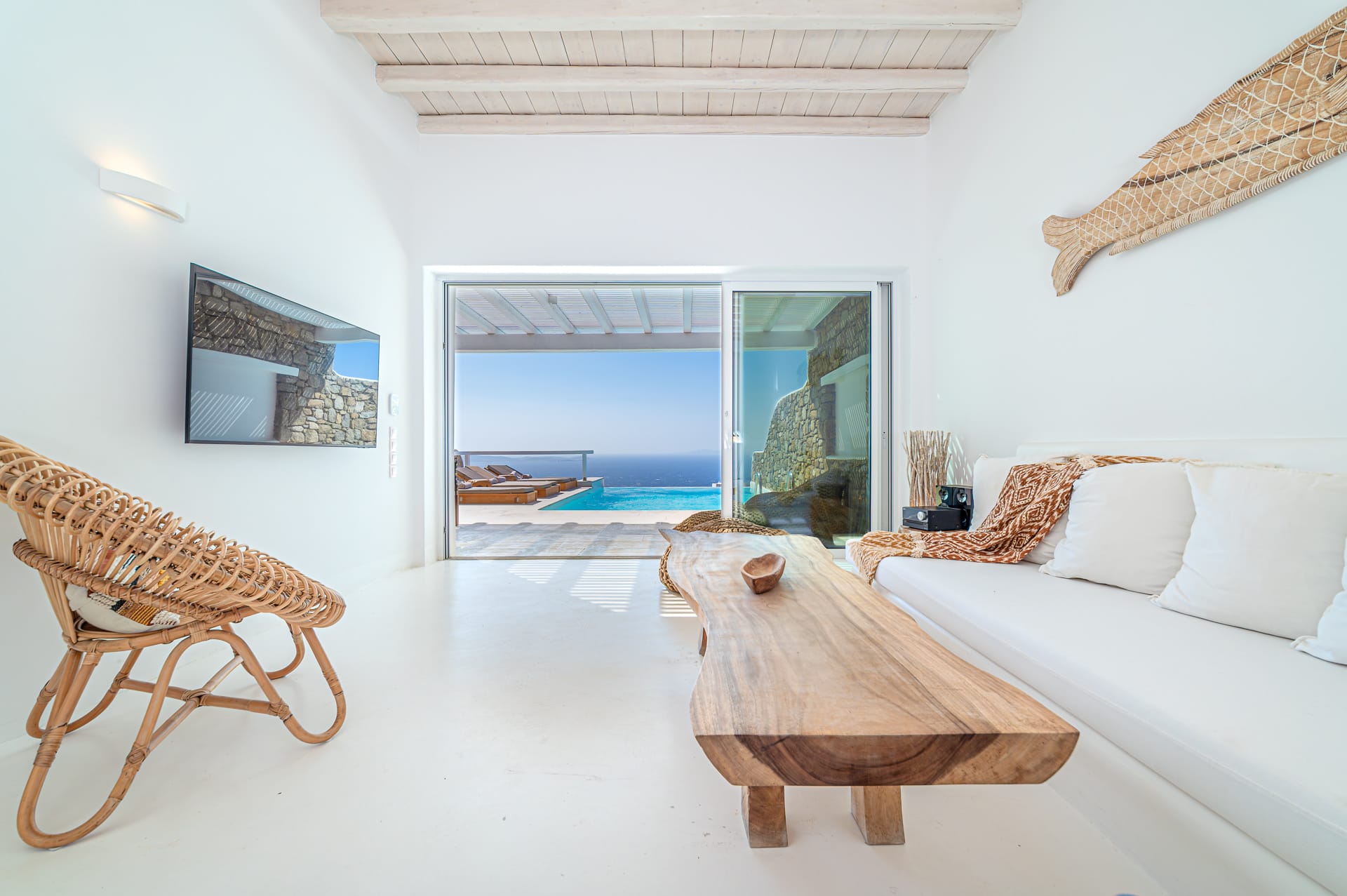 The Cycladic Mykonian architecture of this beautiful villa, in combination with the modern furniture, creates an elegant result as well as an impressive atmosphere.