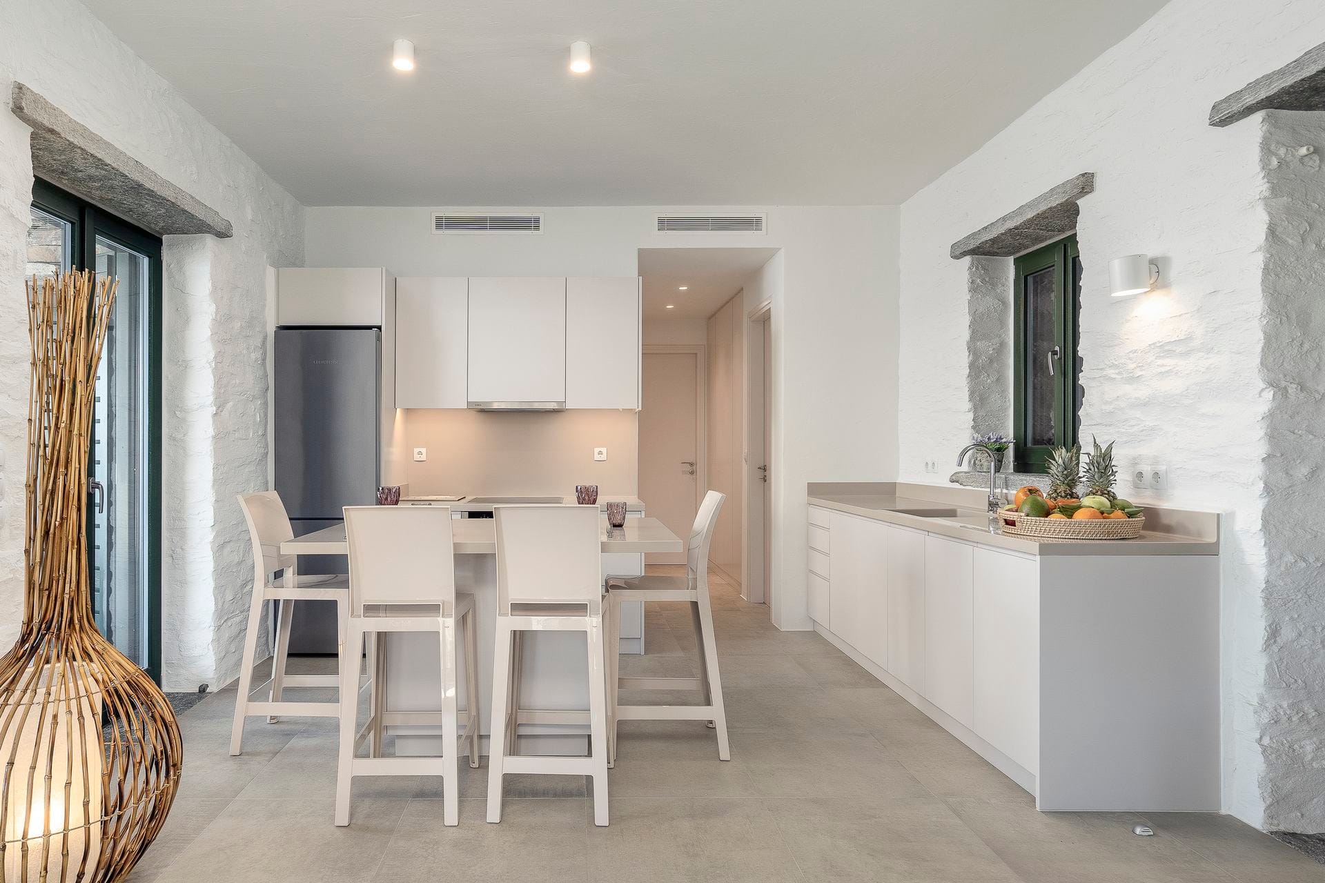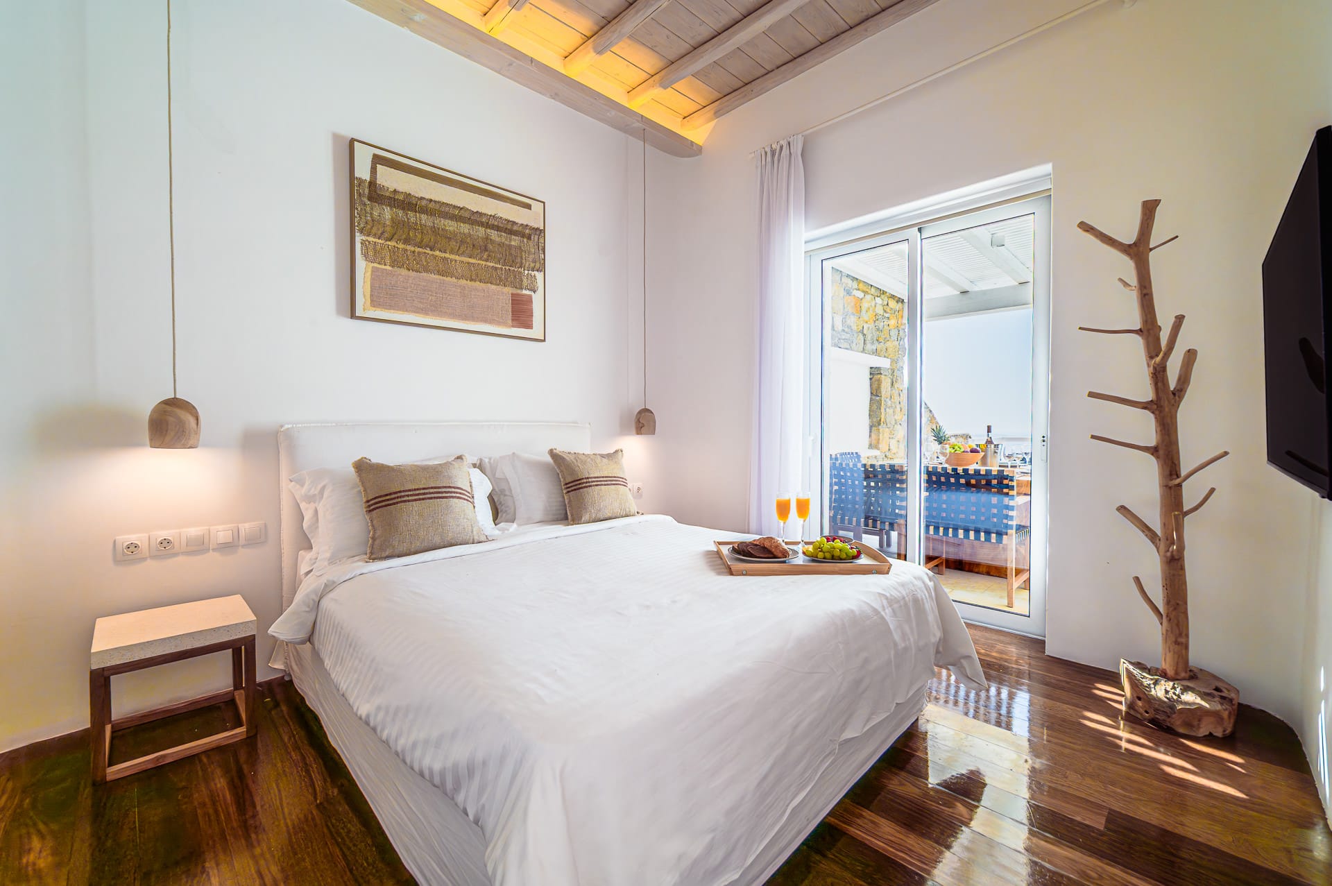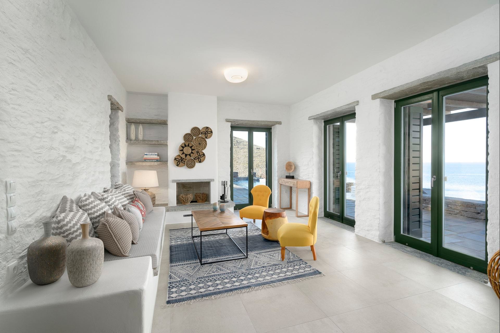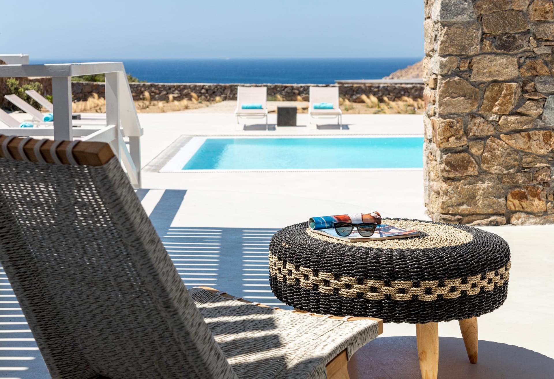 The Cycladic Mykonian architecture of this beautiful villa, in combination with the modern furniture, creates an elegant result as well as an impressive atmosphere.