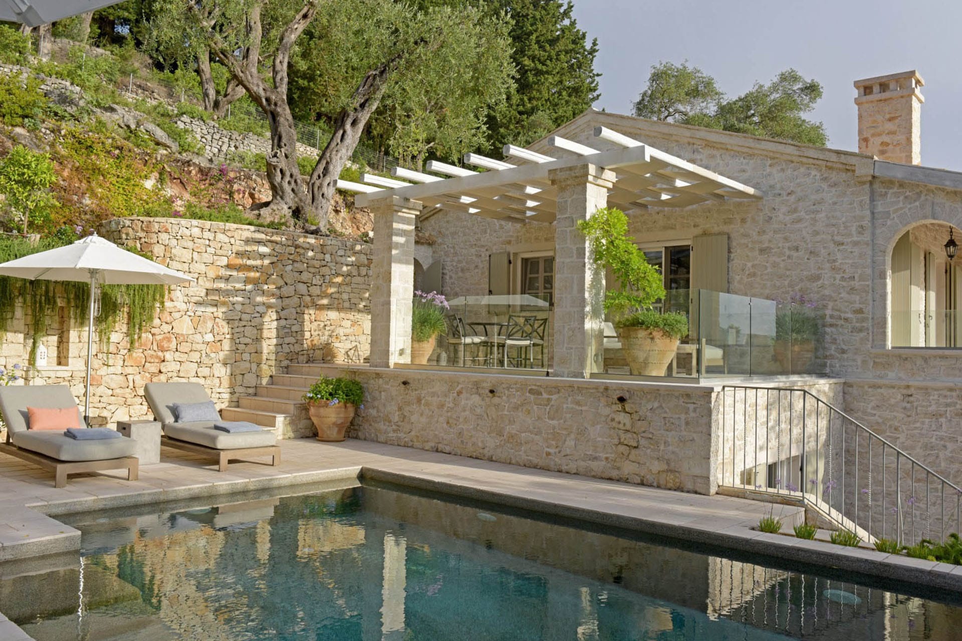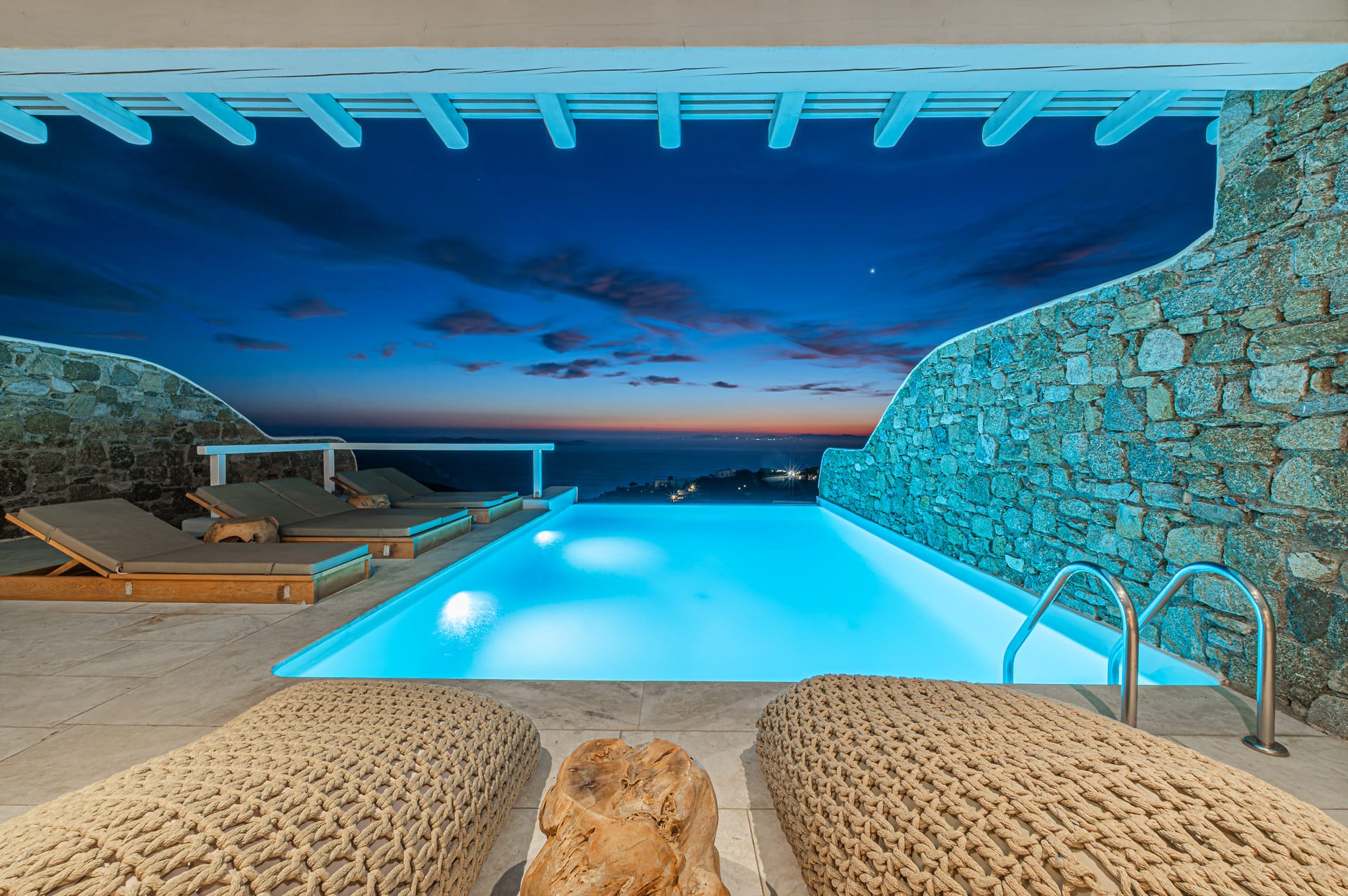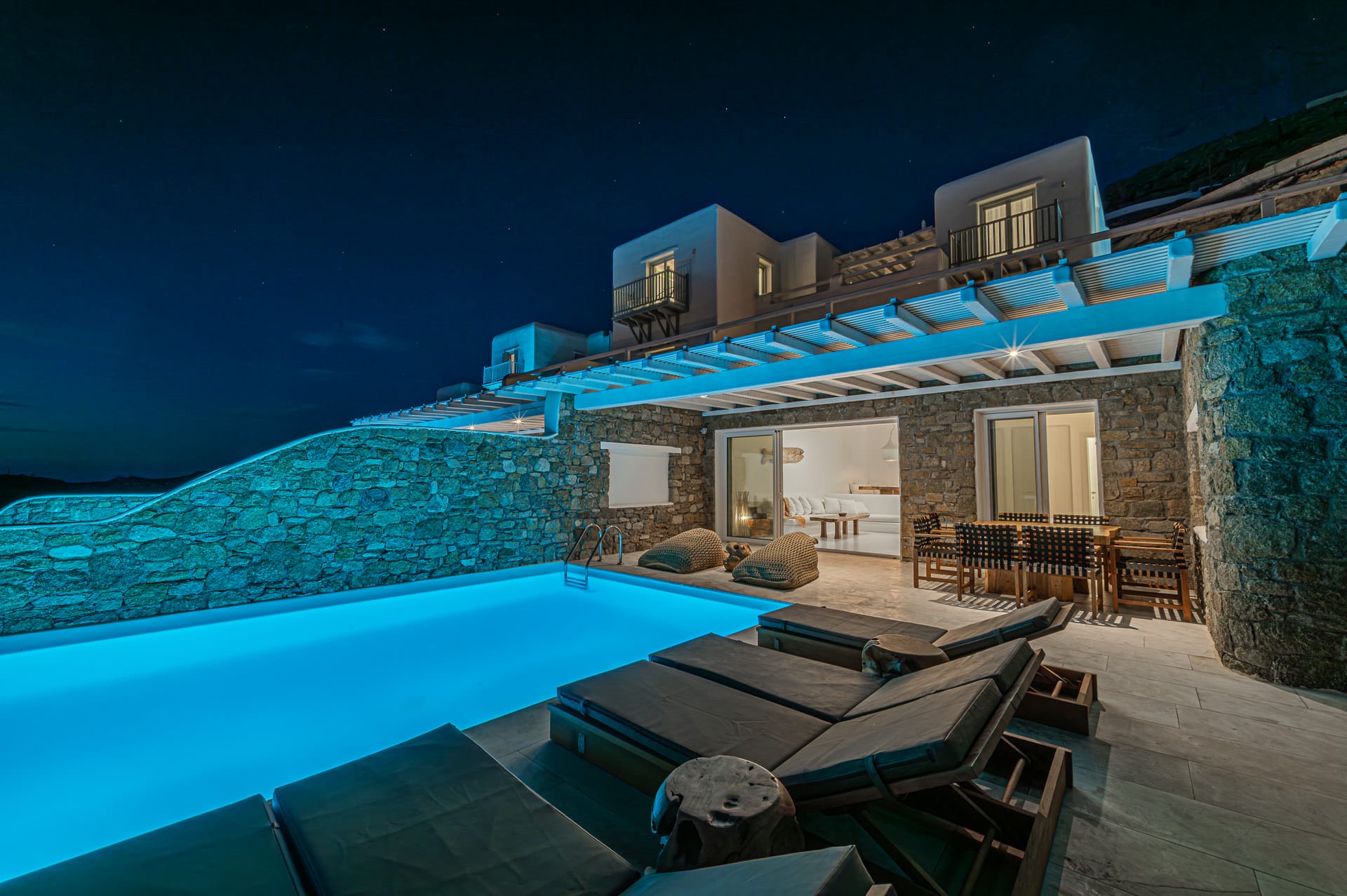 The 30 sq. meter infinity pool, offering breathtaking sunset views of the Aegean Sea, is the centerpiece of the villa's grounds. Complementing the pool is a spacious dining area with seating for 8, along with multiple shaded lounge spaces beneath beautiful pergolas. These areas are perfect for relaxation during the day or hosting romantic dinners and cocktail events in the evening. Surrounded by natural rocky landscapes, the villa's outdoor design creates a serene and luxurious environment, blending seamlessly with nature to deliver a unique experience.