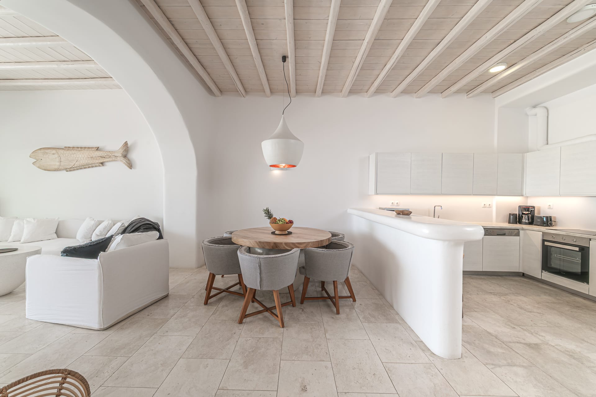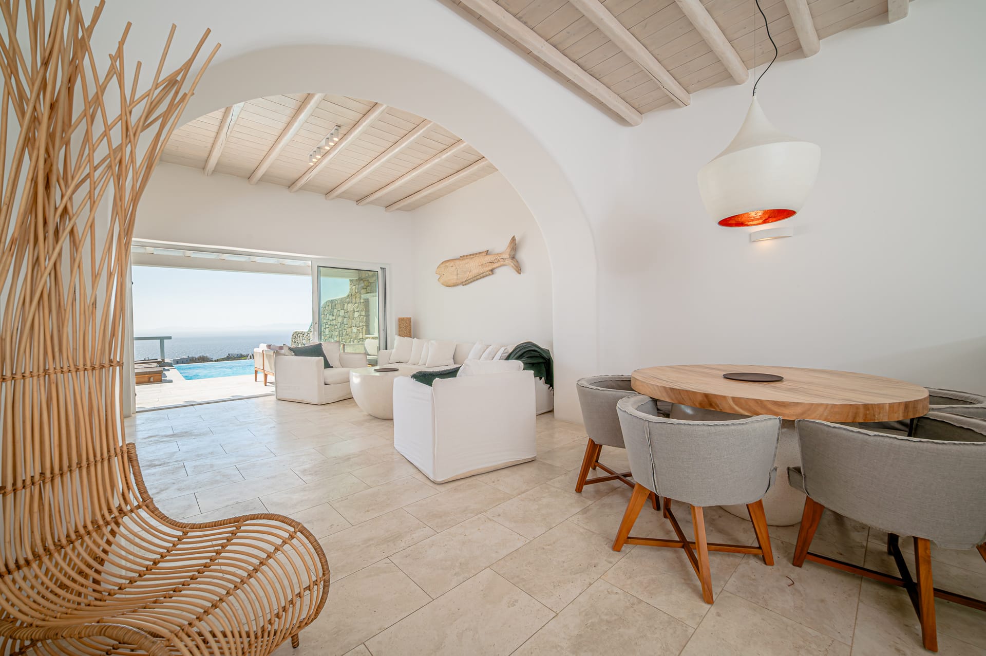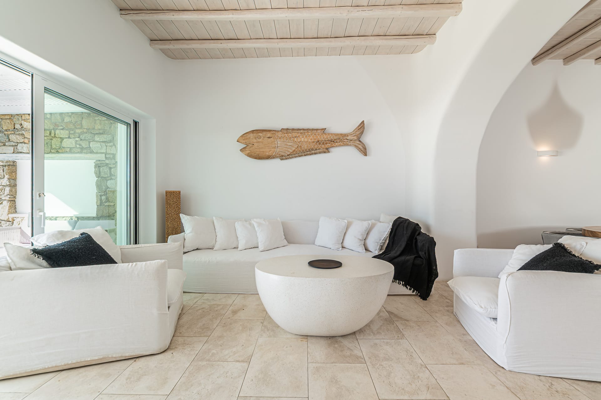 The Cycladic Mykonian architecture of this beautiful villa, in combination with the modern furniture, creates an elegant result as well as an impressive atmosphere.