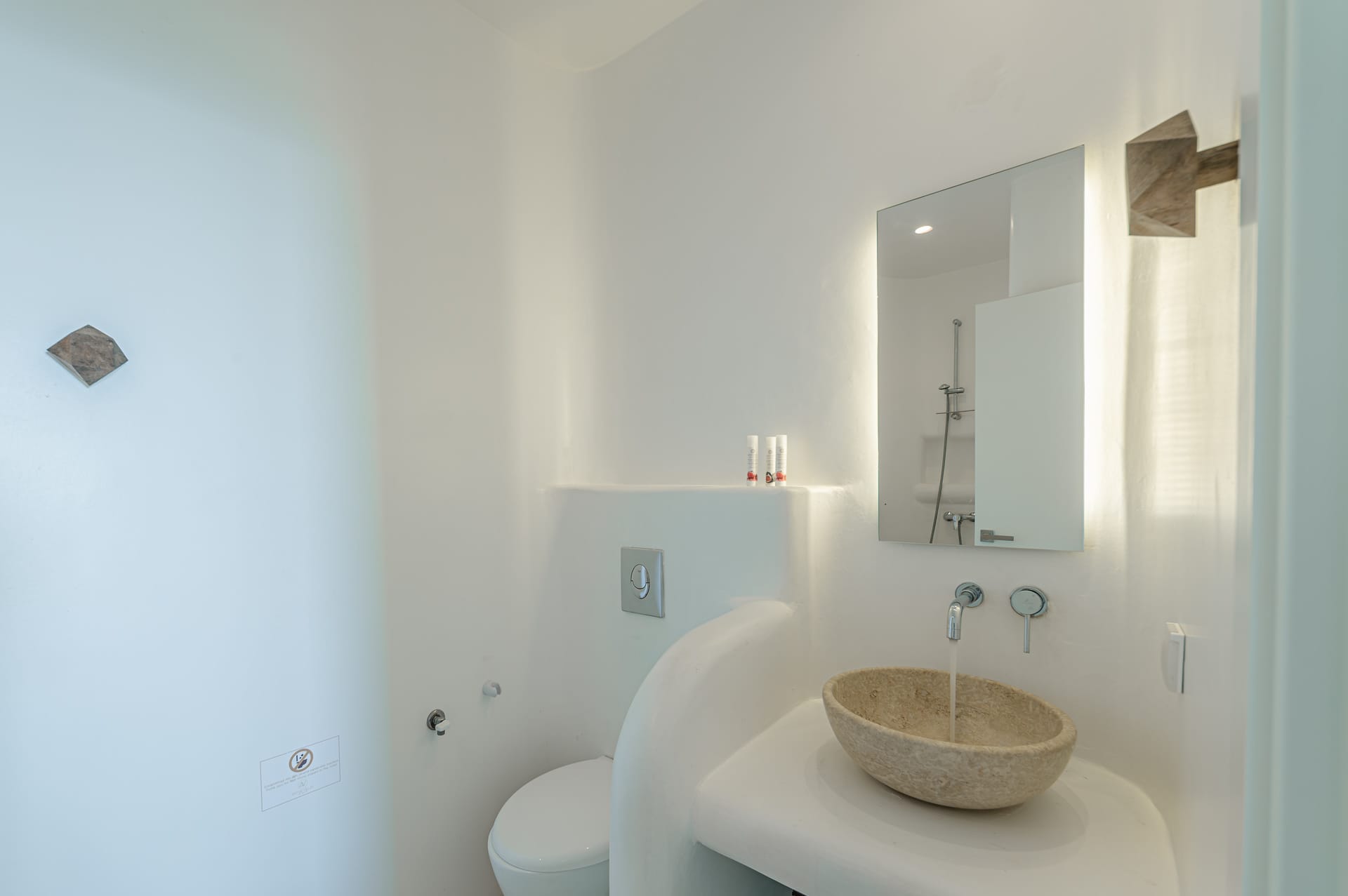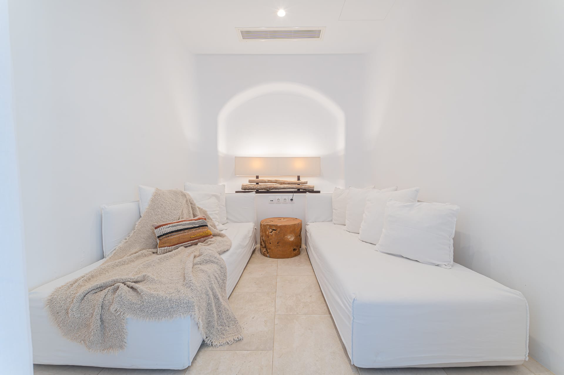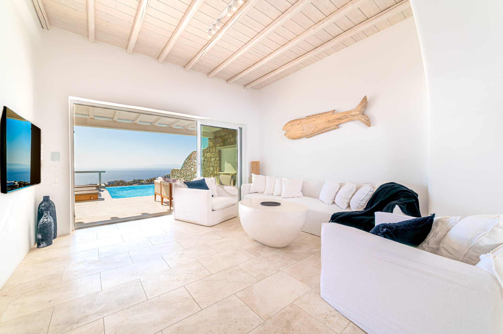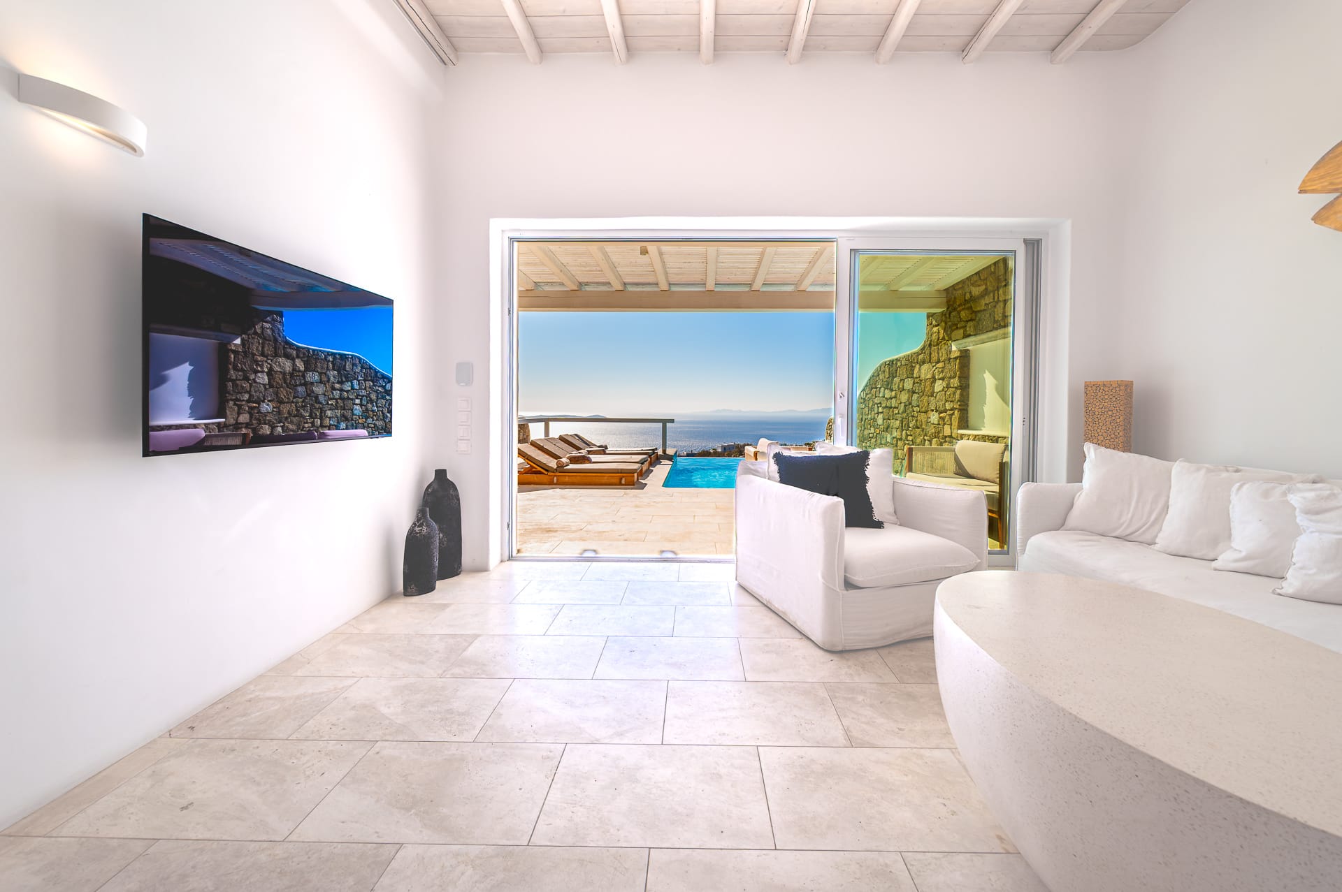 The Cycladic Mykonian architecture of this beautiful villa, in combination with the modern furniture, creates an elegant result as well as an impressive atmosphere.