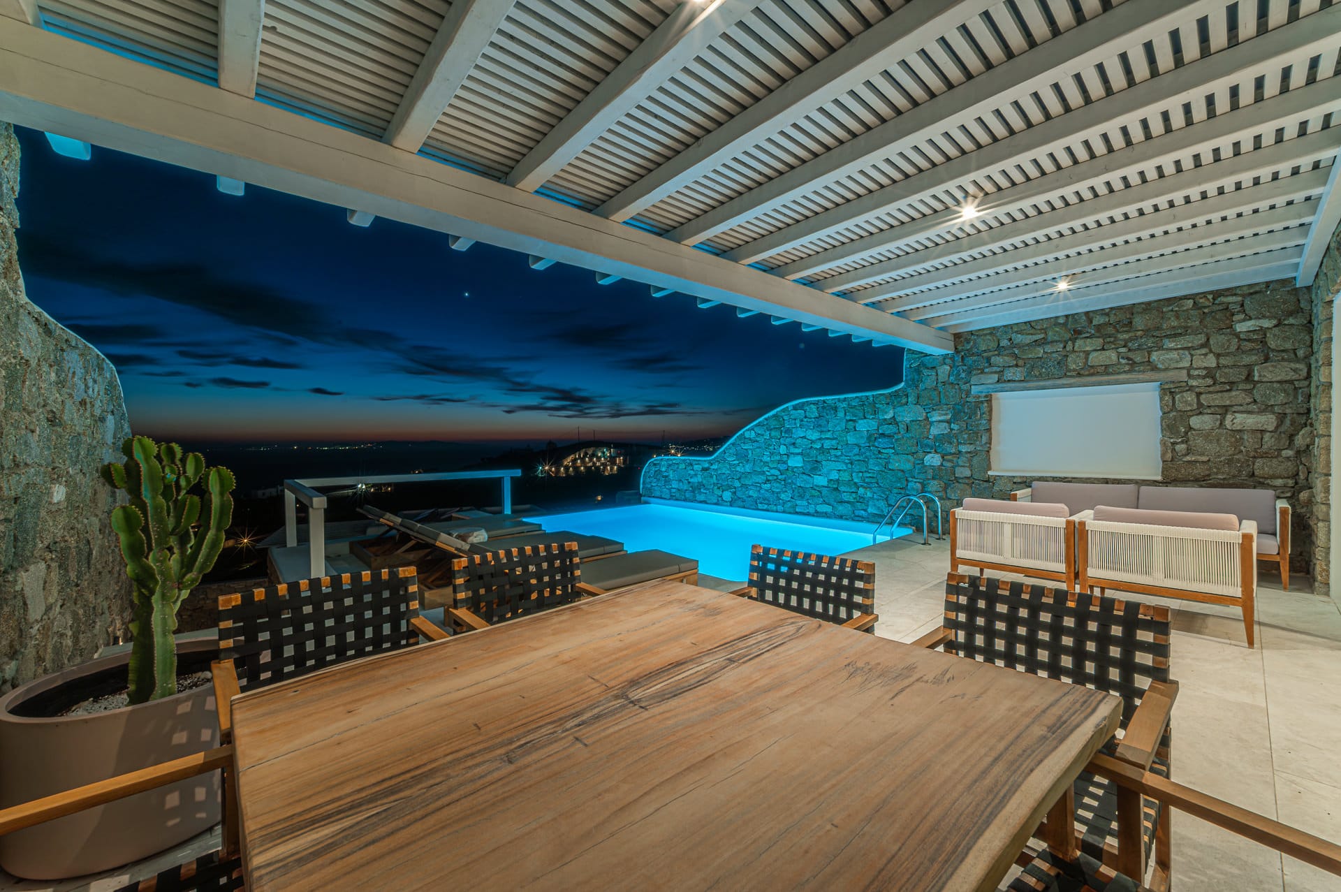 The 30 sq. meter infinity pool, offering breathtaking sunset views of the Aegean Sea, is the centerpiece of the villa's grounds. Complementing the pool is a spacious dining area with seating for 10, along with multiple shaded lounge spaces beneath beautiful pergolas. These areas are perfect for relaxation during the day or hosting romantic dinners and cocktail events in the evening. Surrounded by natural rocky landscapes, the villa's outdoor design creates a serene and luxurious environment, blending seamlessly with nature to deliver a unique experience.