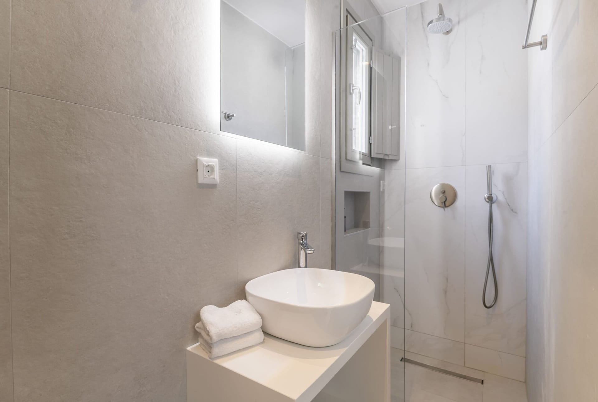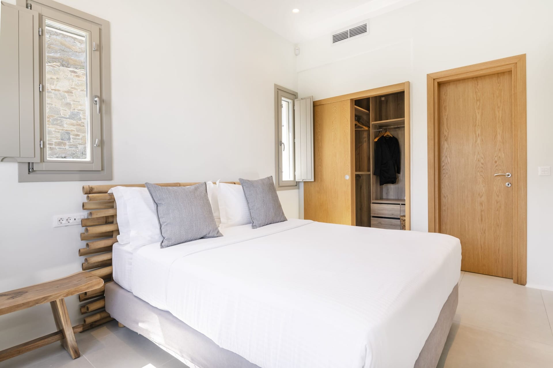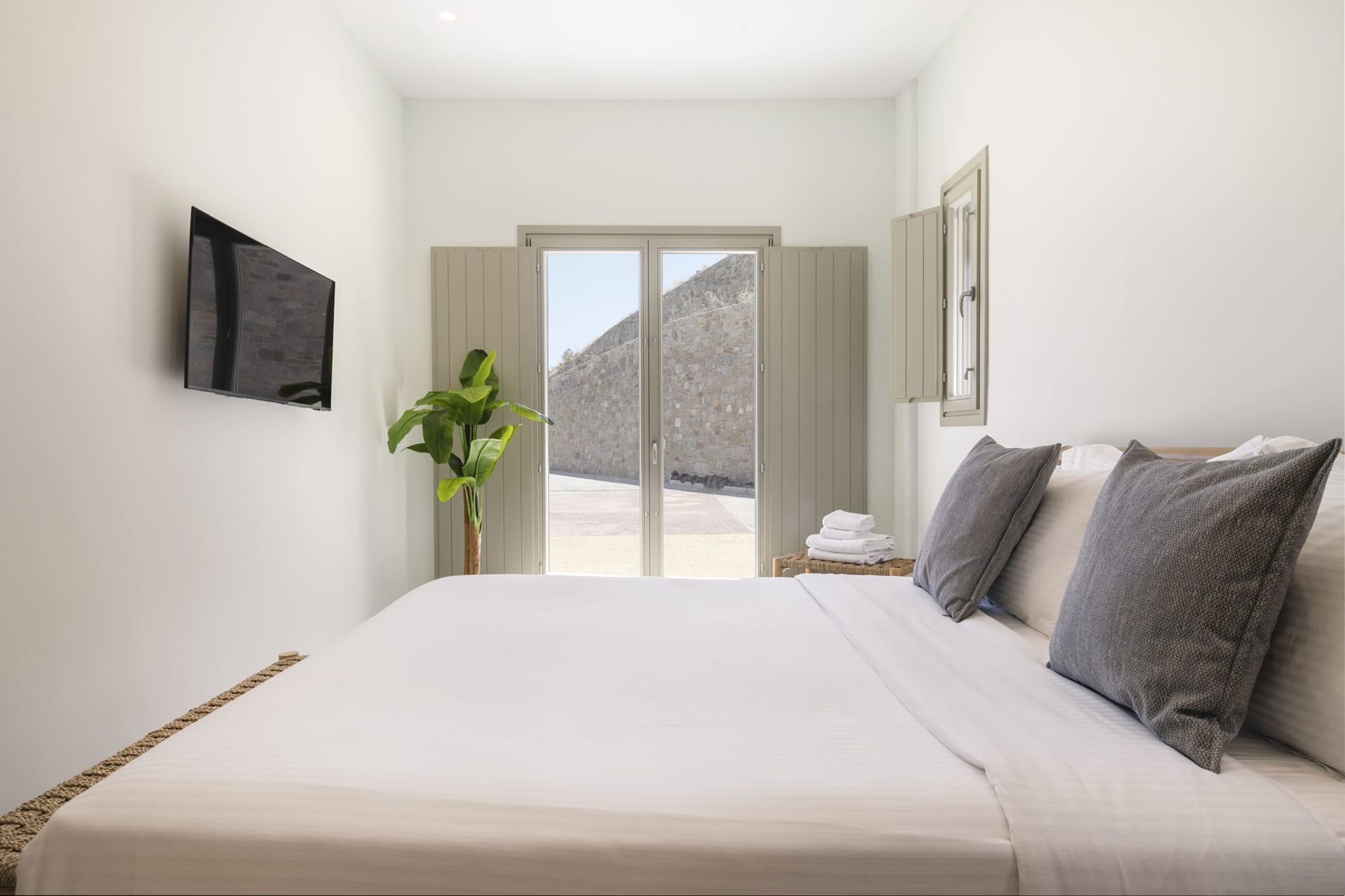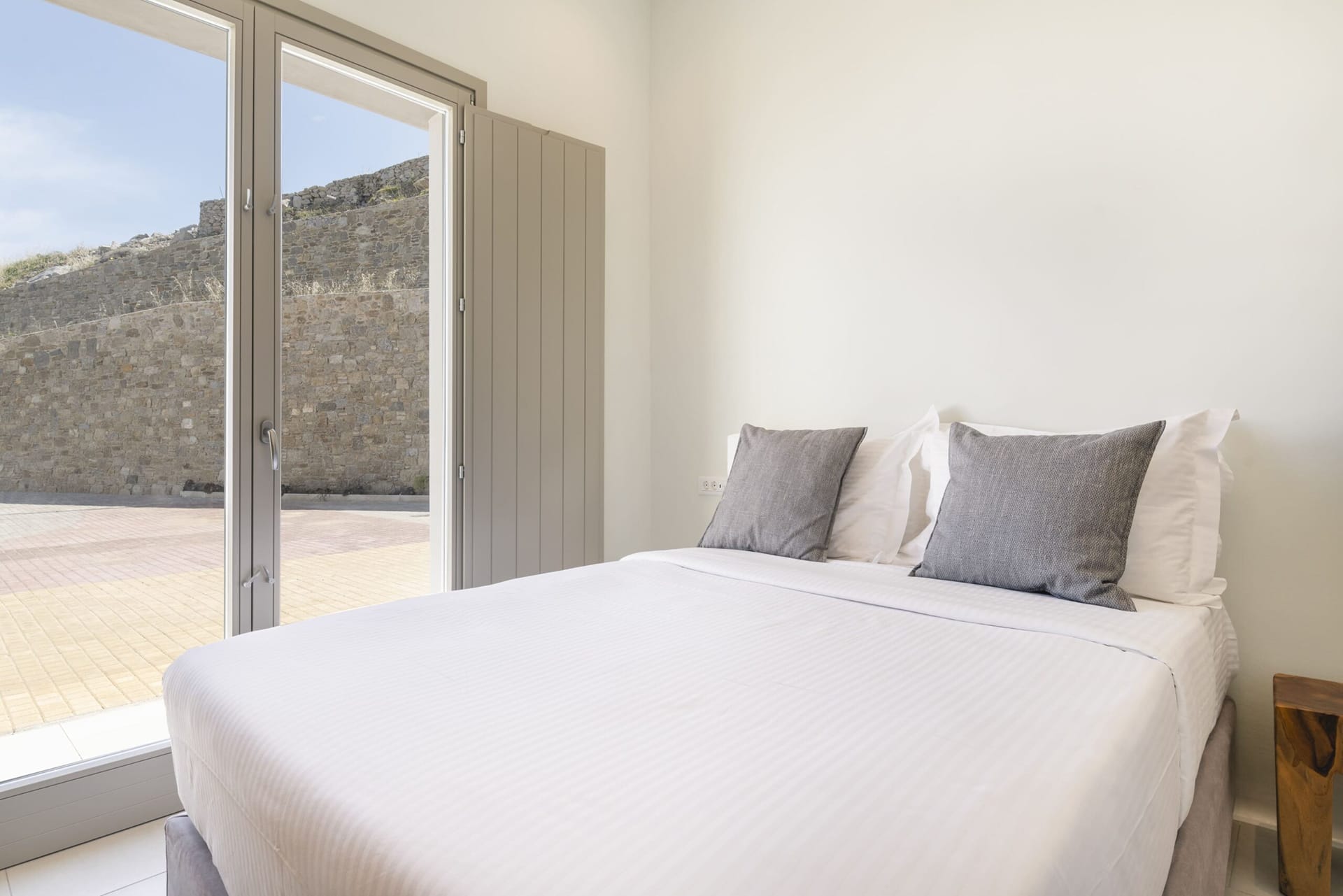 🛏️2* Queen-sized bedroom with private bathroom (shower) and French doors to a balcony with unlimited Aegean sea views.