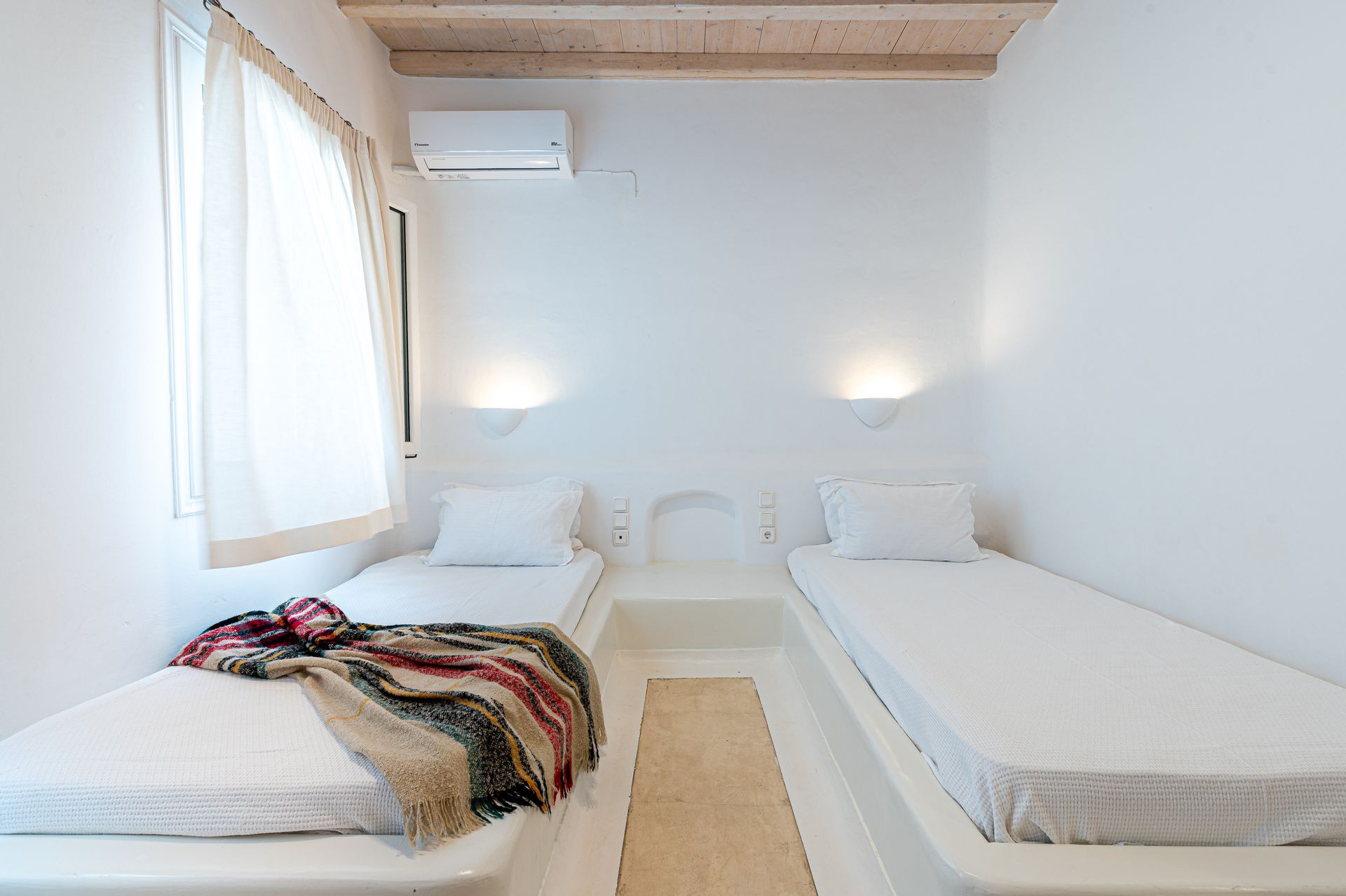 Originally built in 2008 the villa underwent a meticulous renovation in 2022. The refurbishments preserved its traditional Mykonian charm with whitewashed walls, curved lines, wooden beams, and built-in furniture, while adding modern comforts. Marble floors, sunken baths, and a seamless blend of form and function create an inviting retreat for couples, families, or groups of friends.