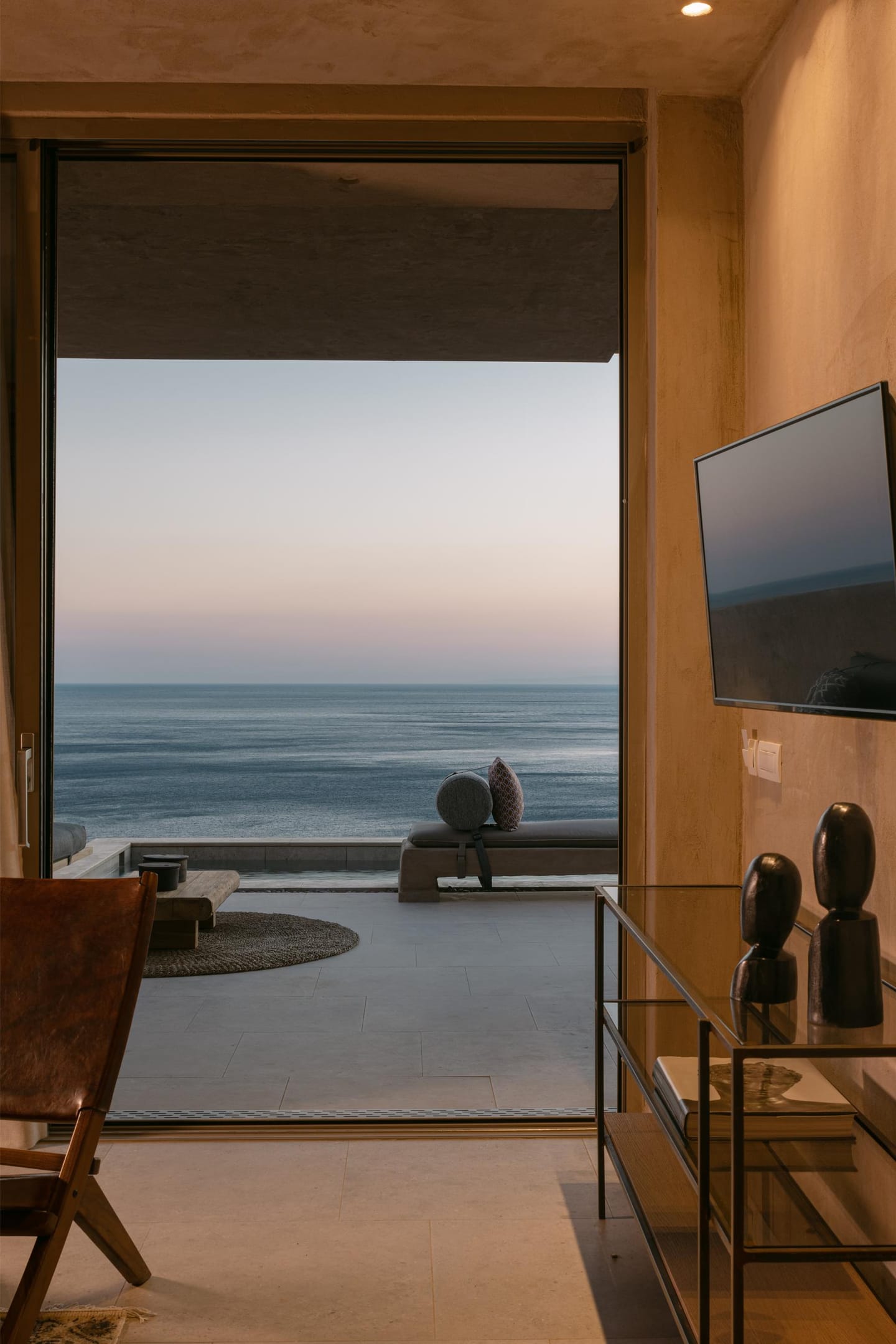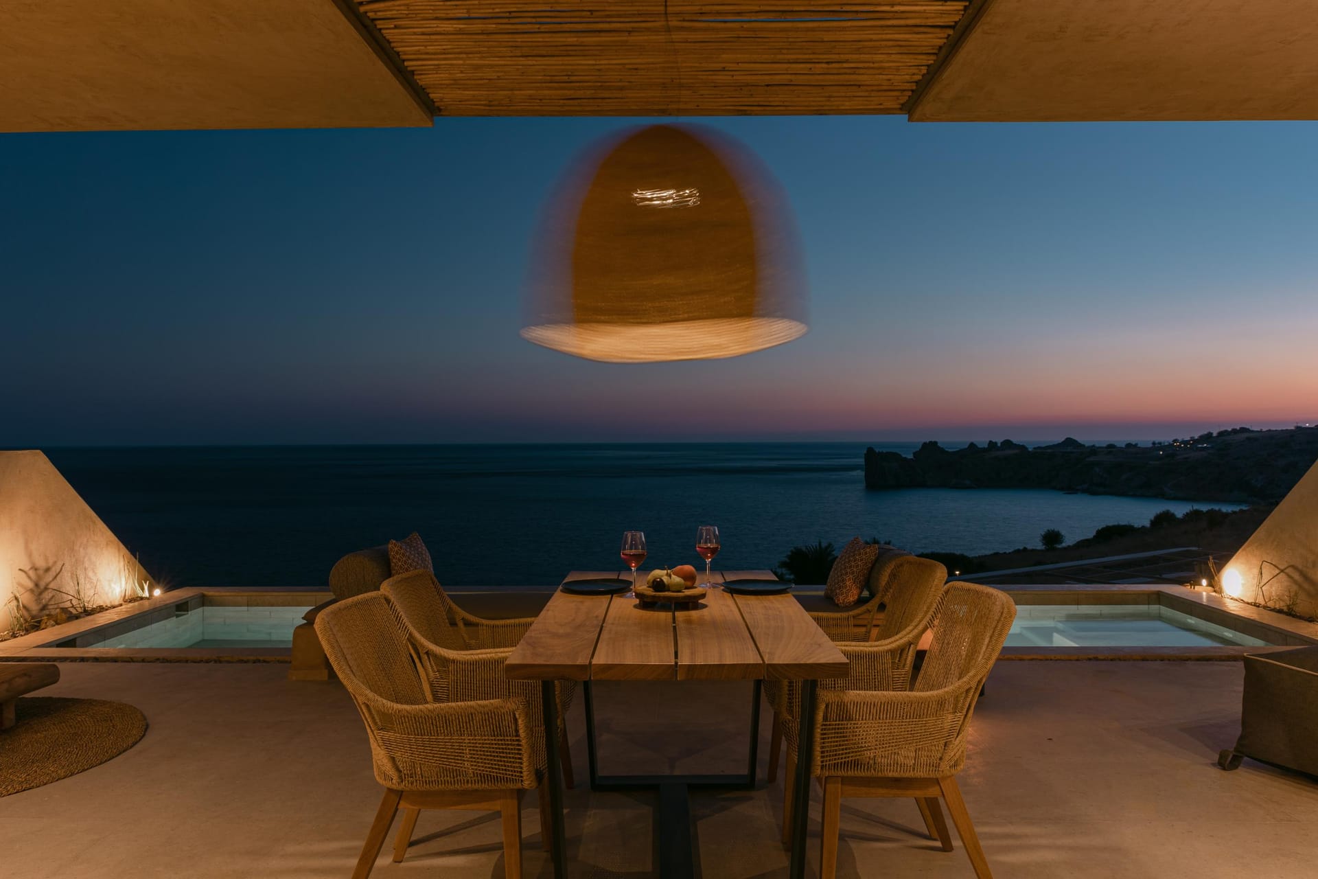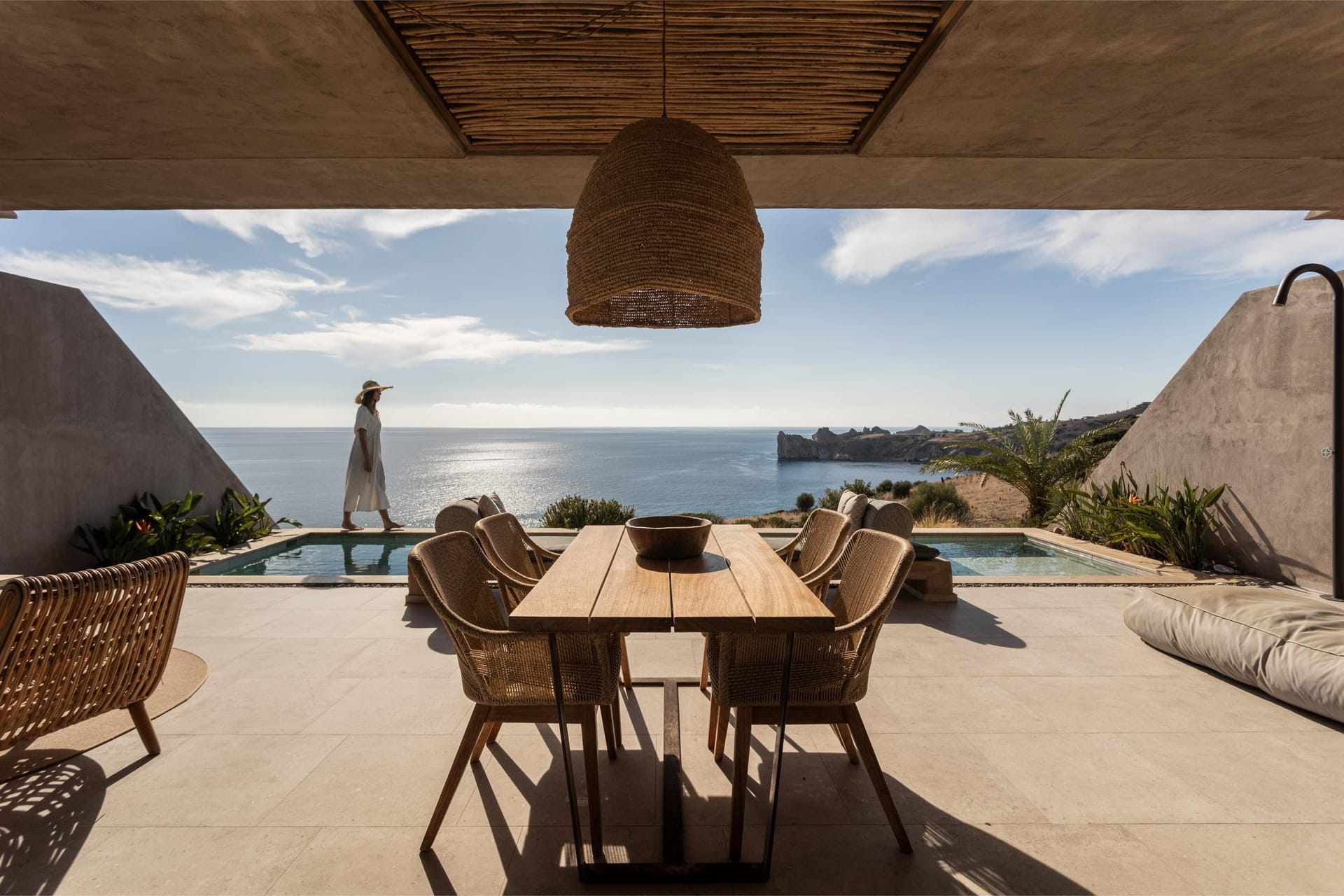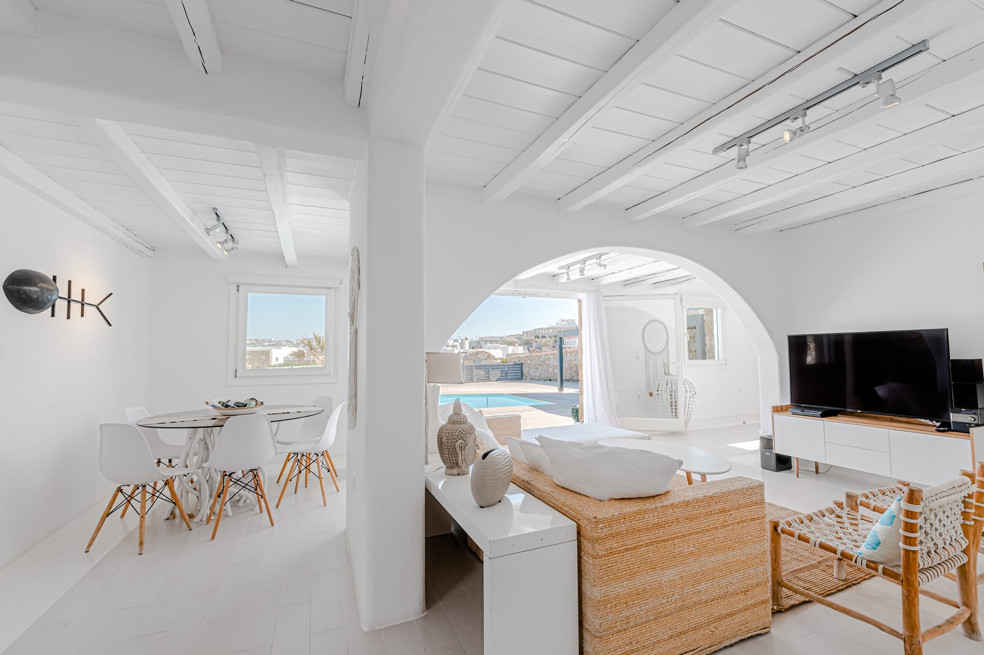 Indoor and outdoor luxury is foremost in this villa to delight in Mykonos style. The grand covered outdoor terrace commands a spectacular view which you can enjoy seated in the comfortable outdoor living area. Inside, enjoy casual snacks or morning coffee at the breakfast table next to the modern kitchen. Fully equipped, the kitchen has everything you need to prepare a feast for your guests. The indoor dining area and living room are open and spacious with windows and doors which open to the view.