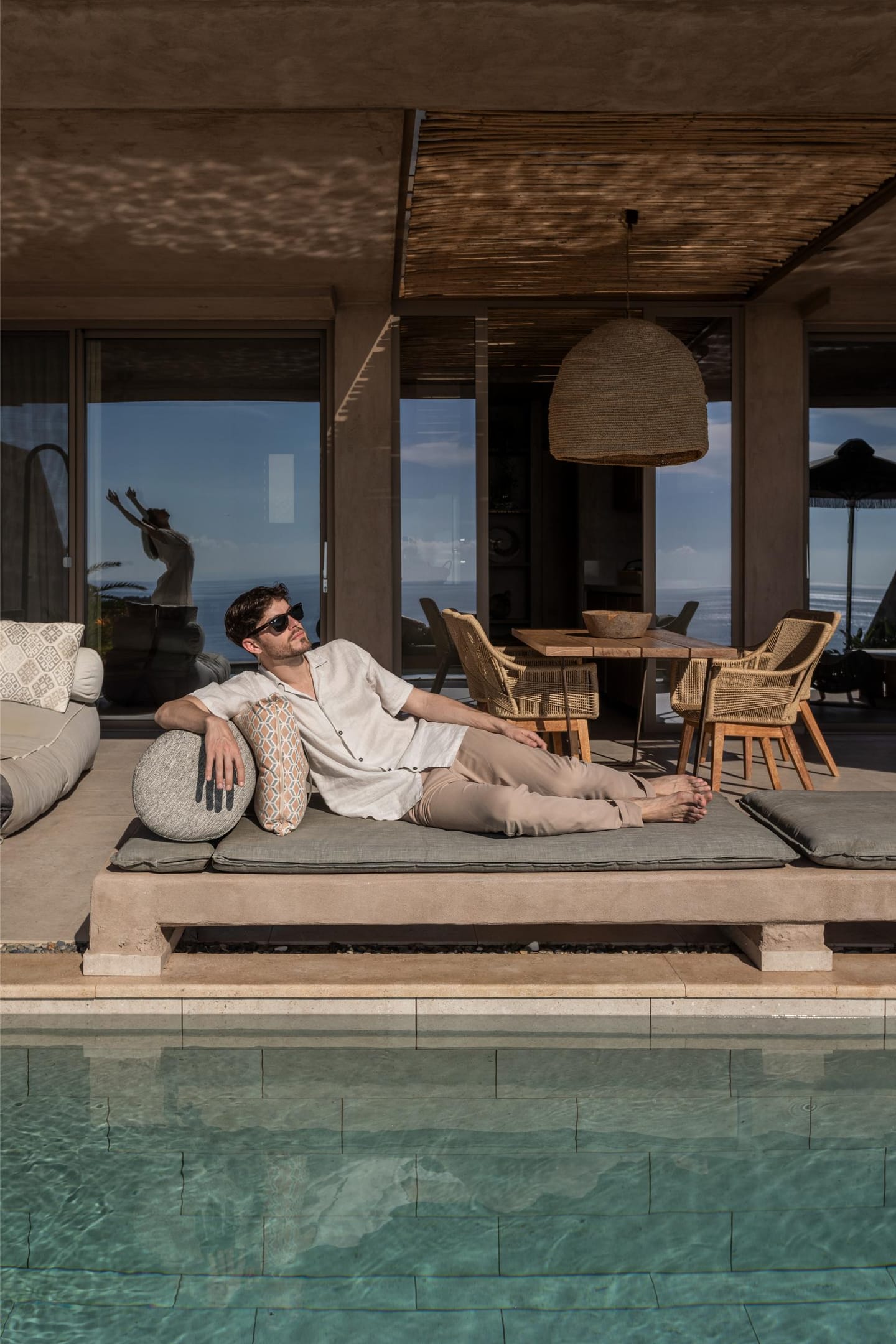 🛋️ Living area with Multiple seating areas and French doors opening to the patio and pool