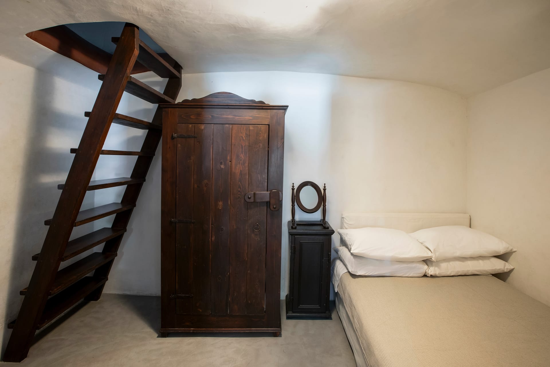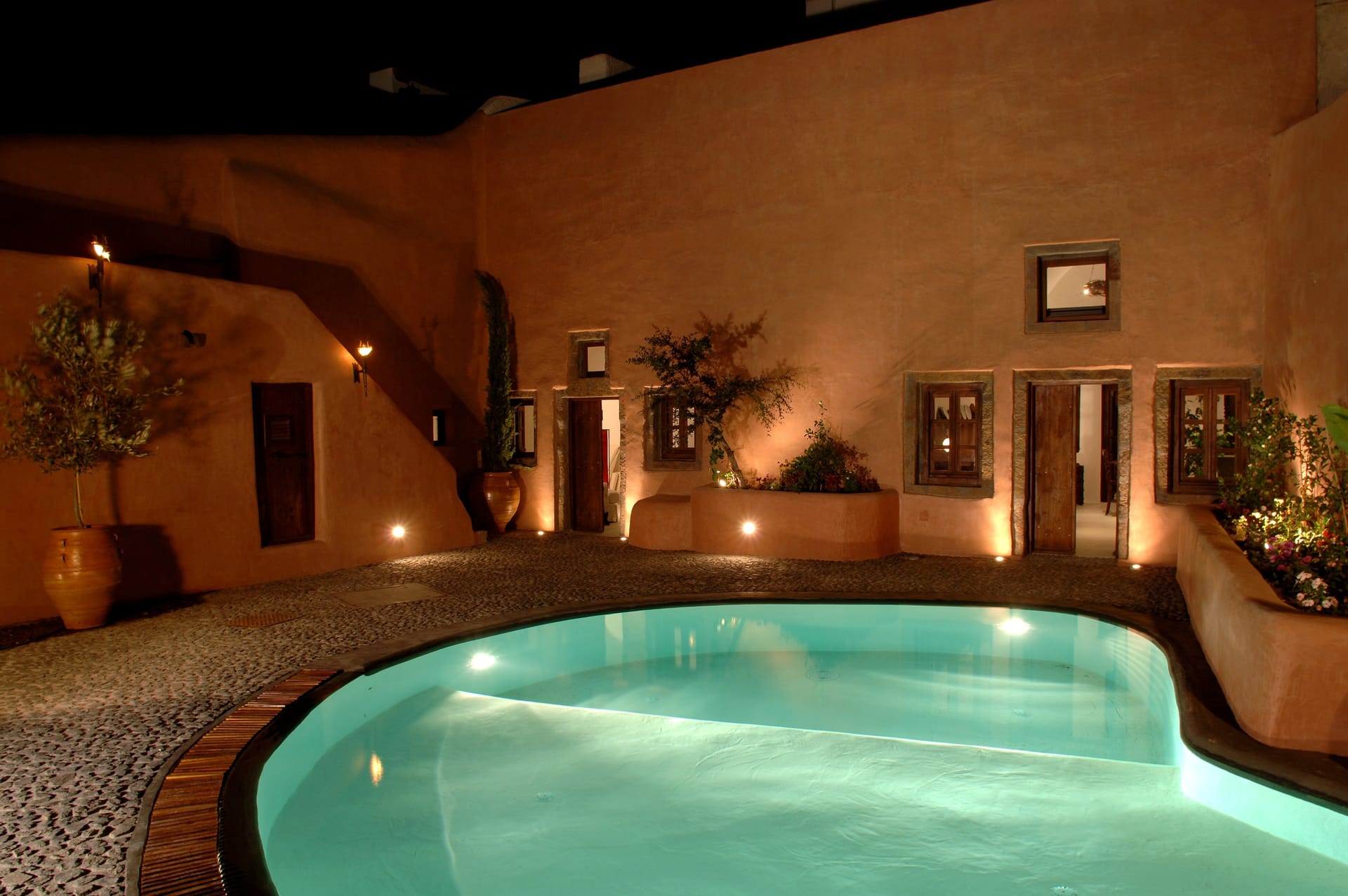 The old school house has been sensitively renovated, preserving the original organic shape and proportions of the smooth walls, vaulted ceilings and arched openings of the existing building. These elements remind you of how the building was constructed, in the old Santorinian tradition of carving buildings into the soft pumice-stone earth of the village hills. The layout of the house takes its cues from traditional Santorini houses, echoing the shapes and colors of the island’s unique architecture.