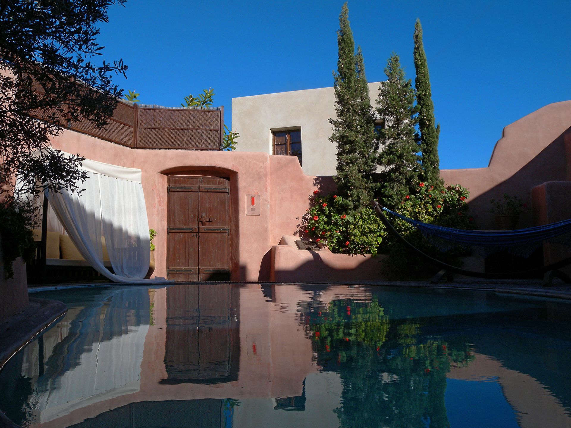 The vibrant red plaster walls of the private cobbled courtyard are dazzling; the perfect complement for the sparkling blue pool.