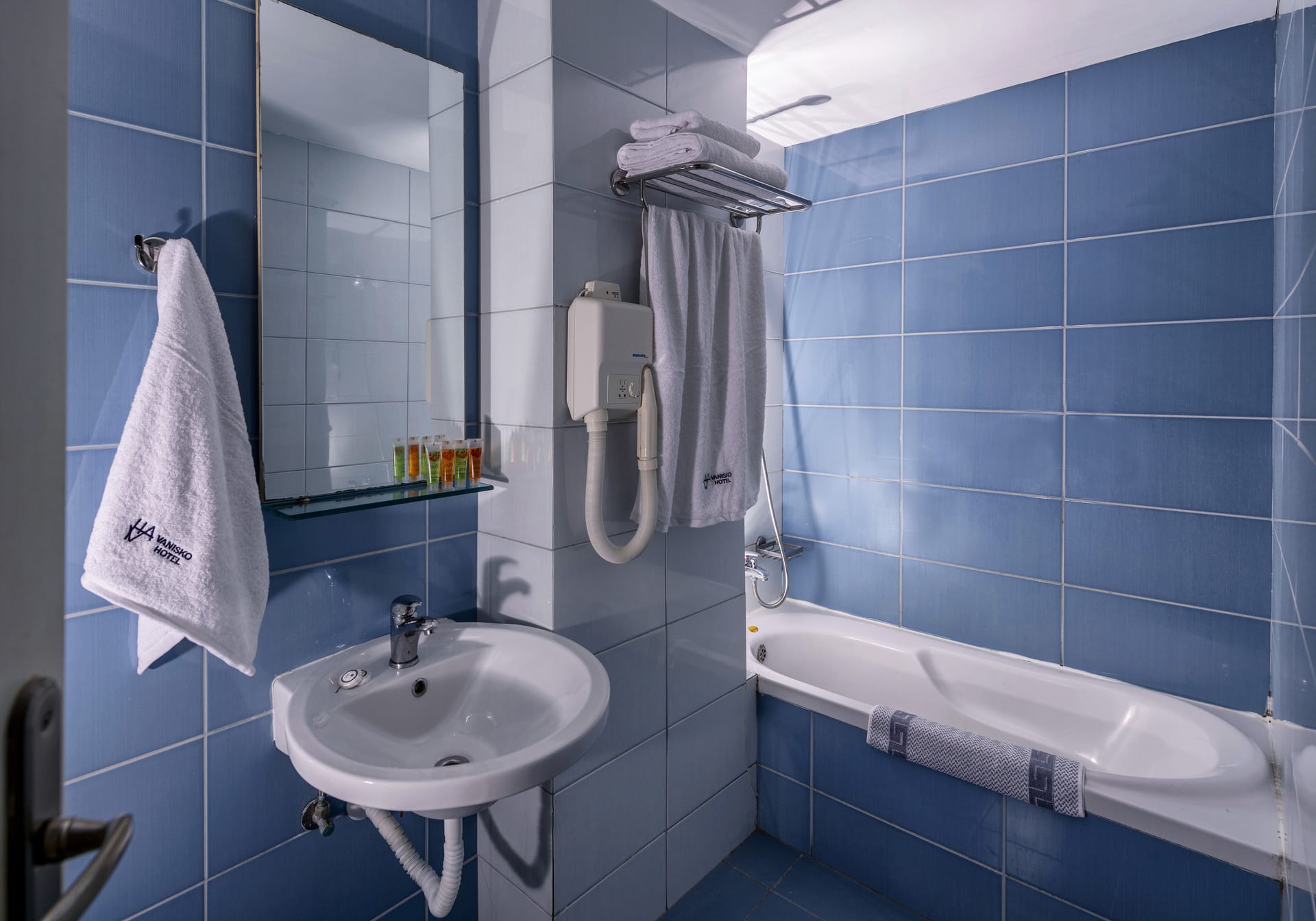 Standard quadruple room with two single beds and one double bed. With balcony and privet bathroom.