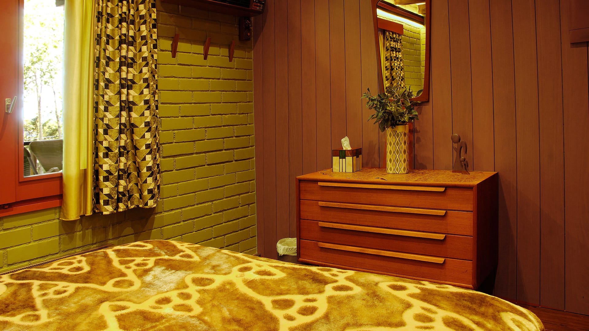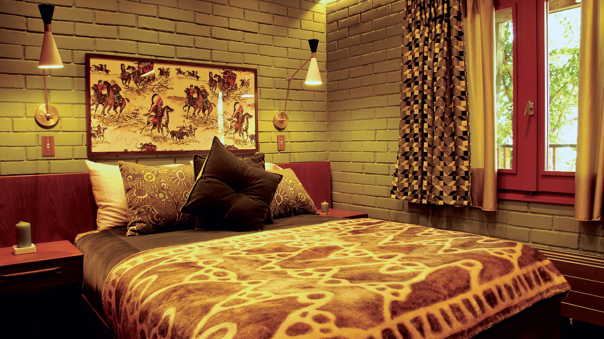 Laurel Canyon has a sitting area, day bed, lounge chair and ottoman, foot stools, cabinet, bedroom with queen-size bed, bookshelf with good reading, hanging wardrobe, chest of drawer and bathroom with shower.