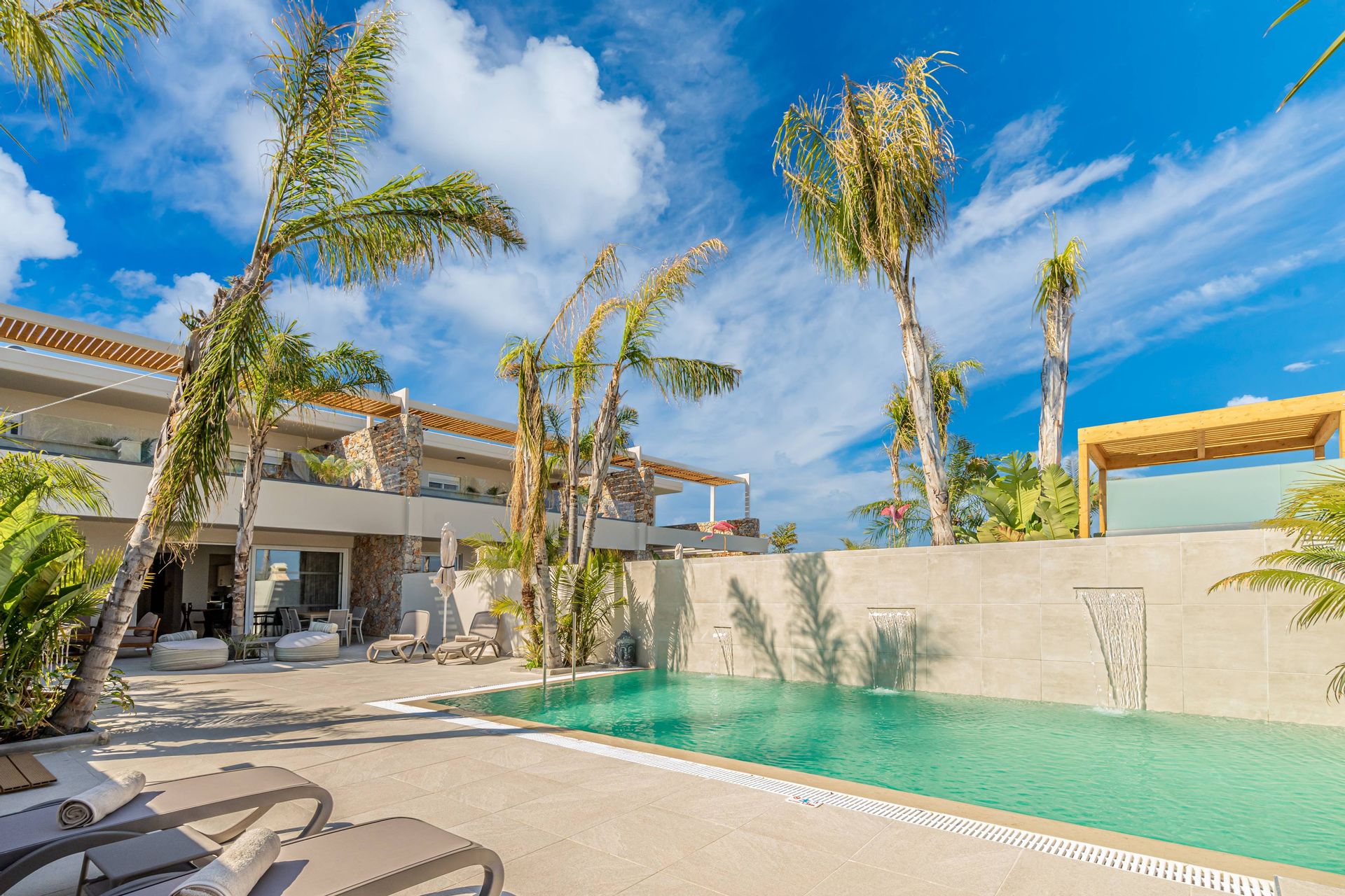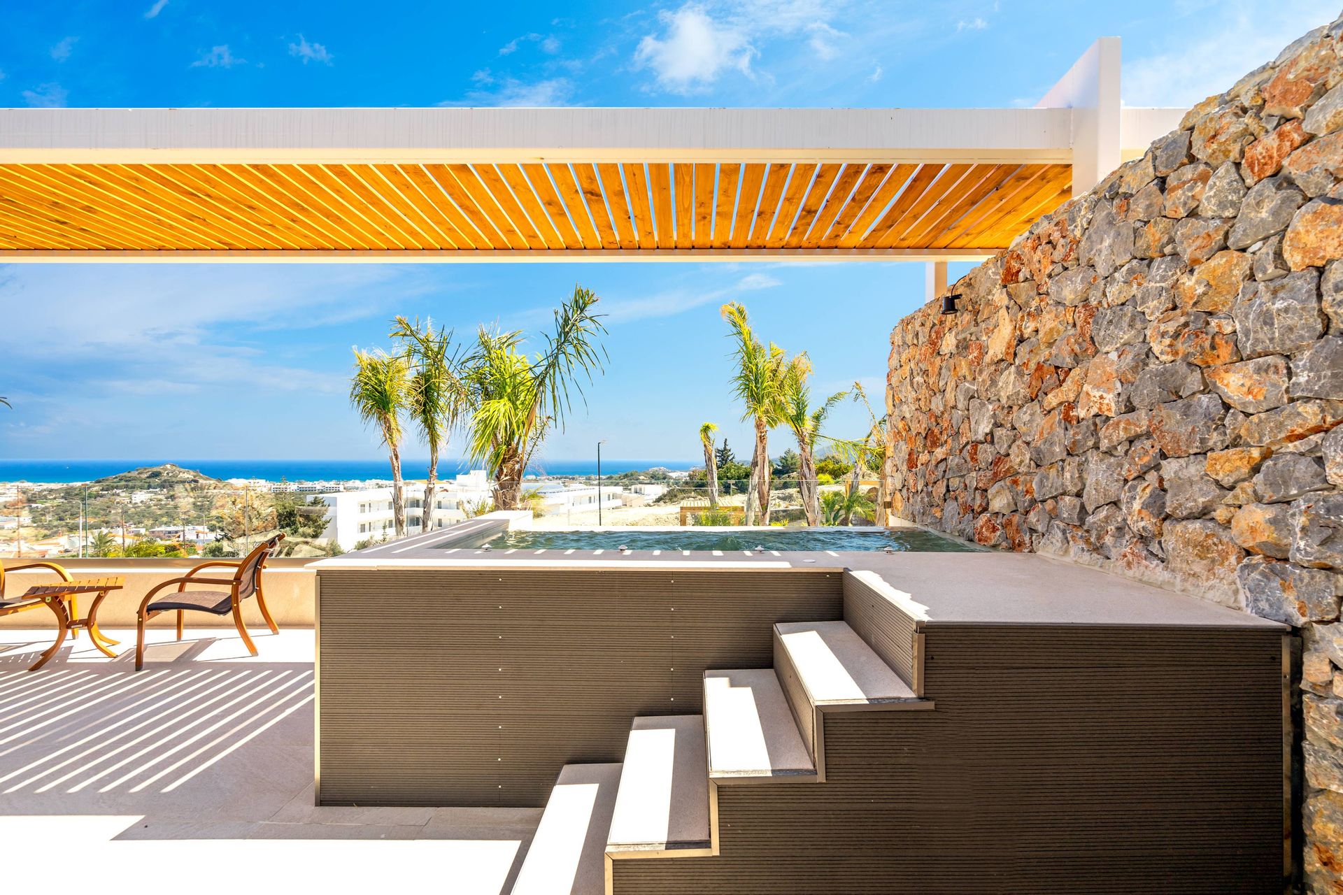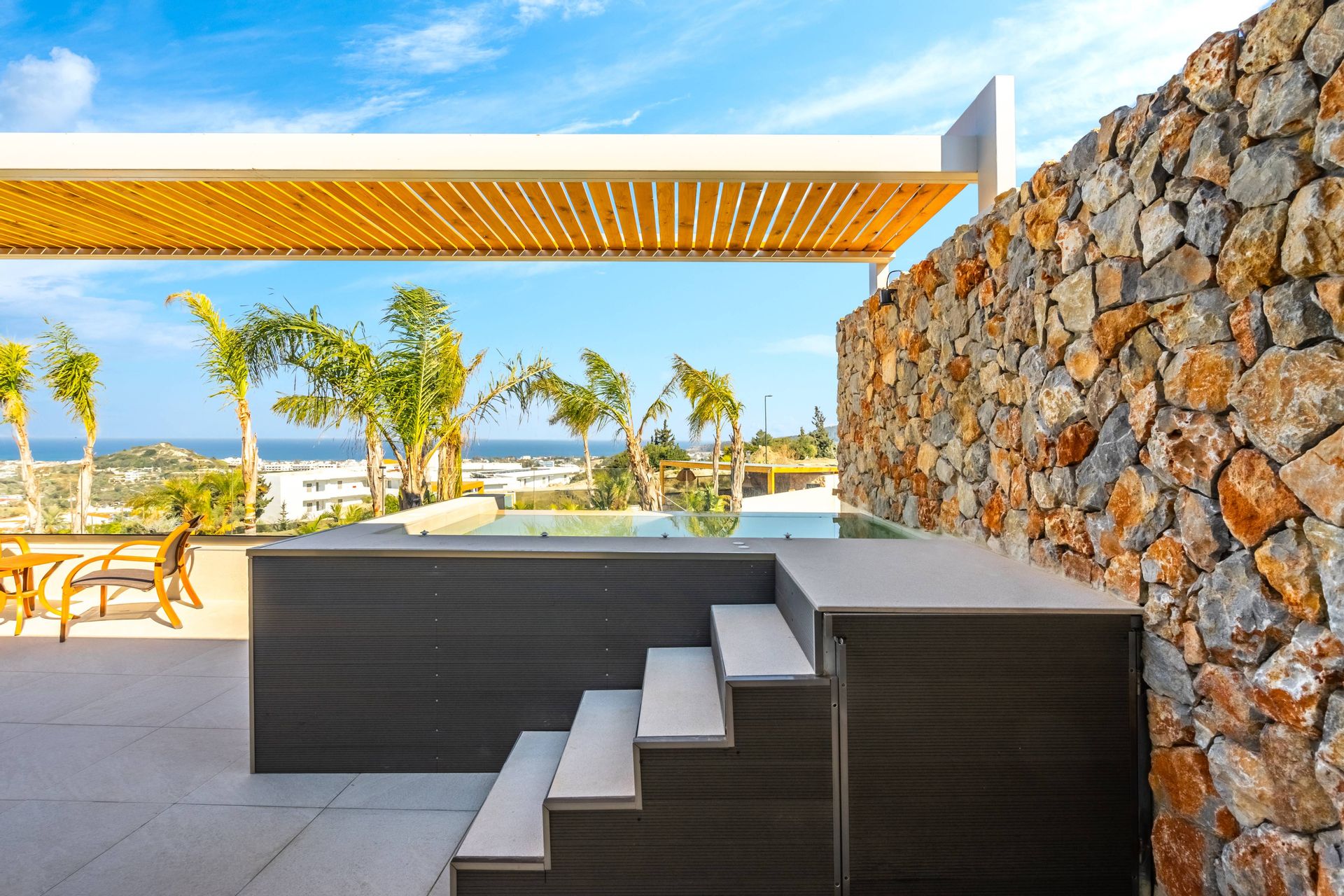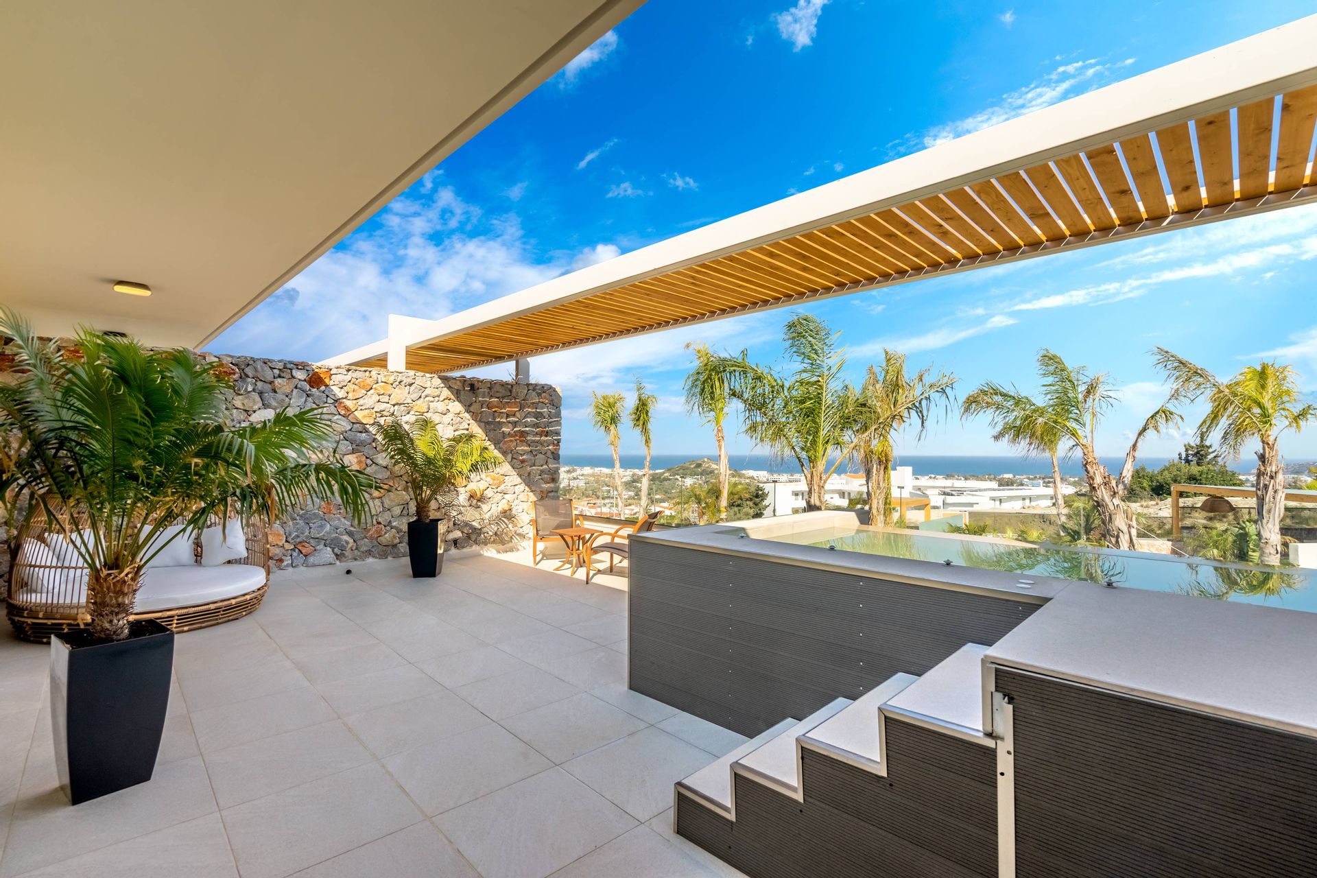 The Executive Luxury Villa at Venezia Luxury Living offers an exquisite blend of sophistication and comfort, designed for those who seek an exclusive retreat in the heart of Rhodes. This stunning villa features elegantly furnished interiors with high-end finishes, creating a space that is both stylish and inviting. Spacious living areas seamlessly connect to the outdoor terraces, where guests can relax while soaking in breathtaking views of the Aegean Sea. Every detail, from the contemporary decor to the state-of-the-art amenities, ensures a stay that is both indulgent and serene.