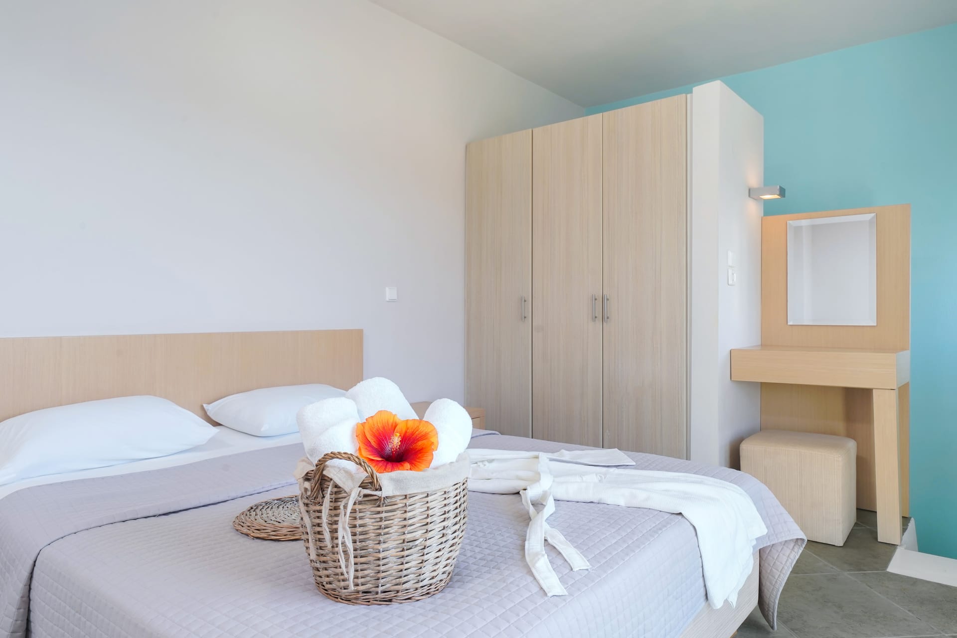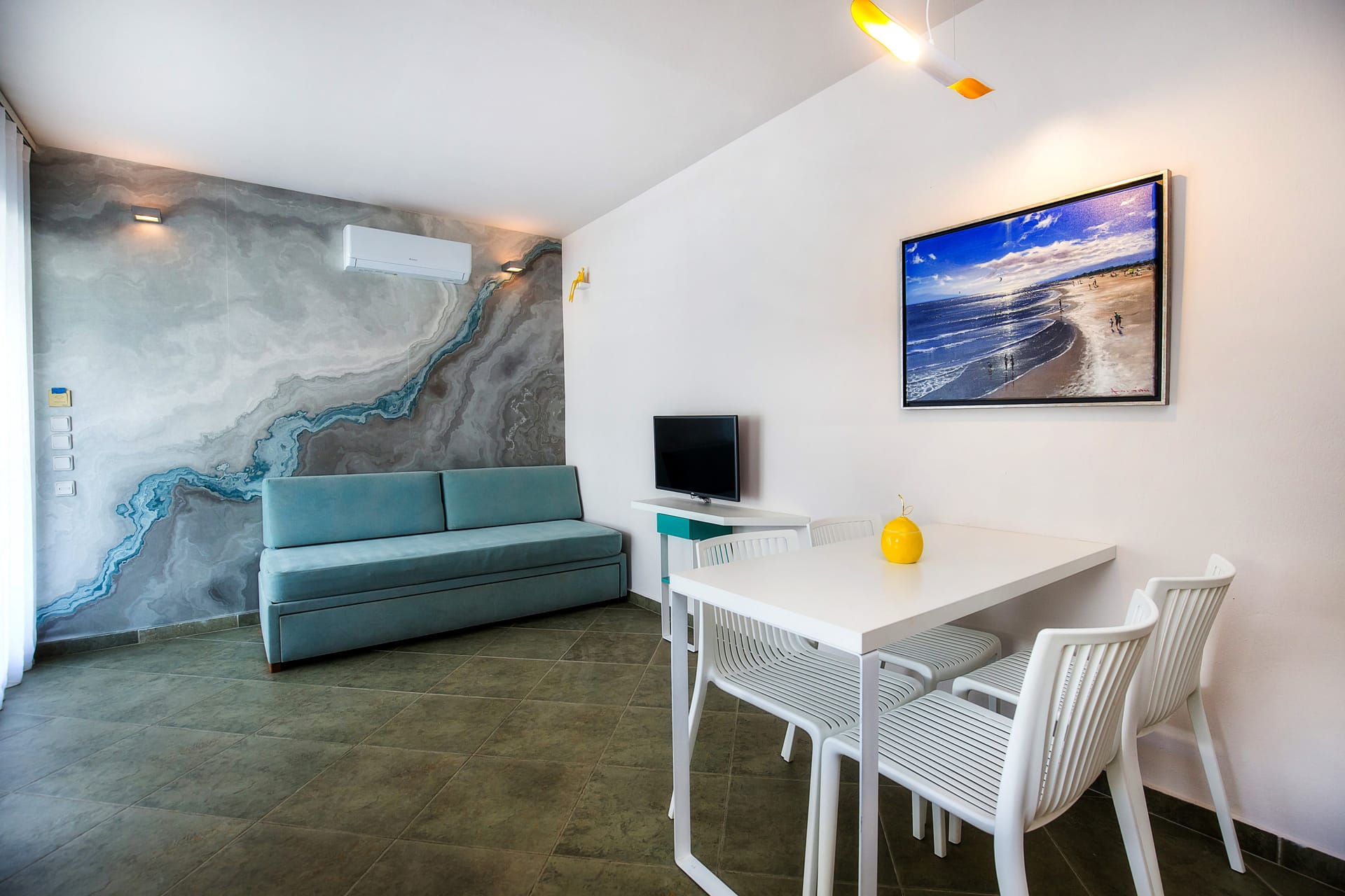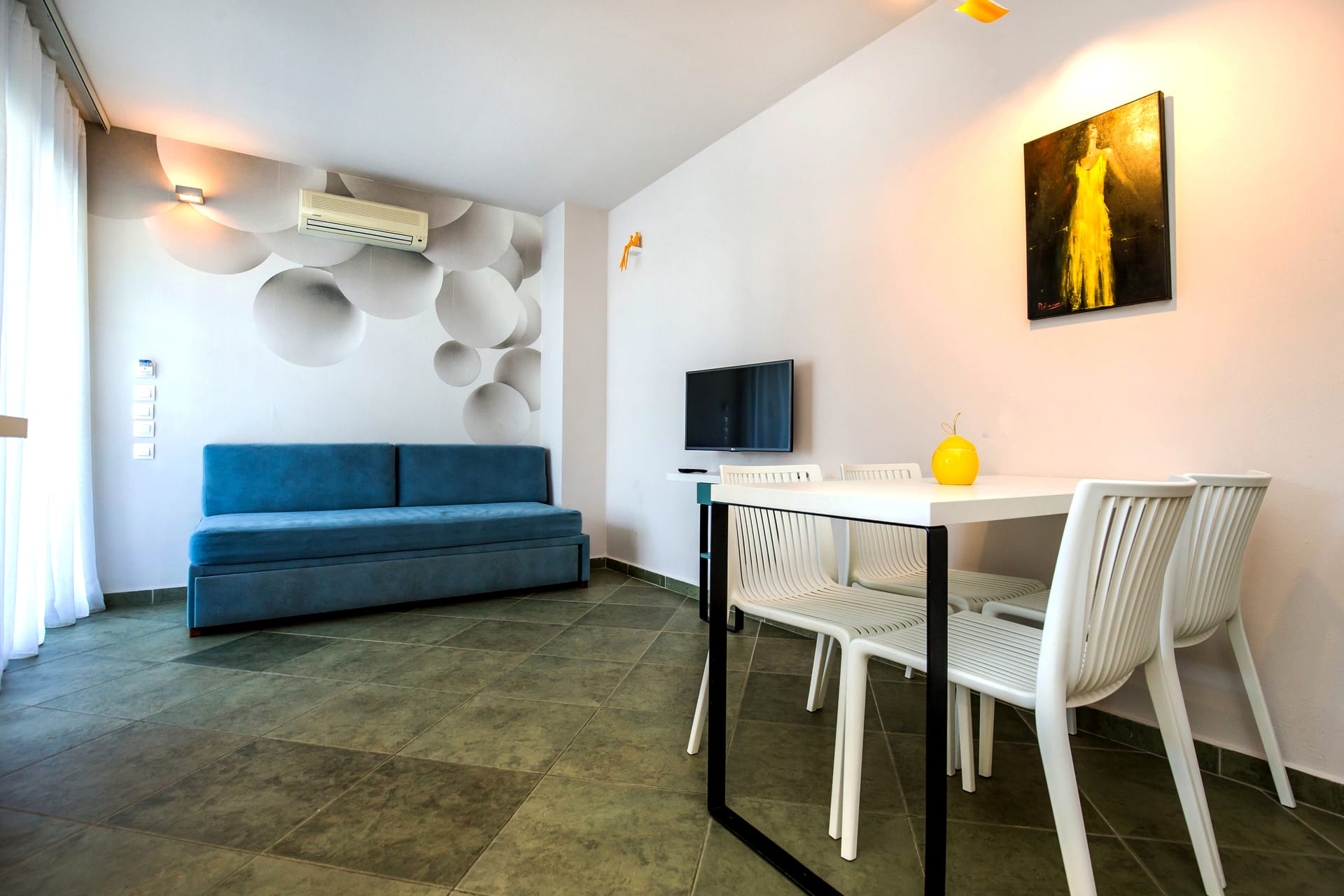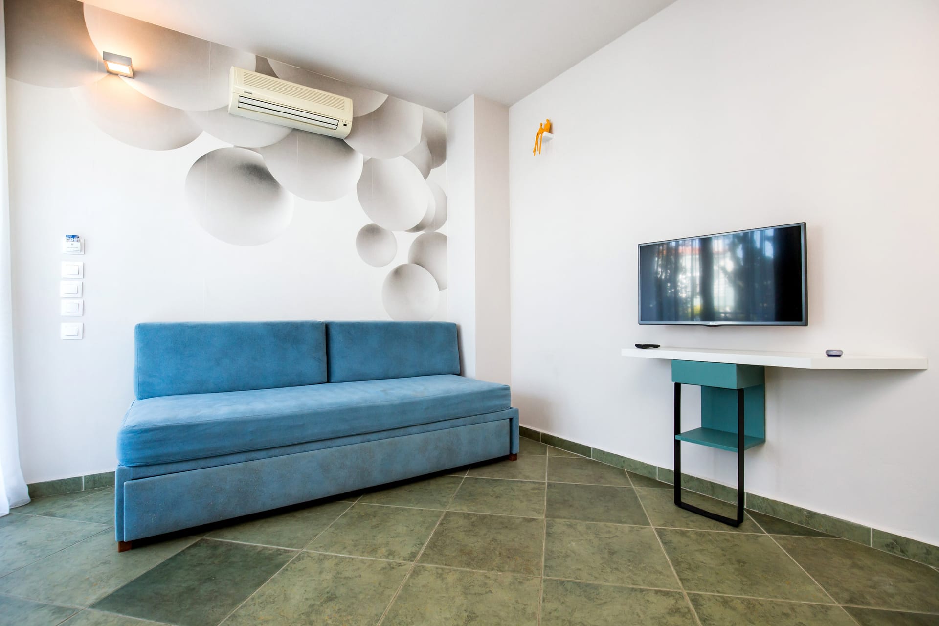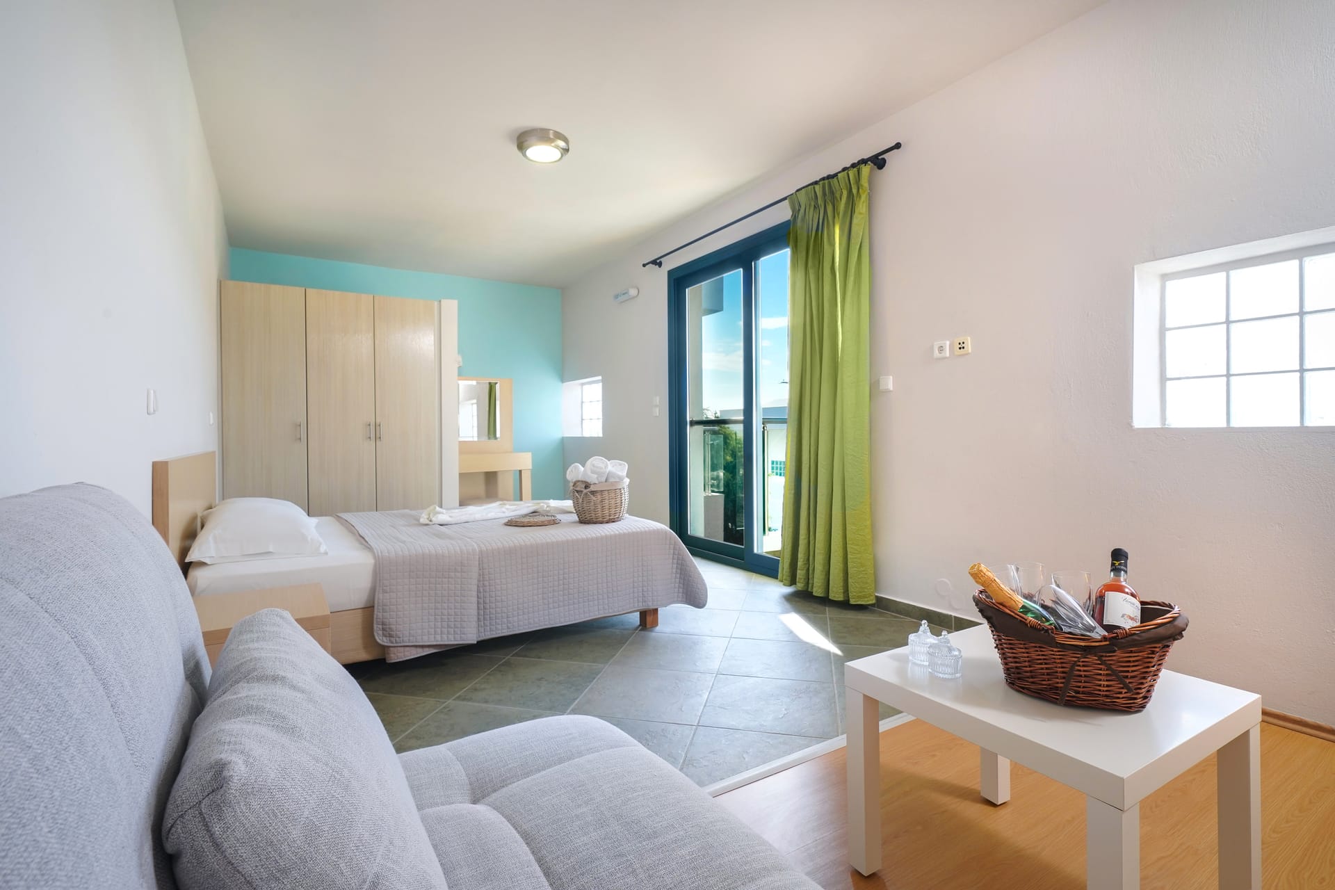 Indulge in our double space suite, featuring a comfortable double bed, two sofa beds, private bathroom, and fully equipped kitchen. Enjoy complimentary toiletries, air conditioning, and a veranda with a scenic garden view inviting you to unwind and relax.