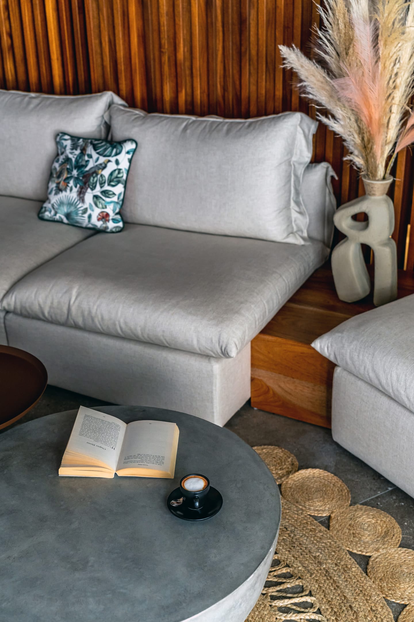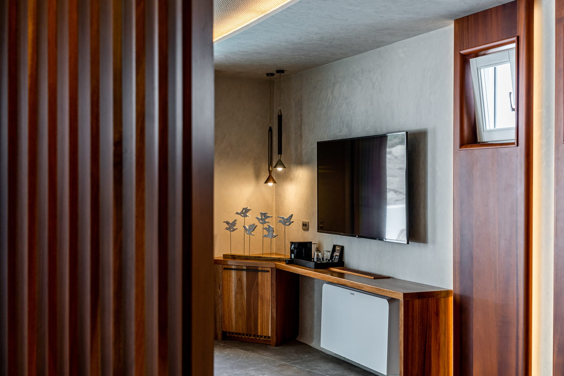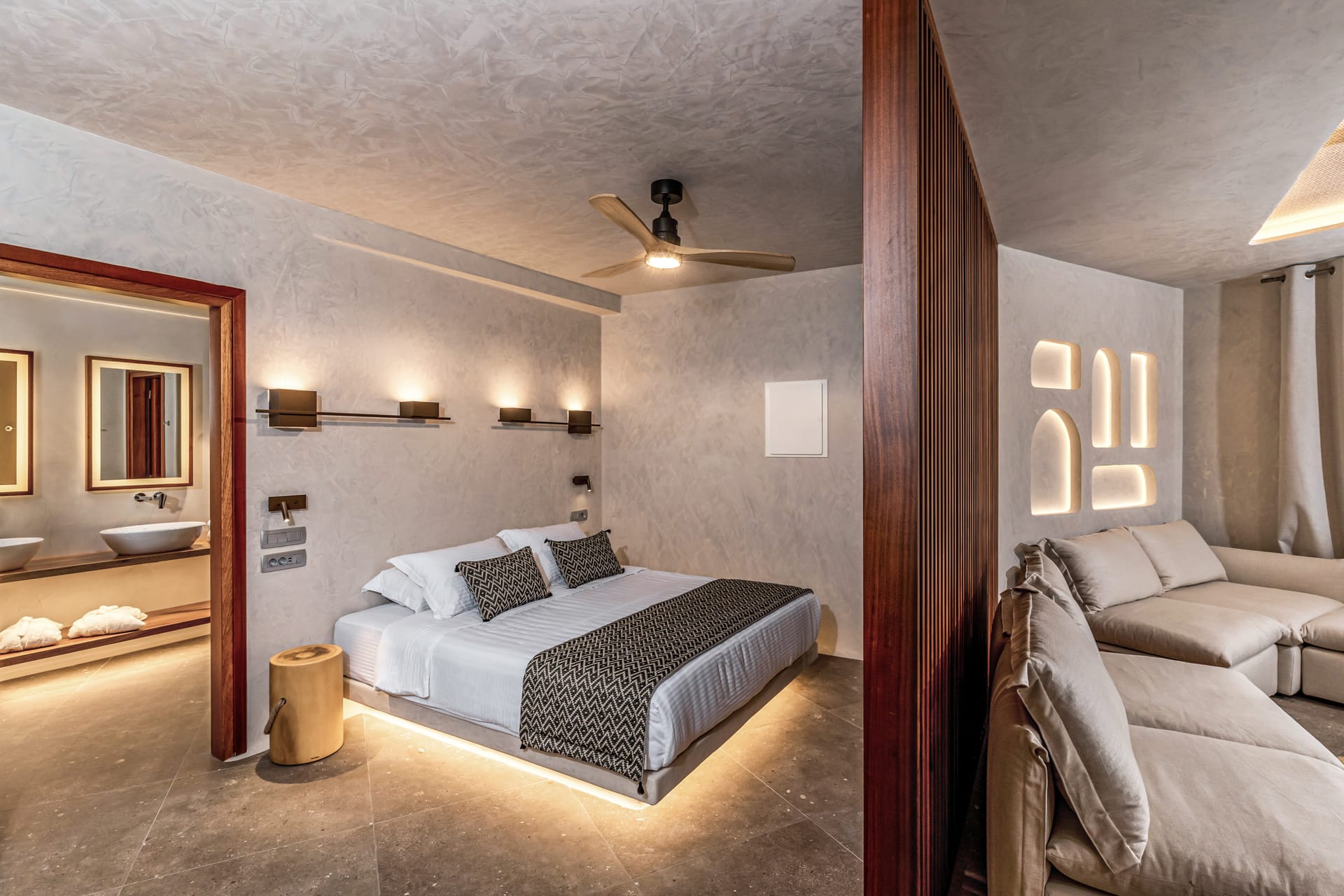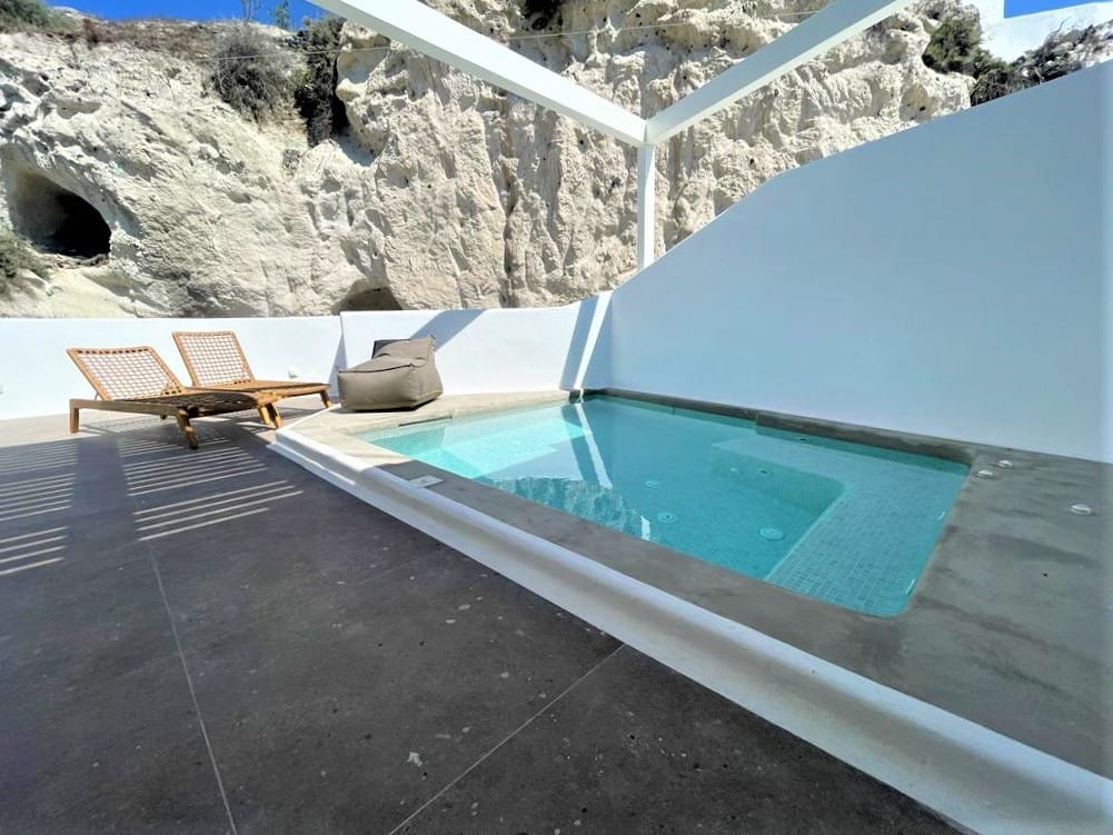 Intimate and luxurious, our Suite with heated Plunge Pool is truly a gem of boutique hospitality. Enjoy the tranquility of Vothonas right next to the island’s vibe but away enough from its buzz, bathe under the sun into your private plunge pool and sleep peacefully on a first-class King-size bed (without end). The large sofa of the open-plan living room may accommodate a 3rd person, making this room an ideal choice for a family of 3 or a group of friends looking for a relaxing & comfortable Santorinian getaway. Among its amenities you will find a Smart-TV, autonomous air conditioning, complimentary Wi-Fi and minibar/Nespresso appliances.