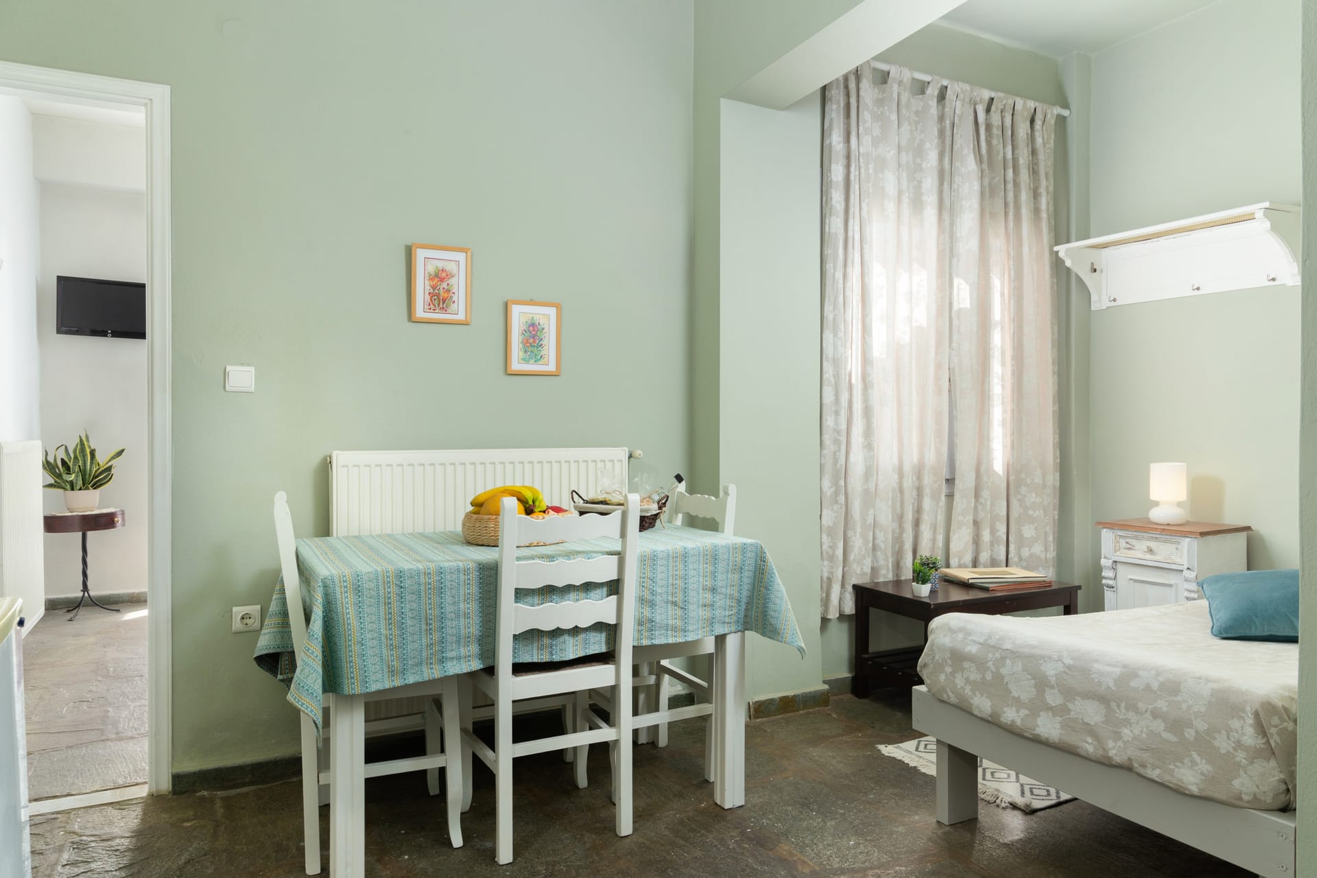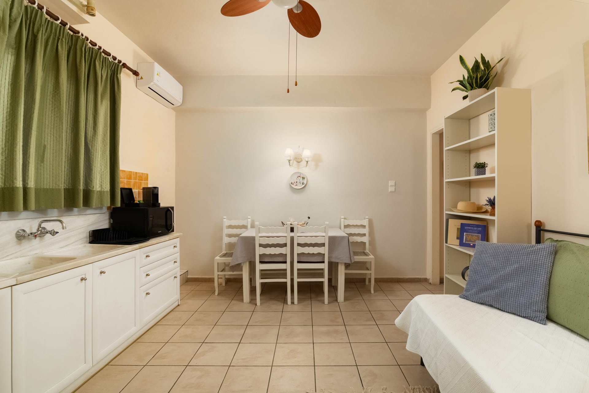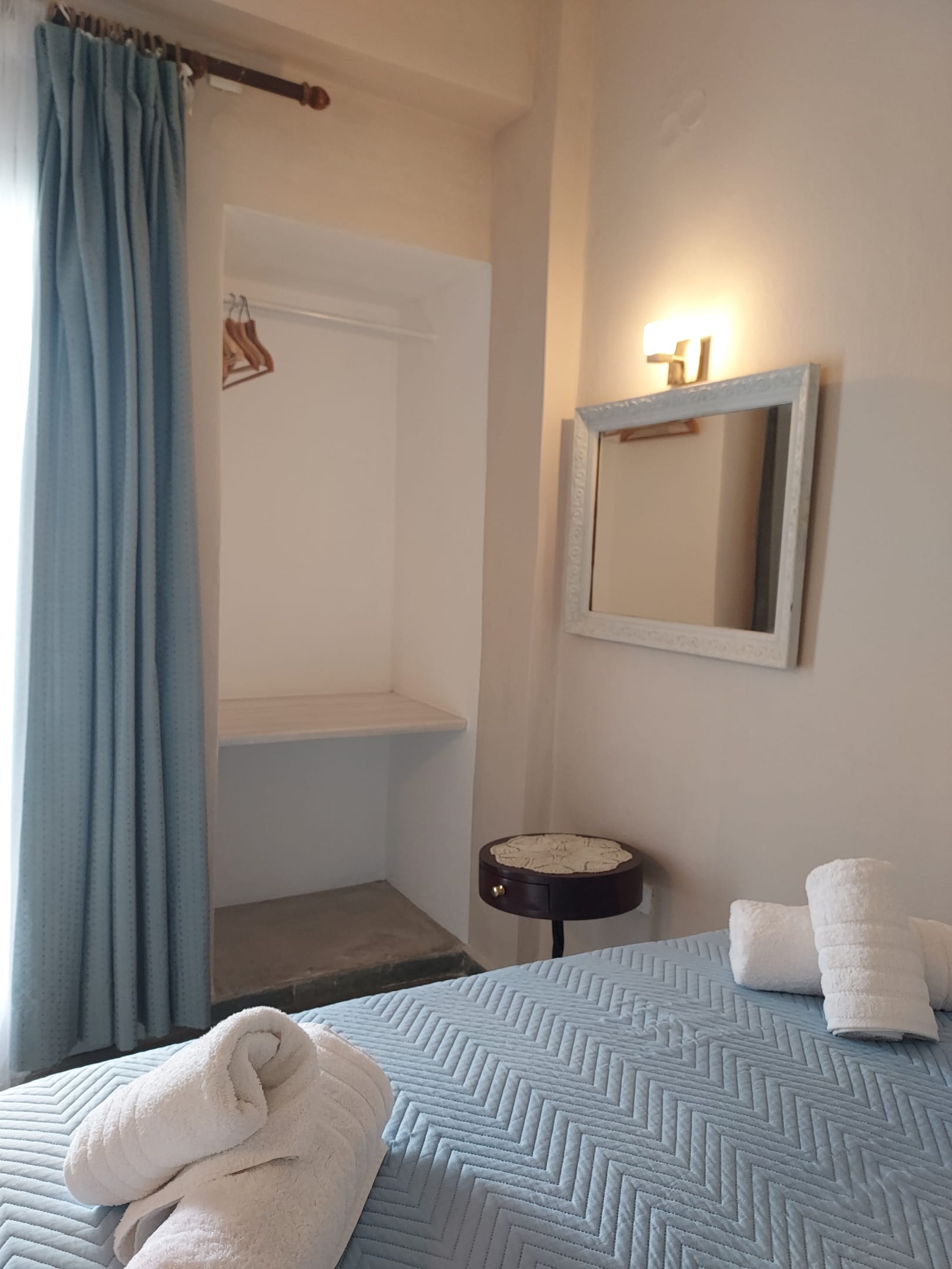 These apartments feature a spacious terrace with beautiful views—ideal for enjoying both the sea and the village. They accommodate 2 to 4 guests and include a separate bedroom with a large double bed, while the kitchen area offers single beds for additional sleeping space. The terrace is furnished with outdoor seating, so you can relax with the view and comfortably enjoy your coffee or meals.