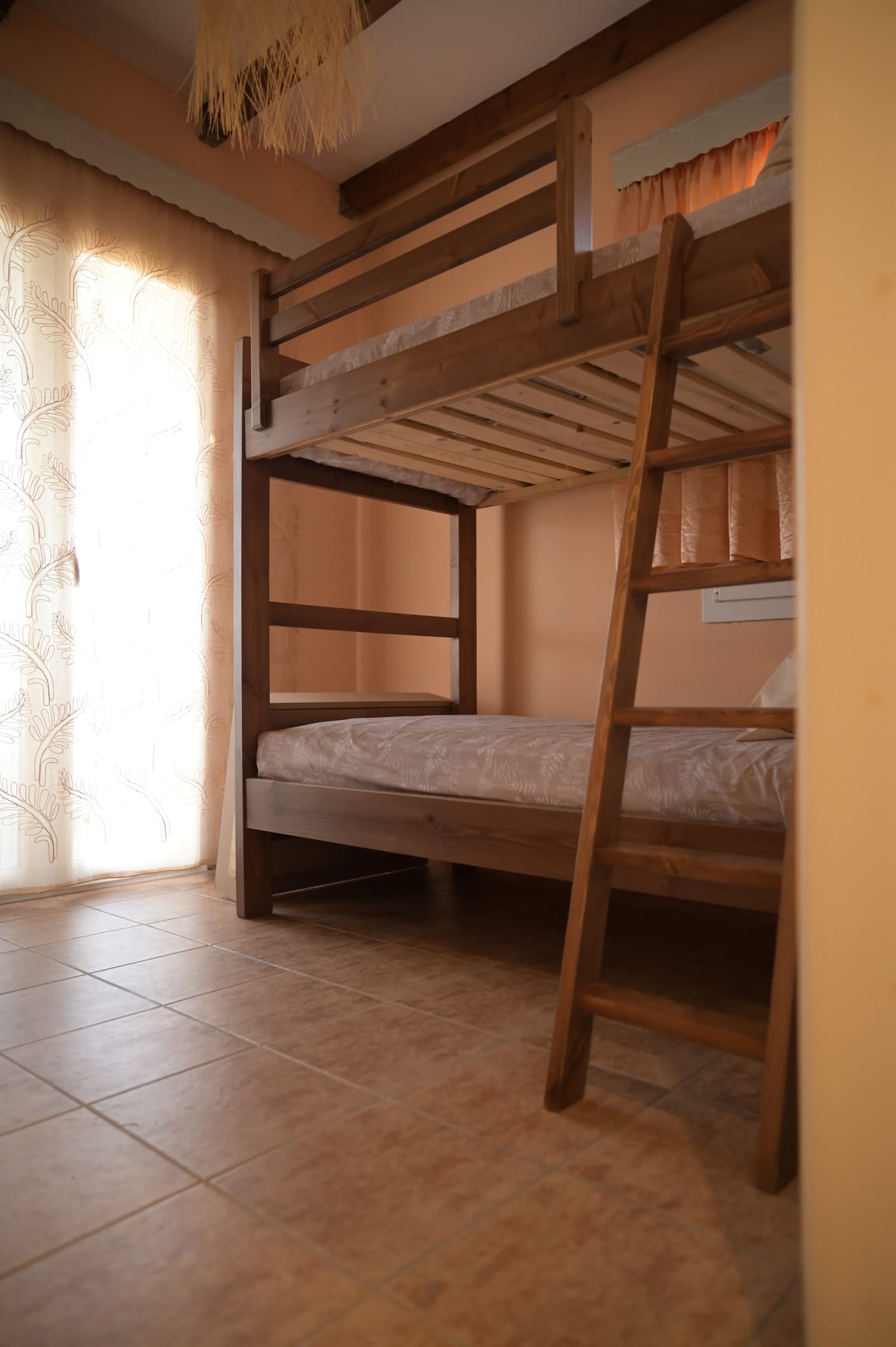 Fully equipped second floor apartment with balcony 1 double bed and 2 bunk beds.
