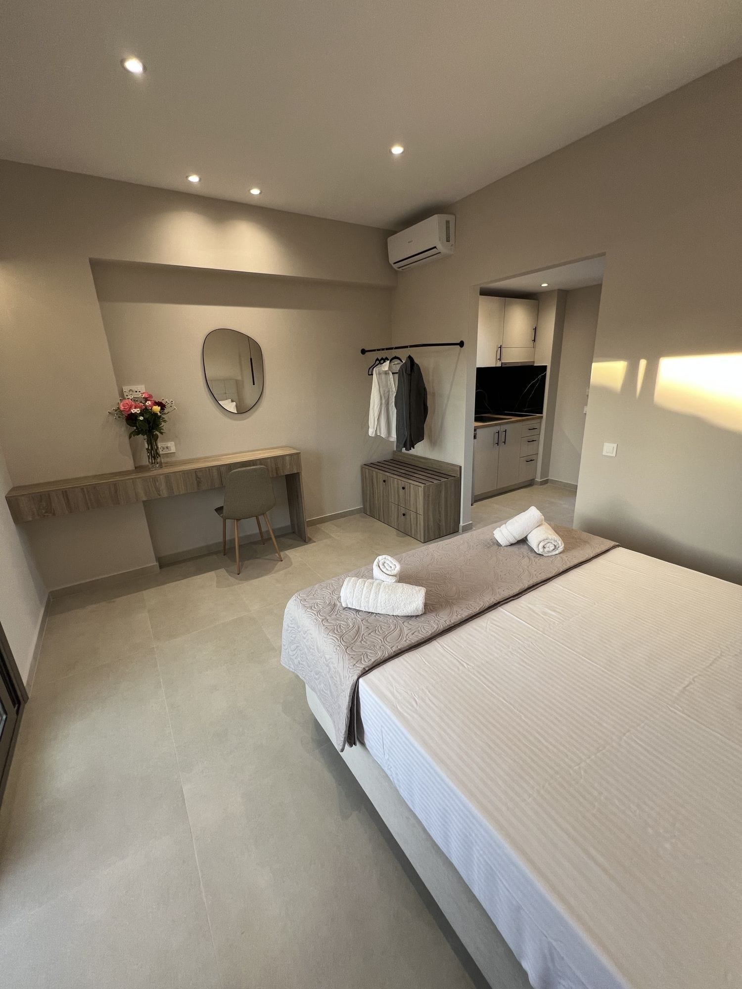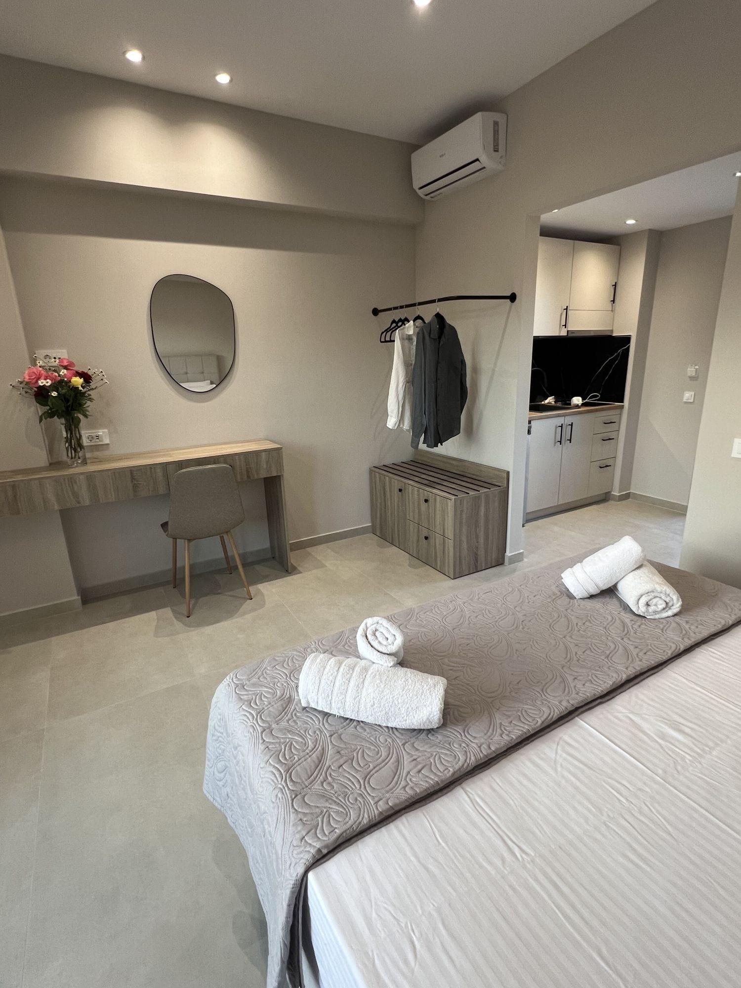 Each deluxe room includes a double bed, air conditioning, WiFi internet access, flat screen TV, bathroom with shower , well equipped kitchen with electric rings, small oven, small refrigerator, toaster, electric kettle and furnished balcony overlooking the garden. It can accommodate up to 2 people.