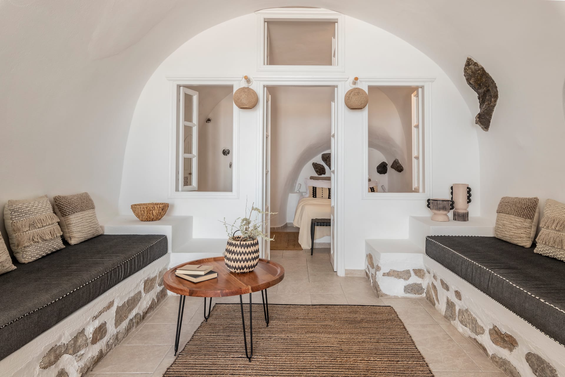 Nestled in the Annex Building, just 600 meters from the main property, this elegant cave suite offers a tranquil escape for two. Featuring a cozy sitting area, a luxurious queen-size bed, and a private outdoor heated jacuzzi, it’s the perfect retreat to immerse yourself in Santorini’s timeless charm.