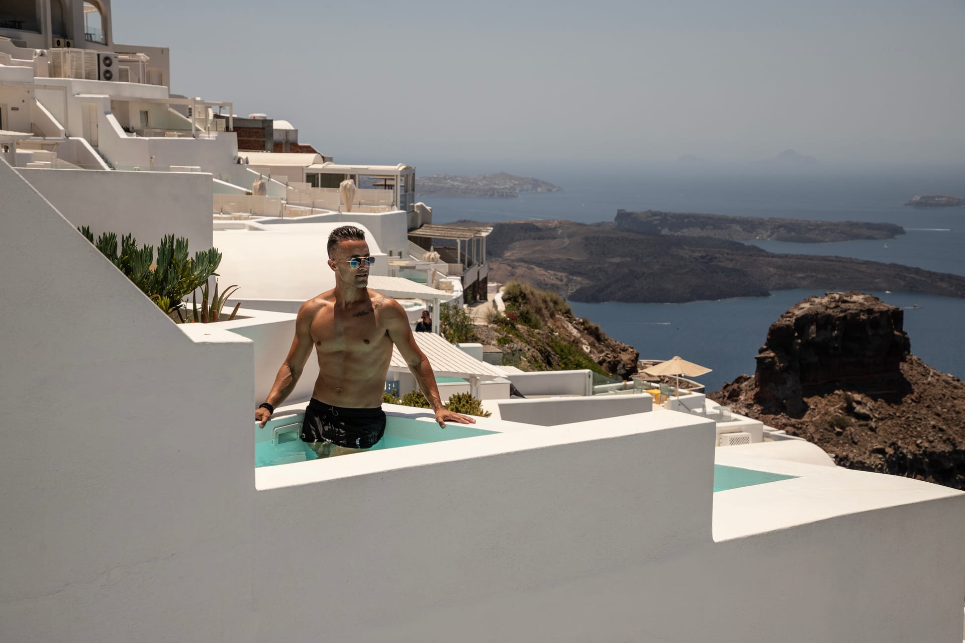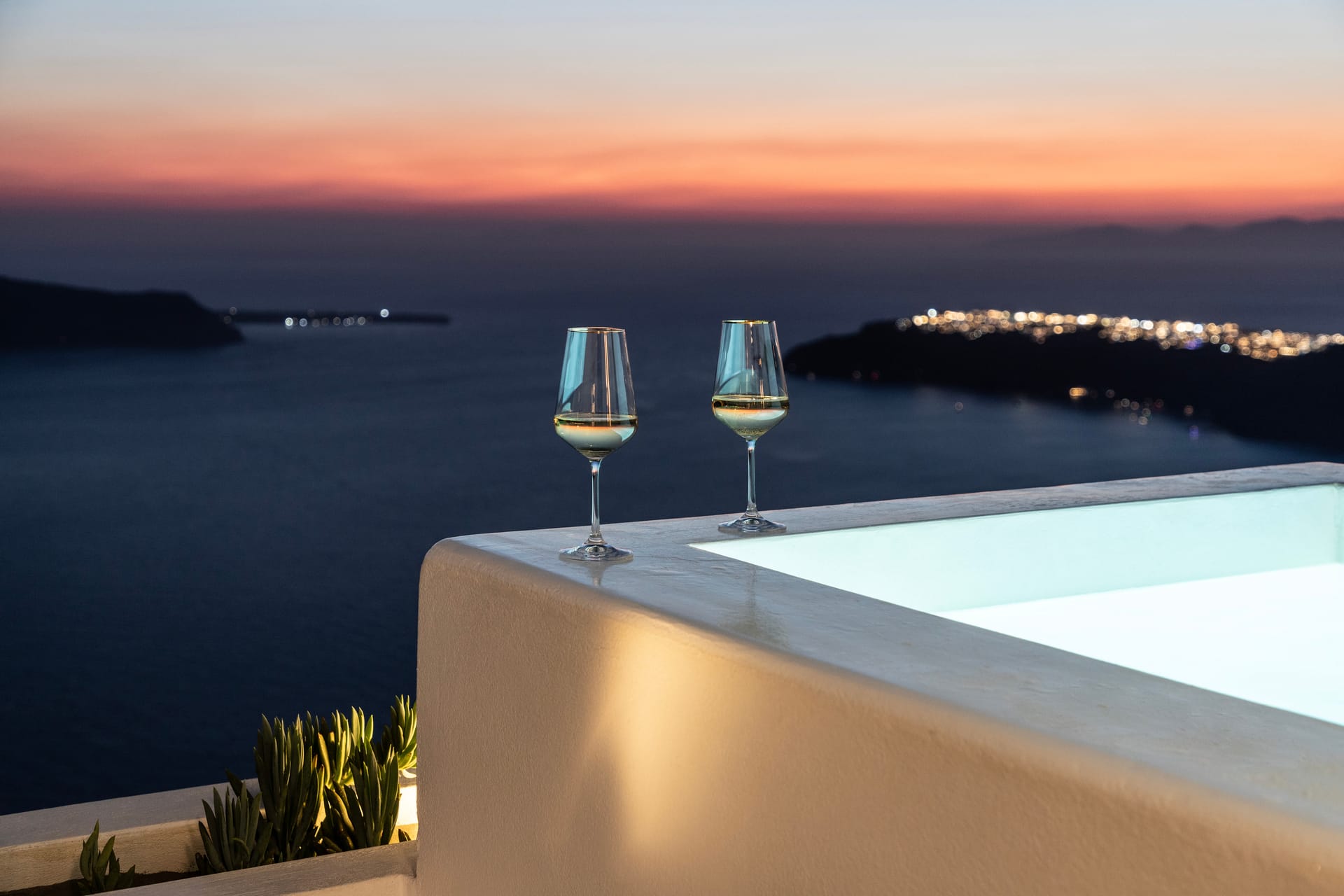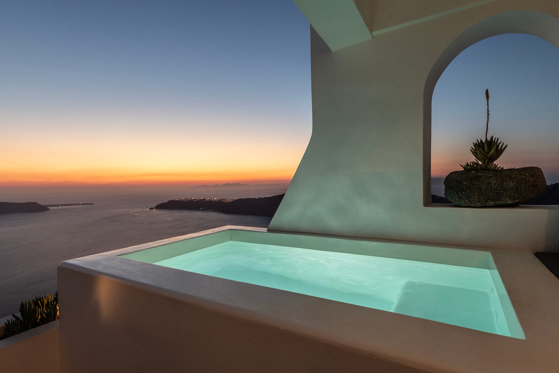Designed for romance and relaxation, our Honeymoon suite offers a private terrace with a heated outdoor jacuzzi and panoramic views of the caldera, volcano, and Aegean Sea. Located on the middle floor, it features a queen-size bed, a cozy sofa bed, a kitchenette, and a luxury bathroom. Ideal for couples, it combines comfort, elegance, and breathtaking vistas.