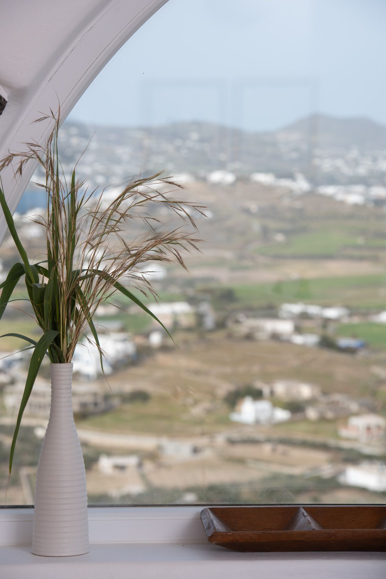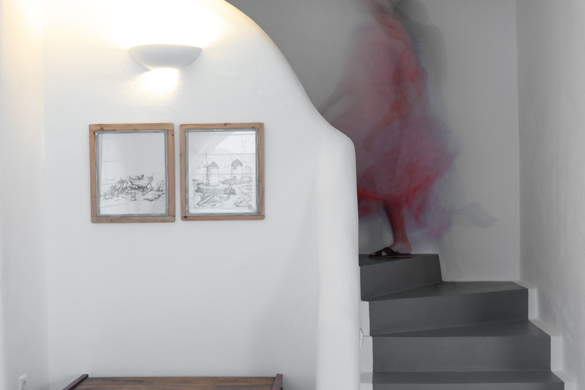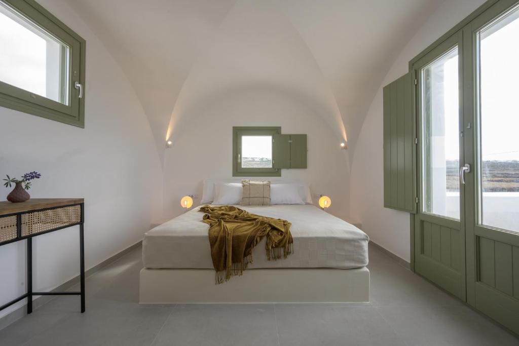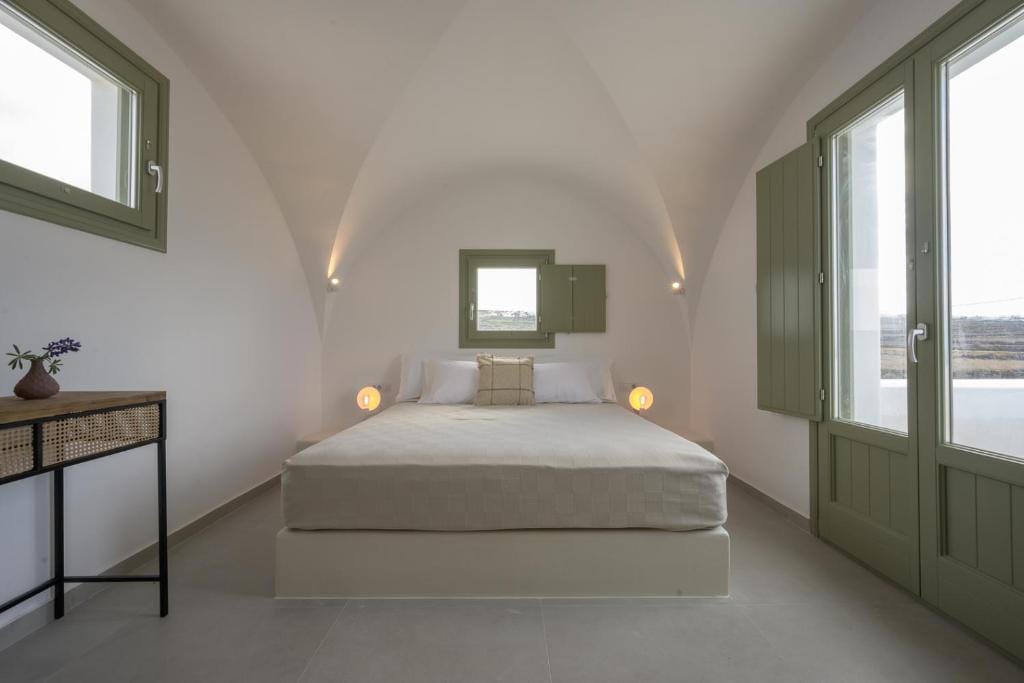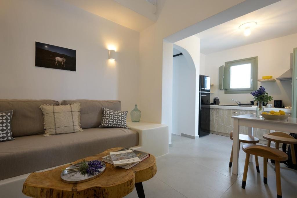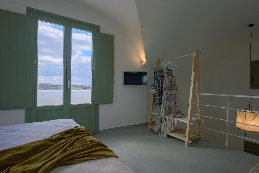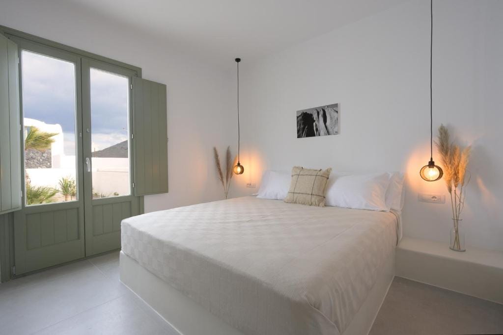 Upper floor: One master bedroom with minimal Cycladic design, windows and balcony that faces the Aegean Sea, large terrace.