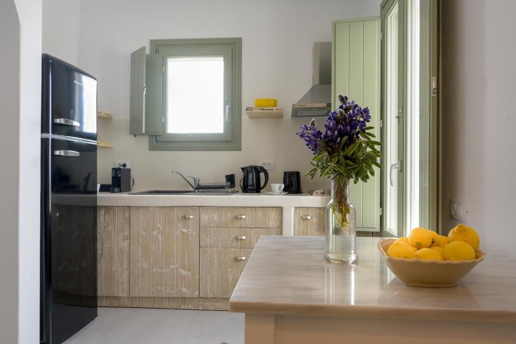 Fully-equipped kitchen with all the tools of a proper home including stove, well-sized refrigerator, mini cellar, all sorts of cooking utensils and appliances, coffee and juice machines and more. Spacious modern design with a large kitchen countertop to ensure easy and efficient cooking sessions, either alone or with friends