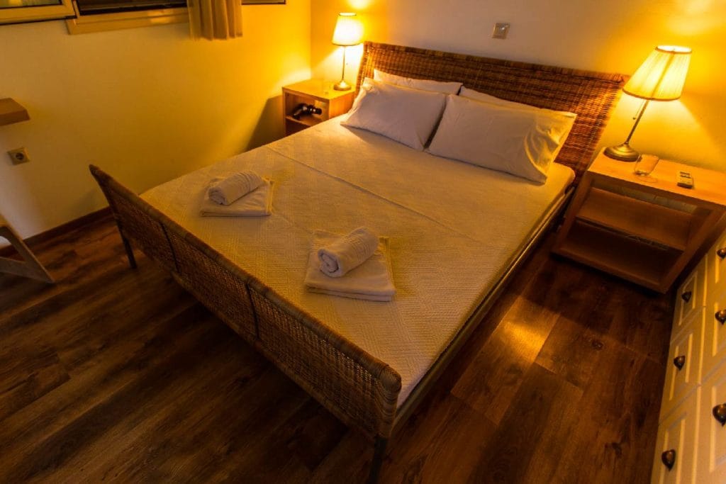 Luxury king-size bed with premium mattress and full cotton duvet and two types of pillows for a perfect night’s sleep