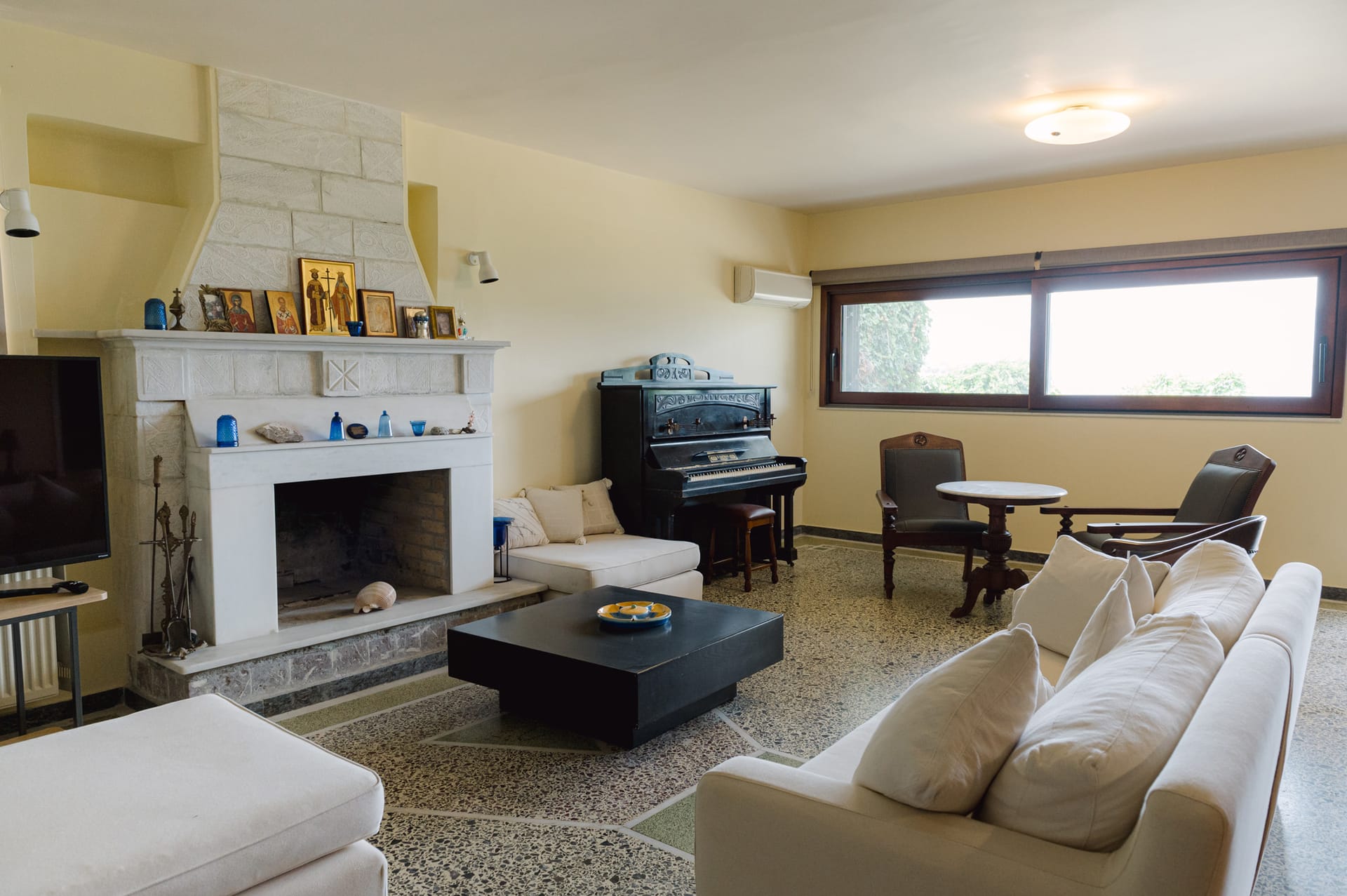 The Ground level offers 1 bedroom with a king-size bed, kitchen, big living room with a fireplace and 1 bathroom. On the 1st floor there are 2 bedrooms with a King Size bed and 1 bathroom. The balcony of each floor gives to the guests a fantastic sea view. The 2nd floor has 3 bedrooms with double beds, 2 bathrooms and a big living area with a fireplace offering an unobstructed sea view. With an internal elevator each guest has a direct access to all floors of the villa. The separate guest house has 1 bedroom with a king- size bed, kitchen and 1 bathroom.