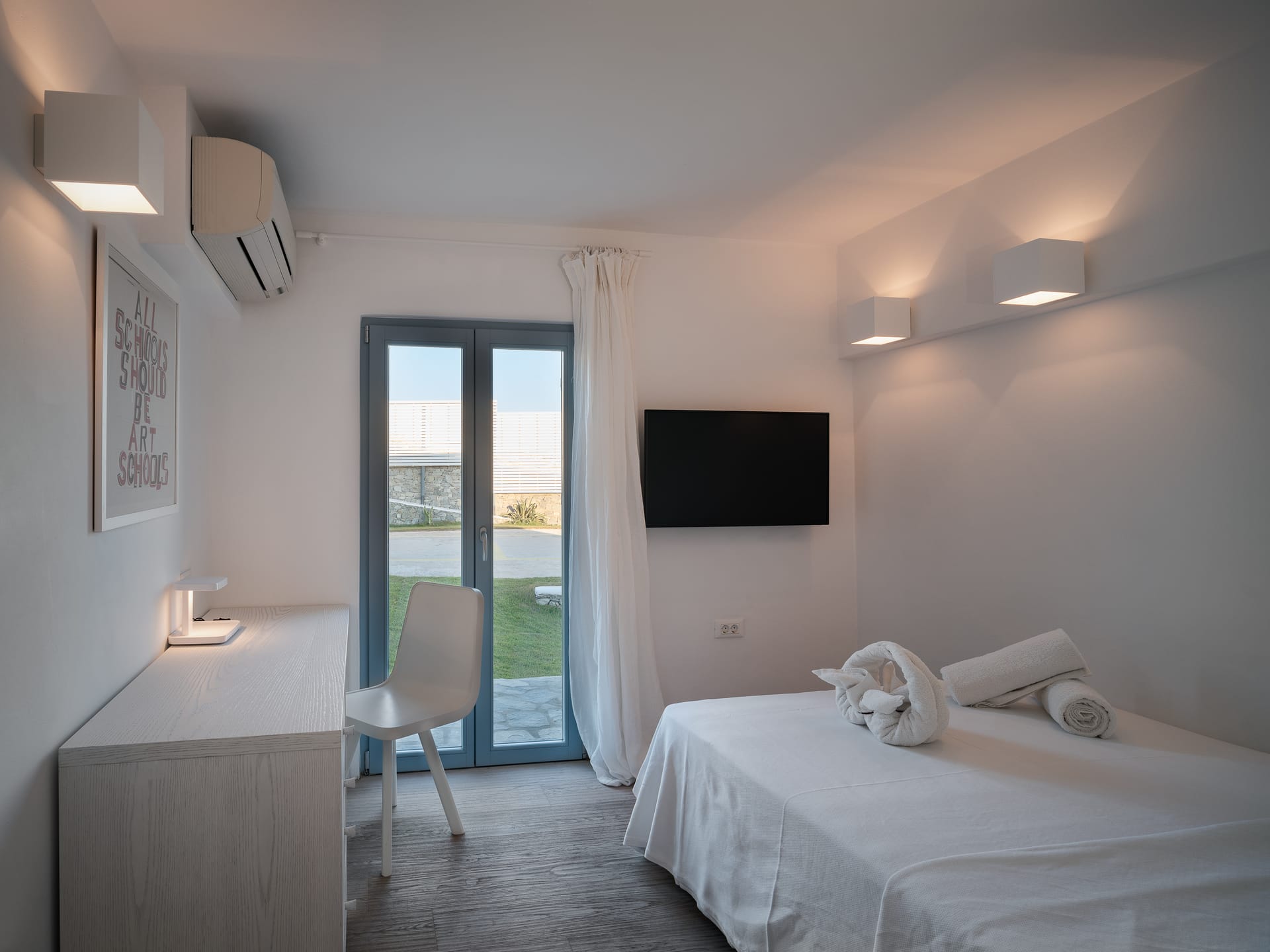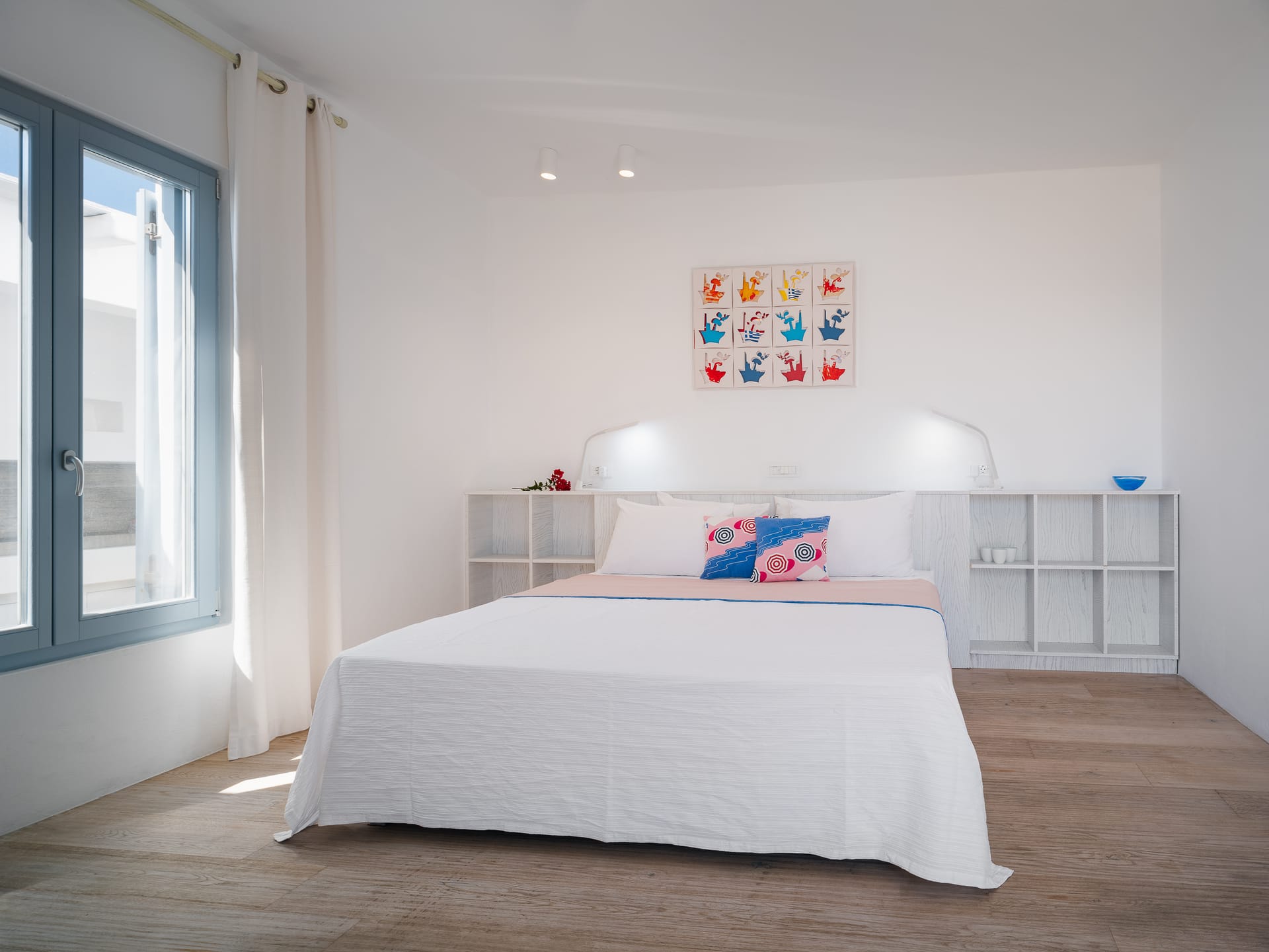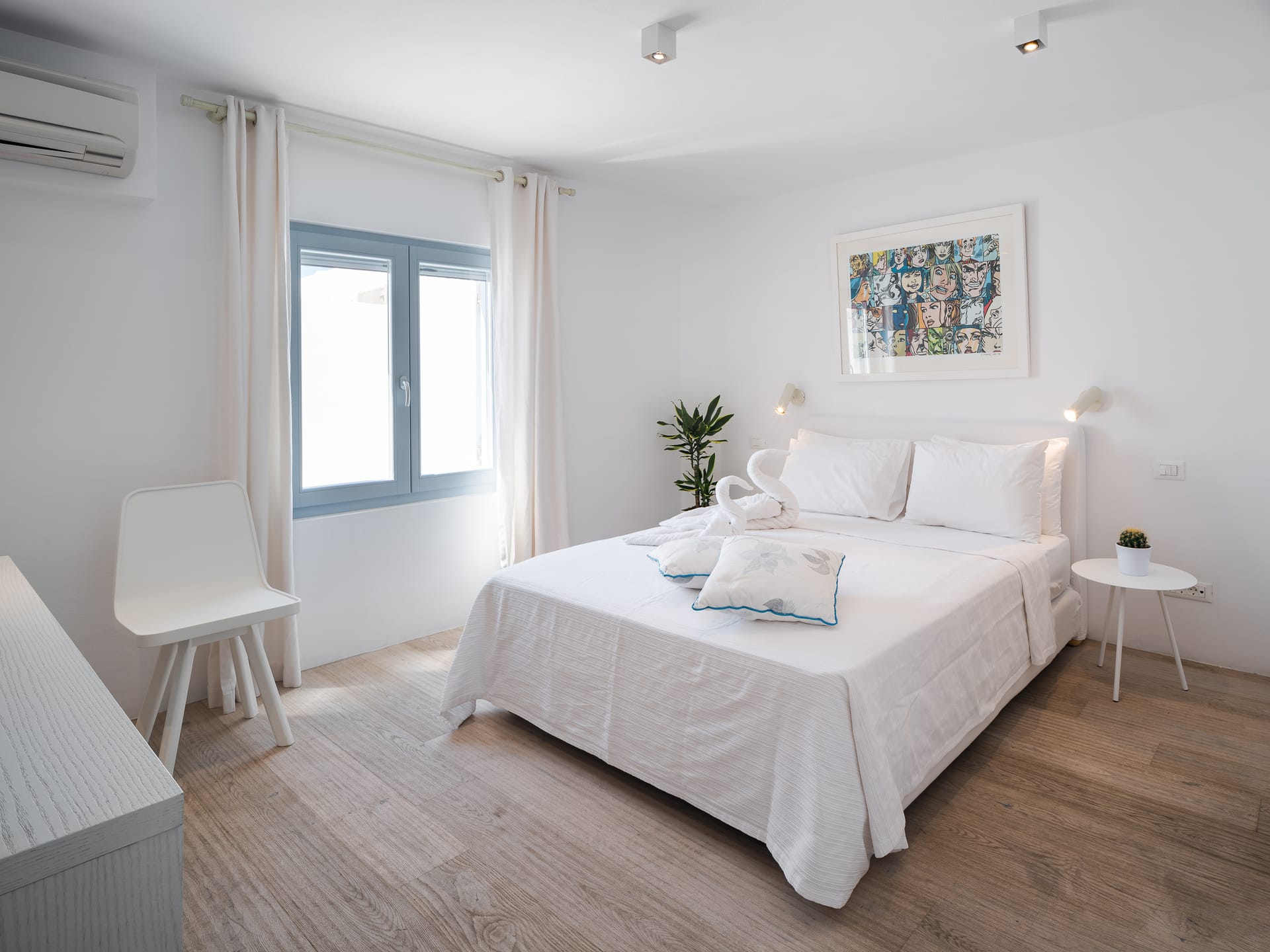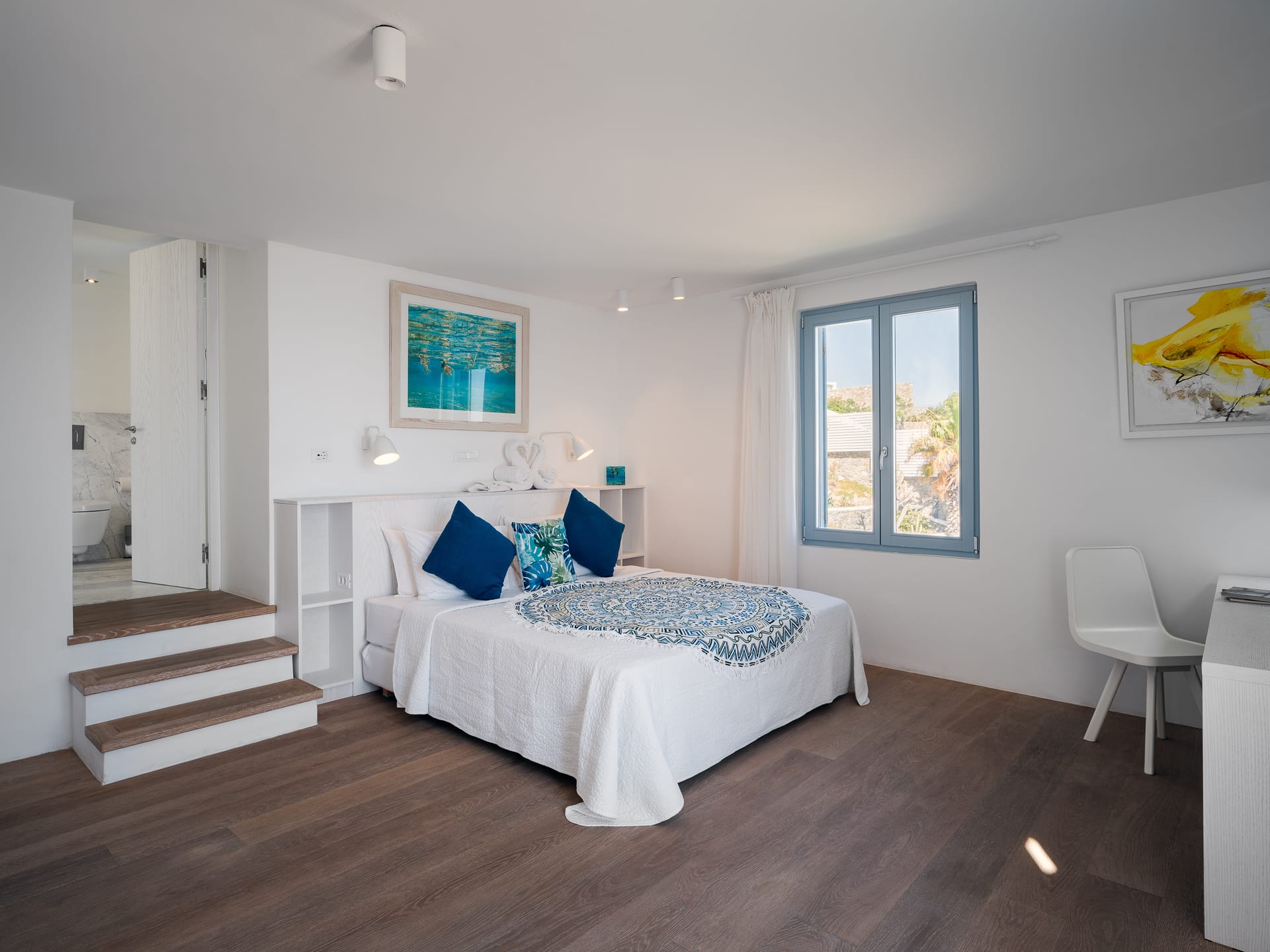 Unwind in a sunlit sanctuary that beautifully embodies Mykonian charm with its airy design and coastal-inspired décor. A luxurious king-sized bed, dressed in crisp white linens and vibrant accent pillows, invites rest and rejuvenation. A cozy sitting area and sleek writing desk provide added convenience, while large windows flood the space with natural light, offering breathtaking views and a refreshing sea breeze. Elegant artistic details and warm wooden flooring complete the welcoming ambiance, ensuring every guest feels completely at home.