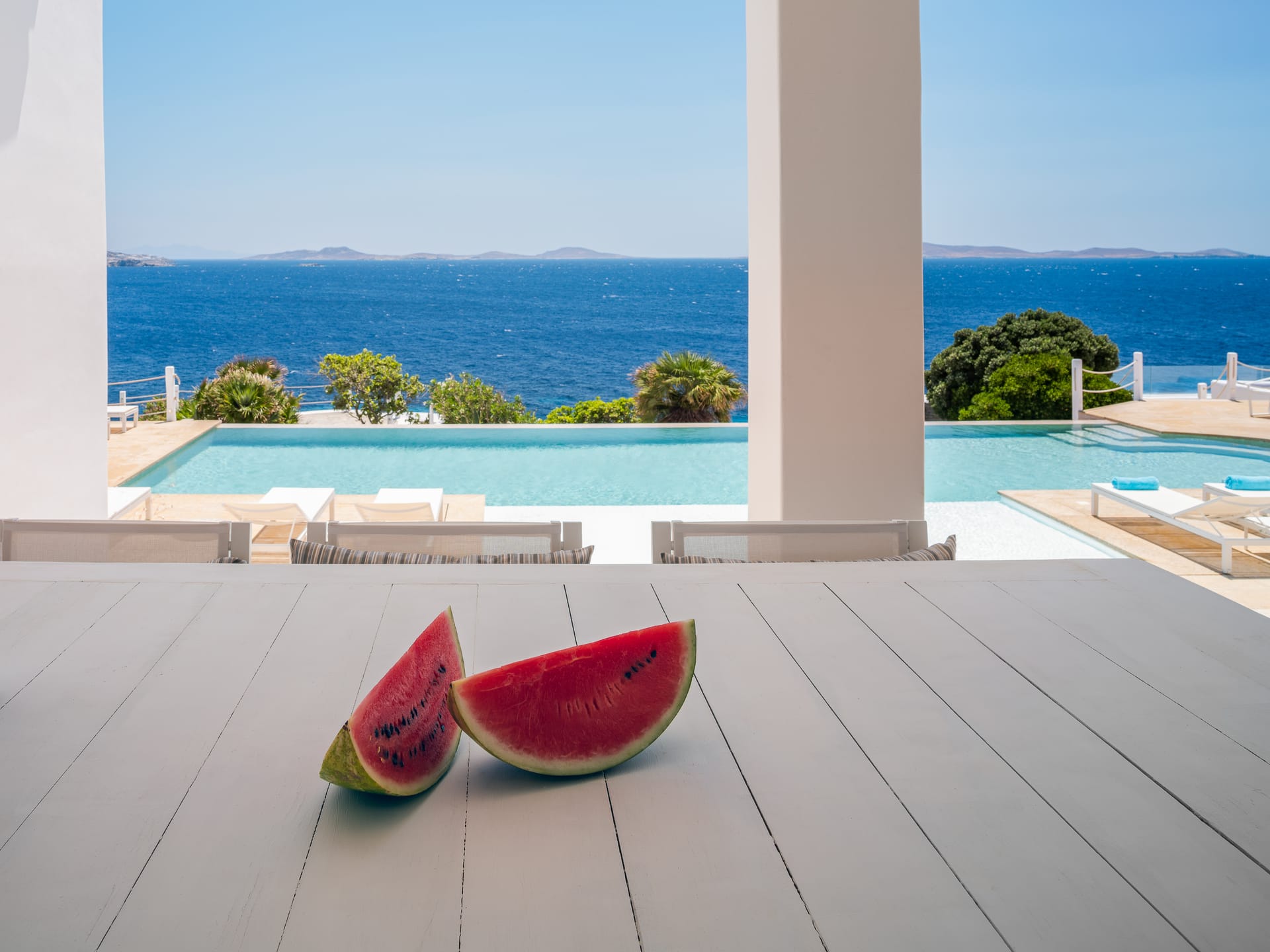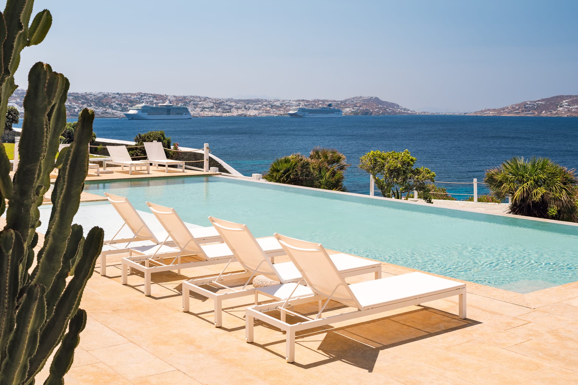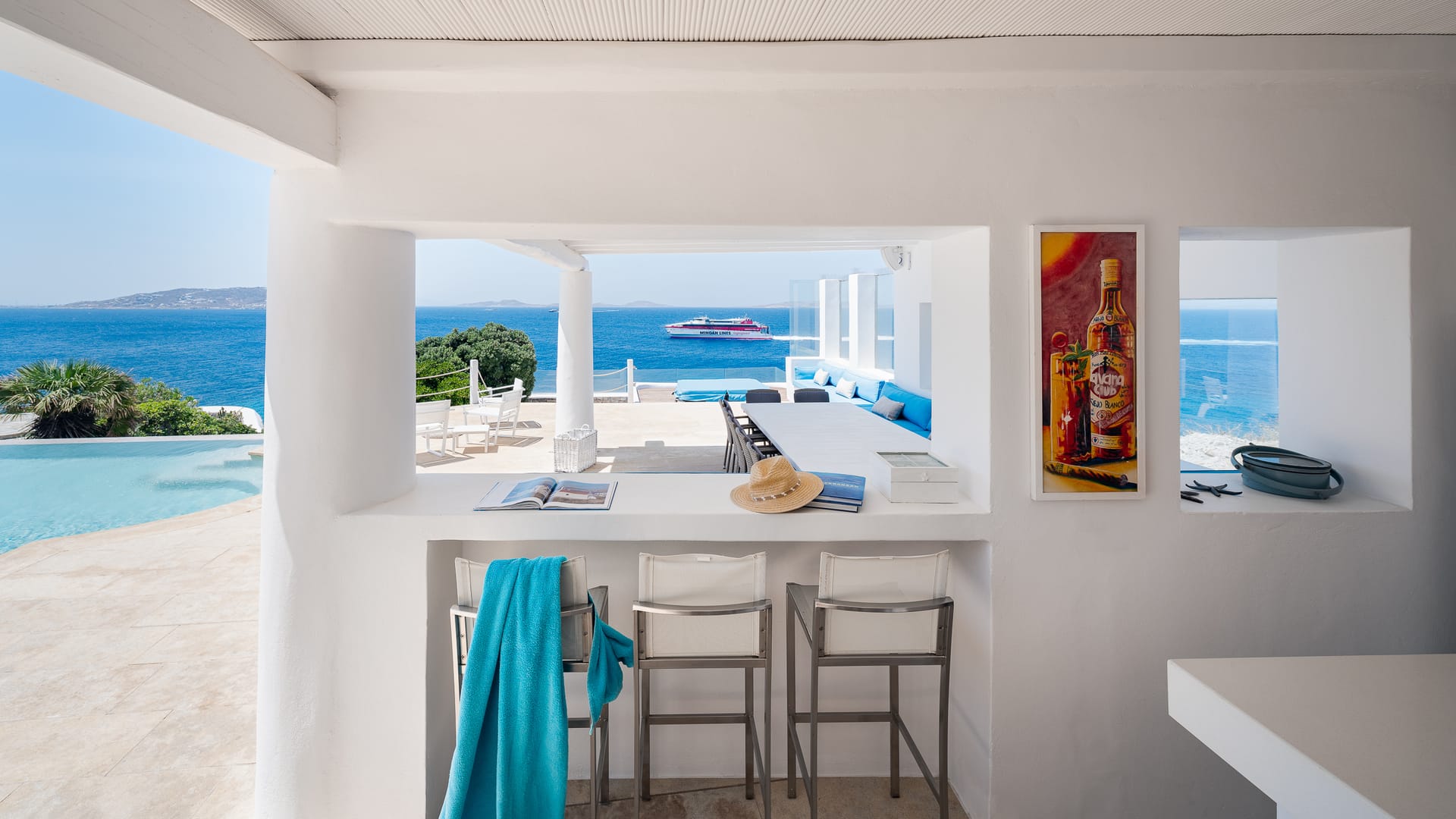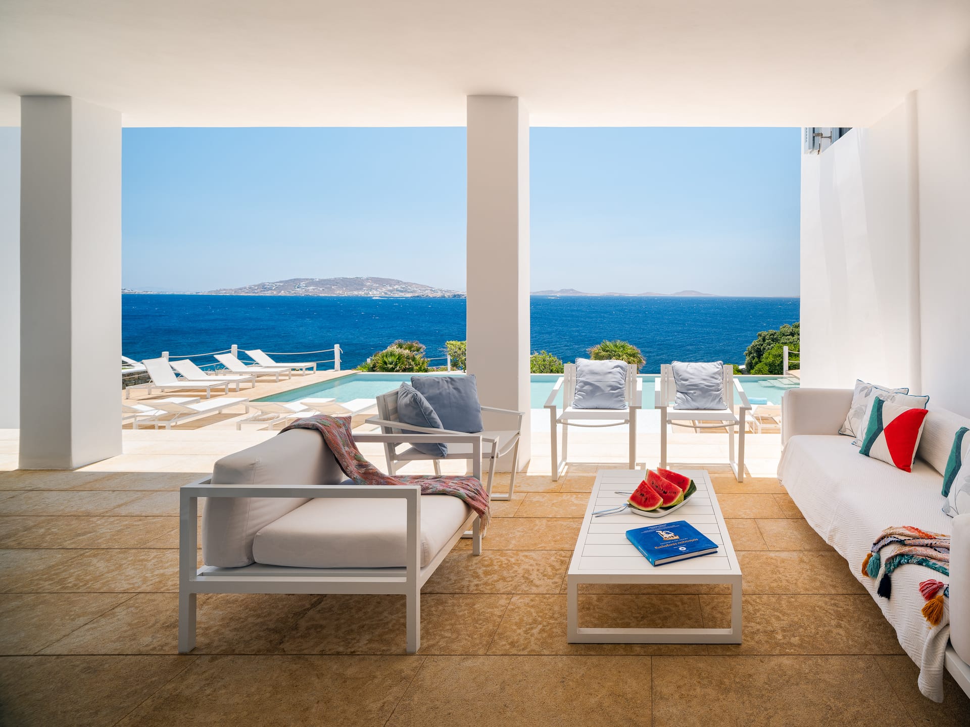 Unwind in a sunlit sanctuary that beautifully embodies Mykonian charm with its airy design and coastal-inspired décor. A luxurious king-sized bed, dressed in crisp white linens and vibrant accent pillows, invites rest and rejuvenation. A cozy sitting area and sleek writing desk provide added convenience, while large windows flood the space with natural light, offering breathtaking views and a refreshing sea breeze. Elegant artistic details and warm wooden flooring complete the welcoming ambiance, ensuring every guest feels completely at home.