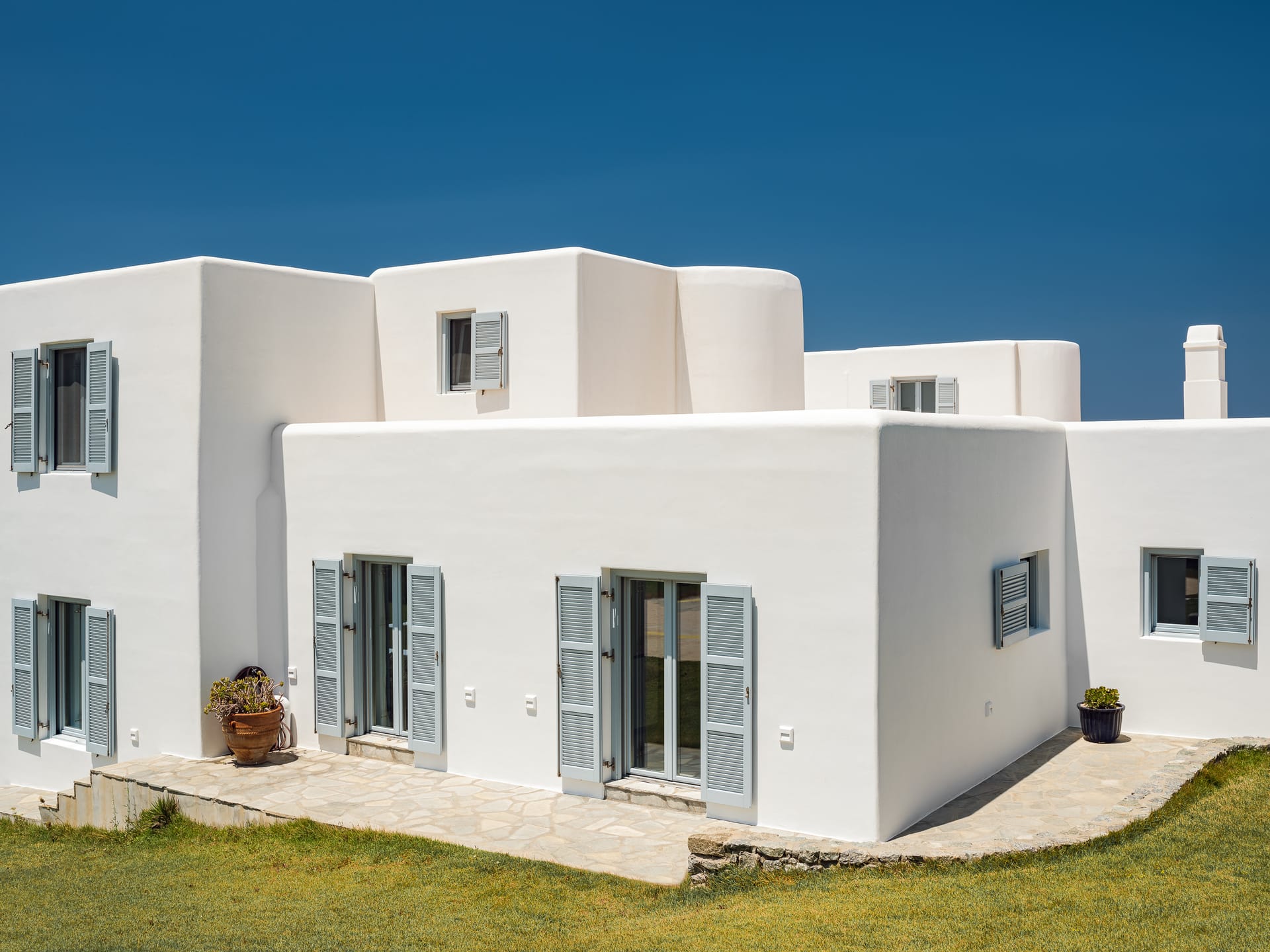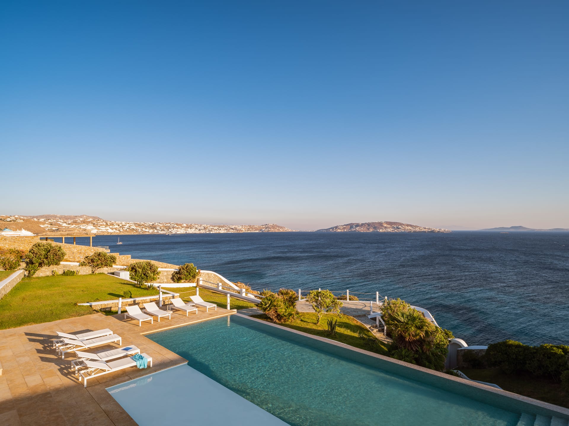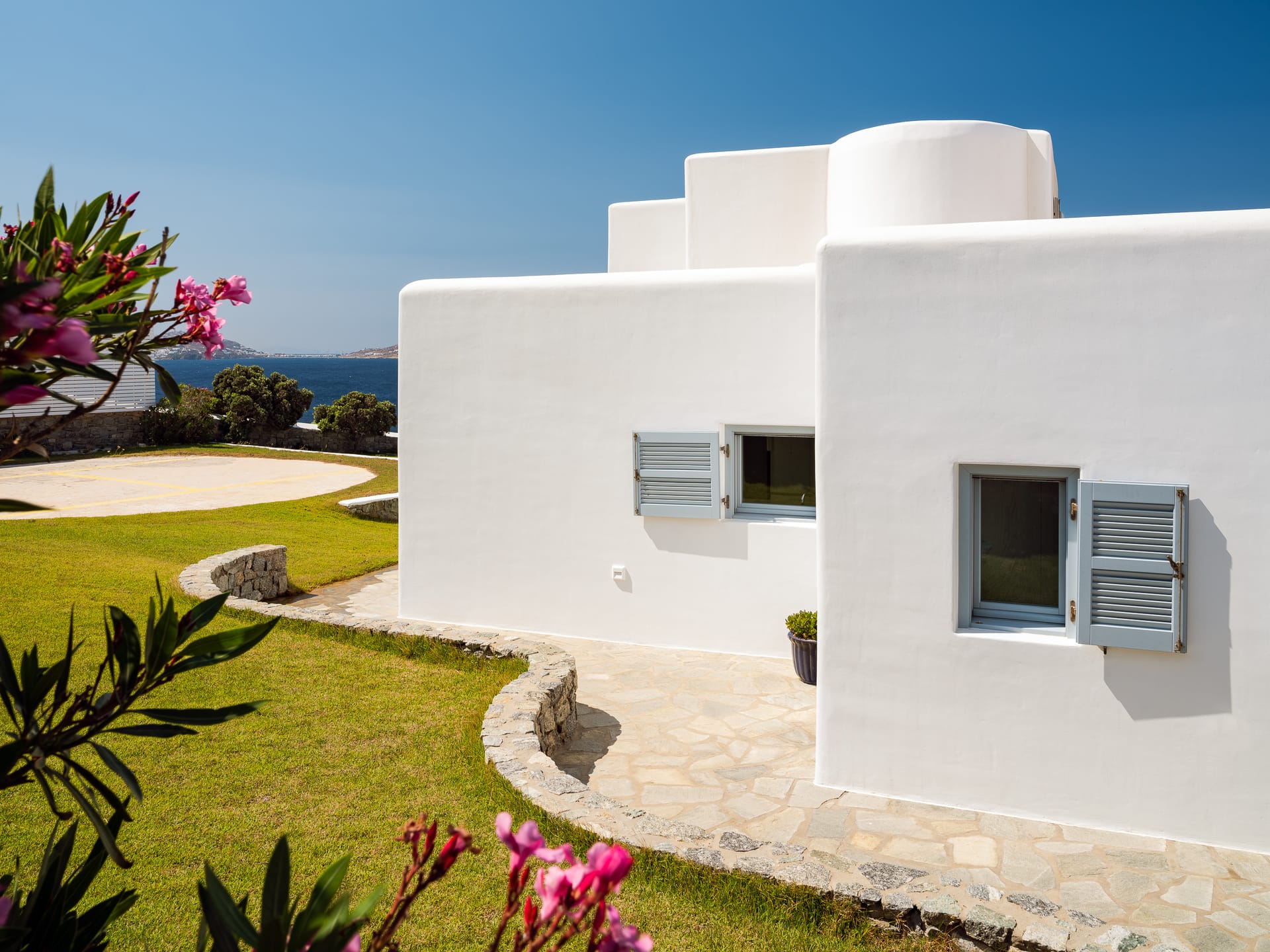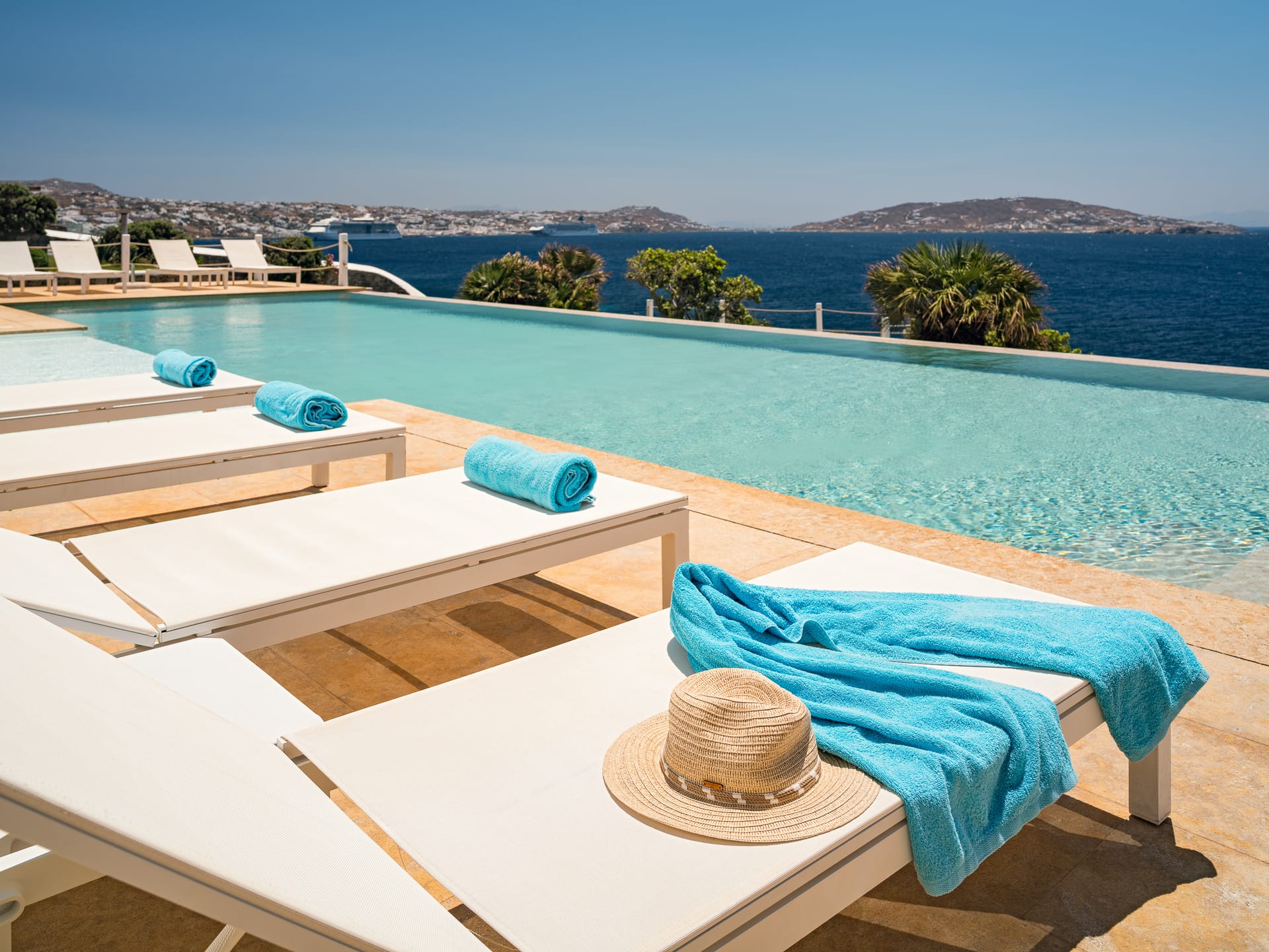 Unwind in a sunlit sanctuary that beautifully embodies Mykonian charm with its airy design and coastal-inspired décor. A luxurious king-sized bed, dressed in crisp white linens and vibrant accent pillows, invites rest and rejuvenation. A cozy sitting area and sleek writing desk provide added convenience, while large windows flood the space with natural light, offering breathtaking views and a refreshing sea breeze. Elegant artistic details and warm wooden flooring complete the welcoming ambiance, ensuring every guest feels completely at home.